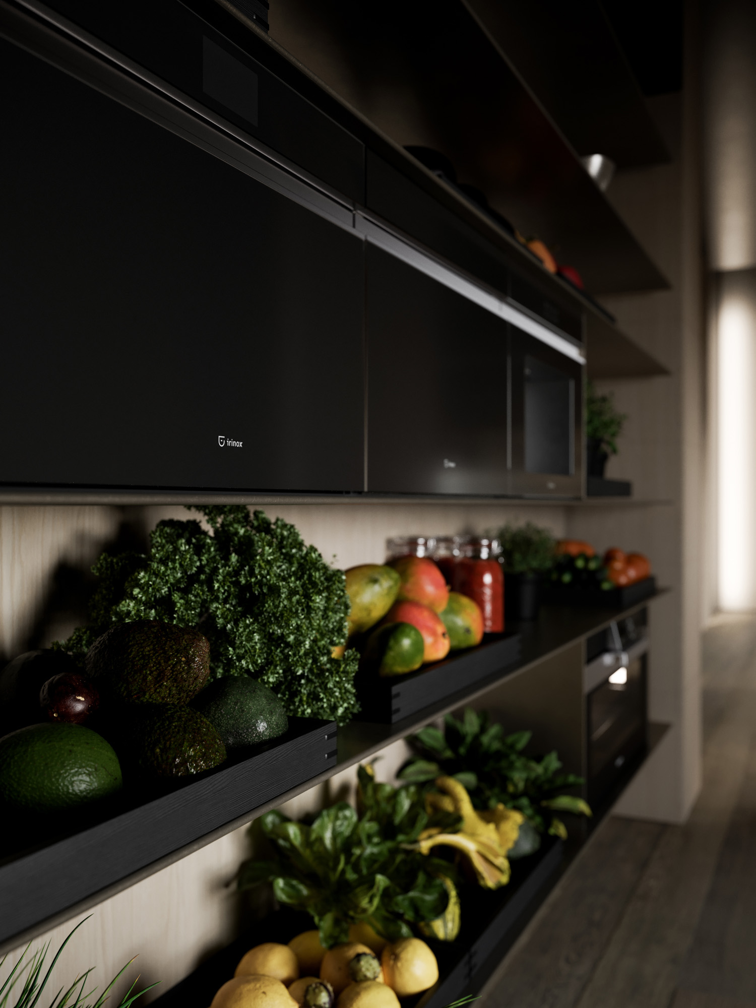 Un luogo pensato per chi vive la cucina come gesto quotidiano e materia viva. La cucina prende forma attraverso il sistema Vertical e il programma Skill in Peltrox, dove l’acciaio si esprime tra superficie e profondità. La parete diventa strumento: mensole, forni, oggetti. Elementi esposti, pronti, accessibili. Una dispensa visiva che restituisce alla cucina il suo carattere più autentico.