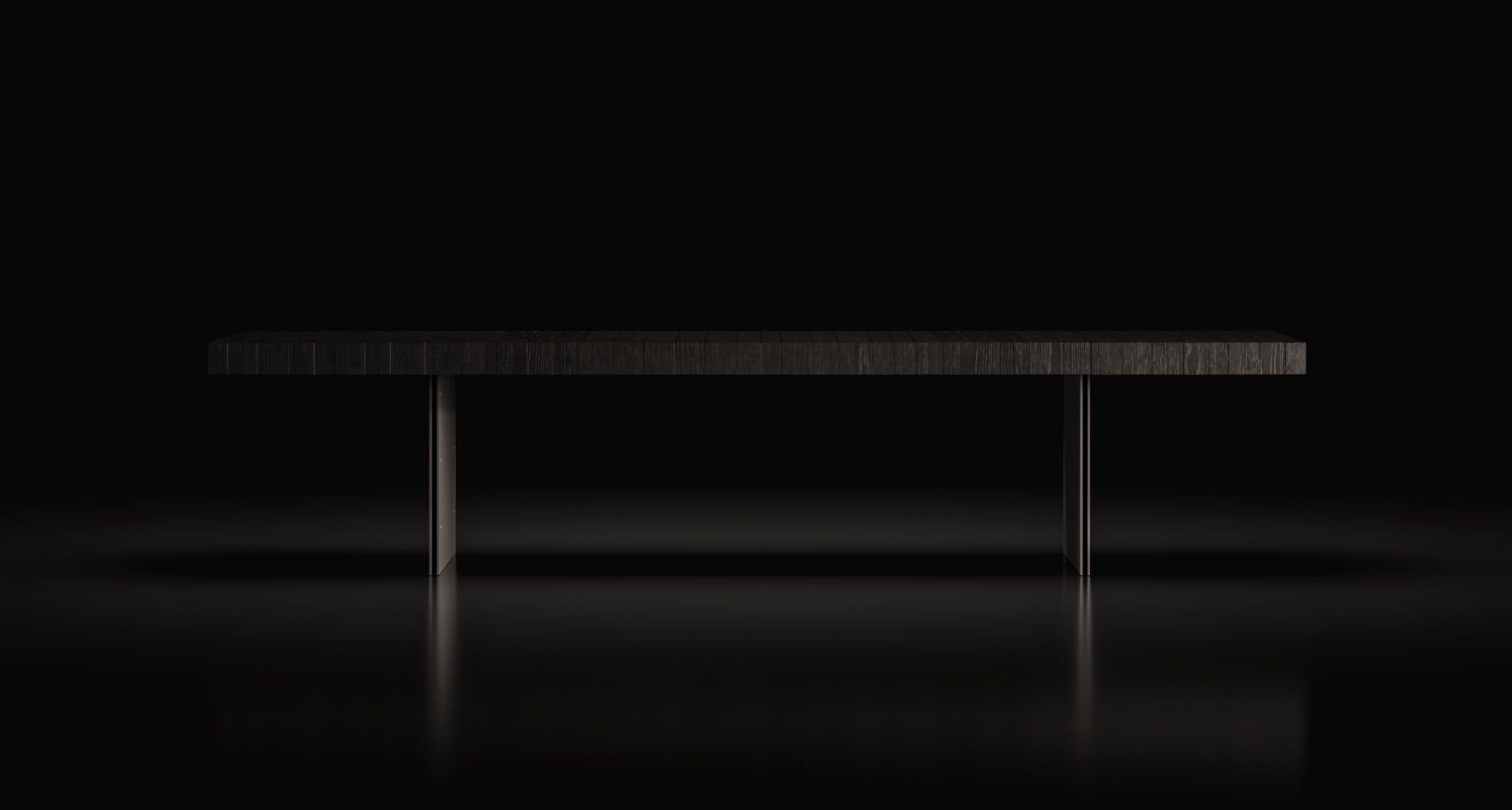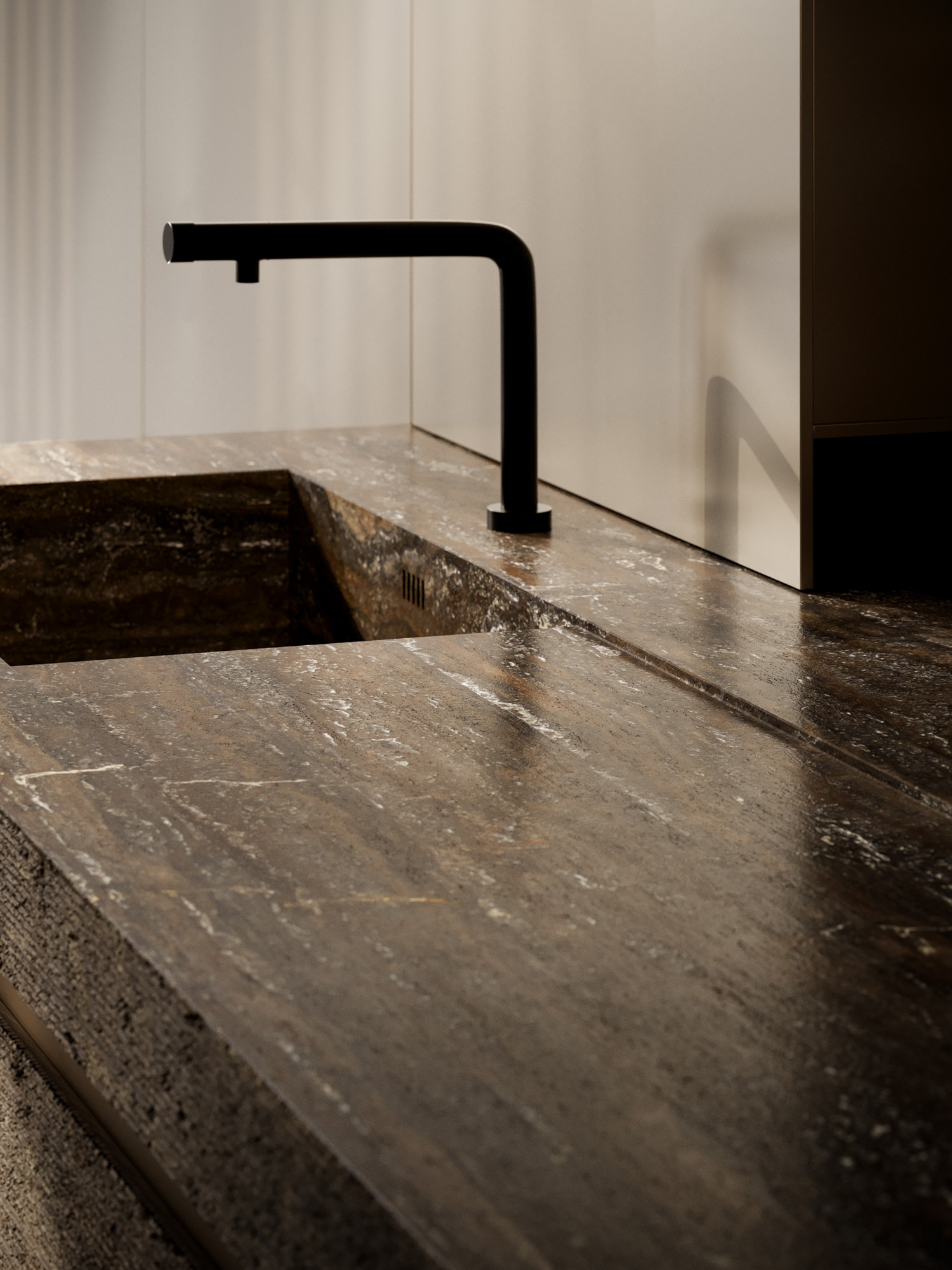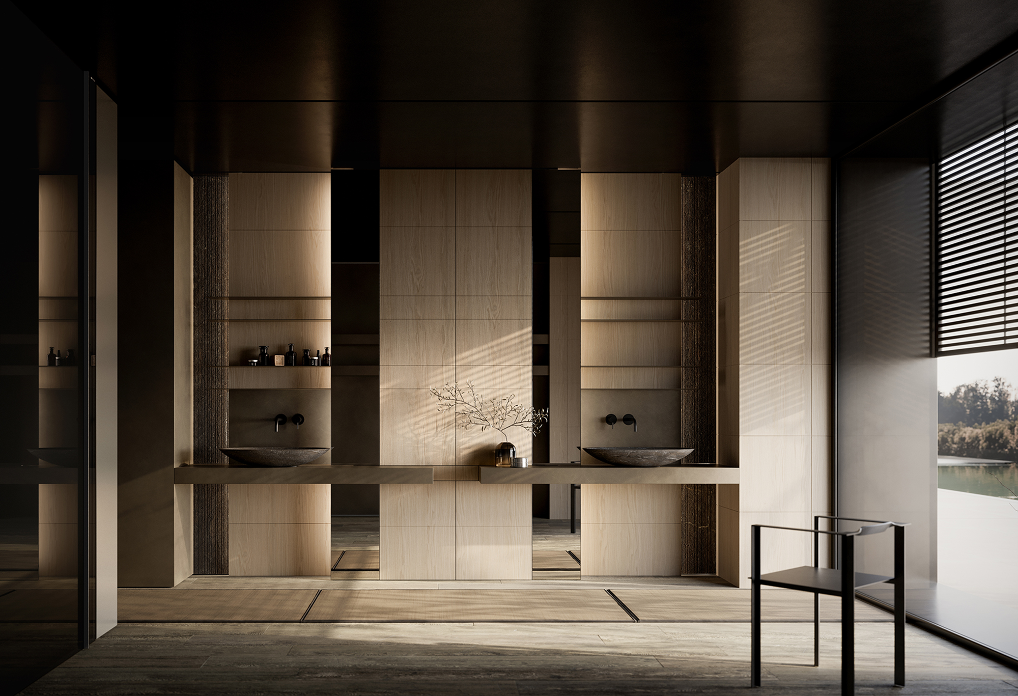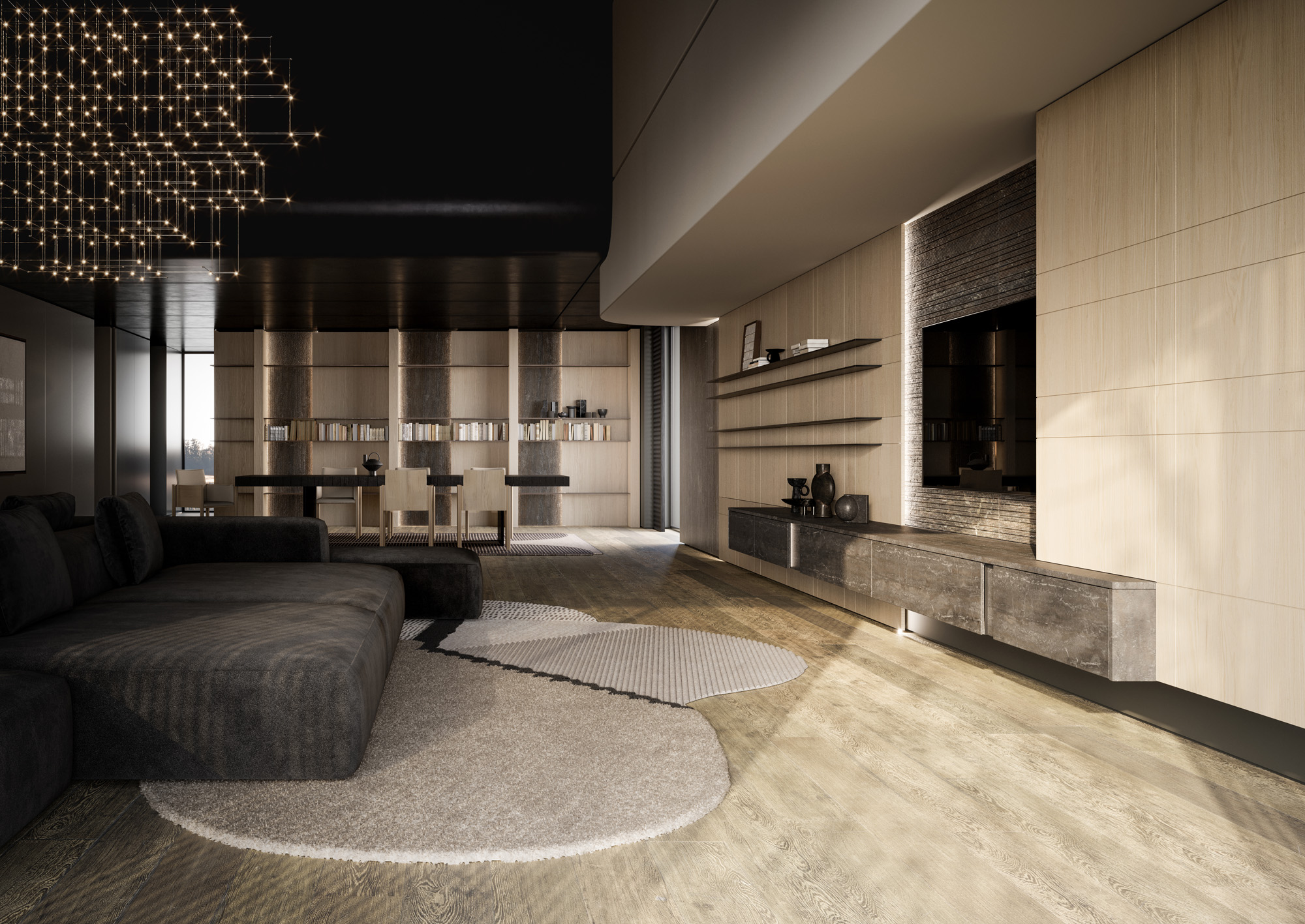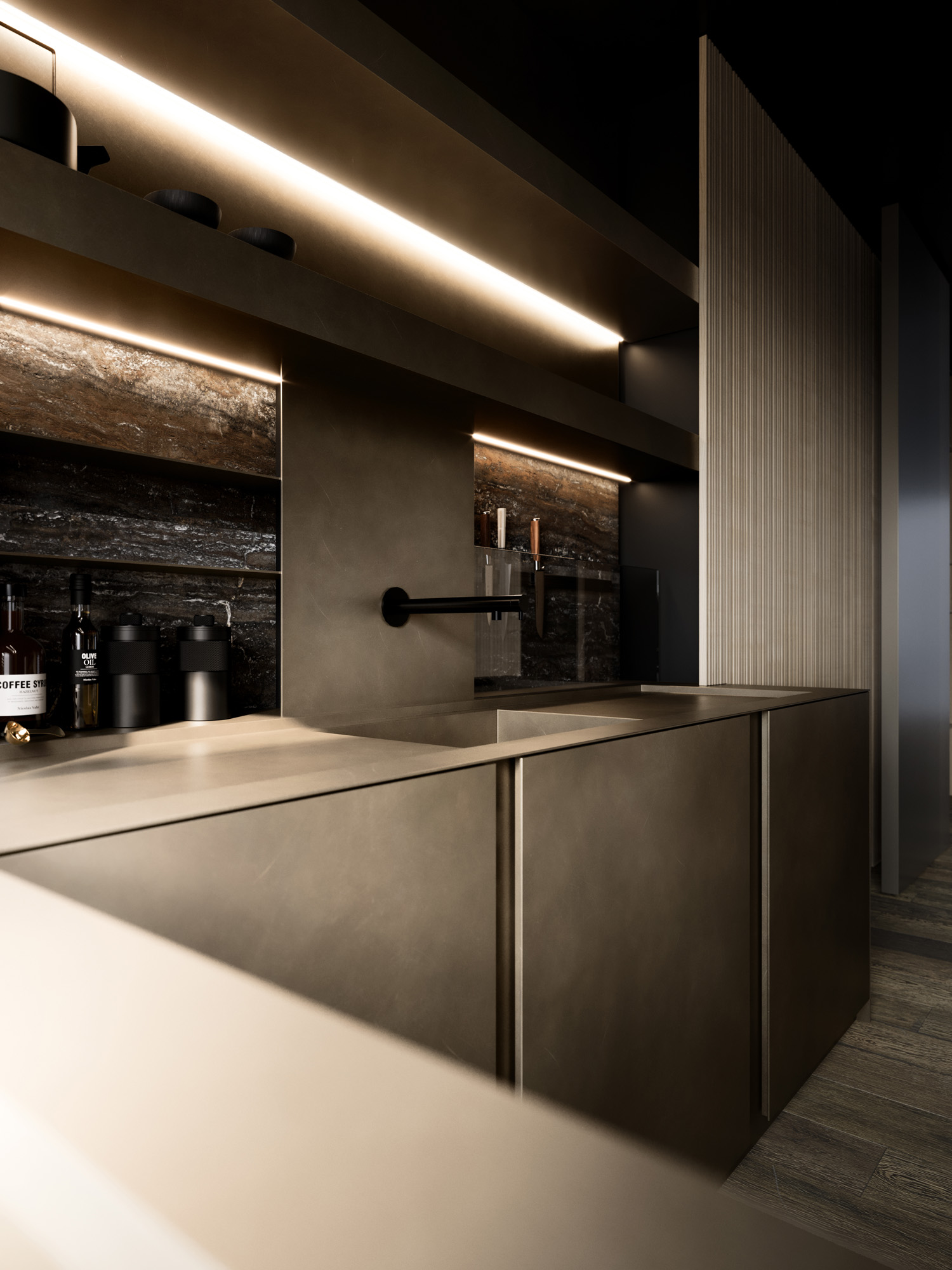 La continuità percorre gli ambienti, connette legni, metalli, vetri e pietre in una sequenza cromatica calibrata di superfici opache, riflettenti e stratificate.