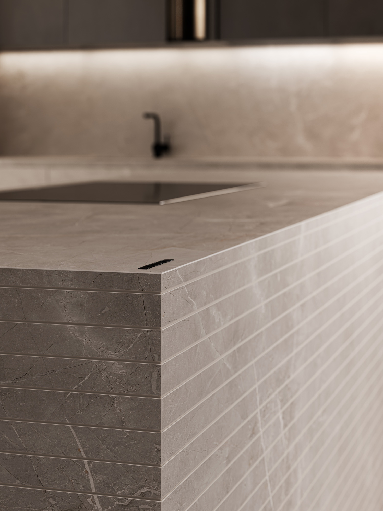 In appoggio alle basi la nuova penisola Waterfall, spessore 6 mm. Un’unica lastra in metallo goffrato e materico che riprende la finitura Metal delle basi, con un raggio di curvatura di 15 cm.