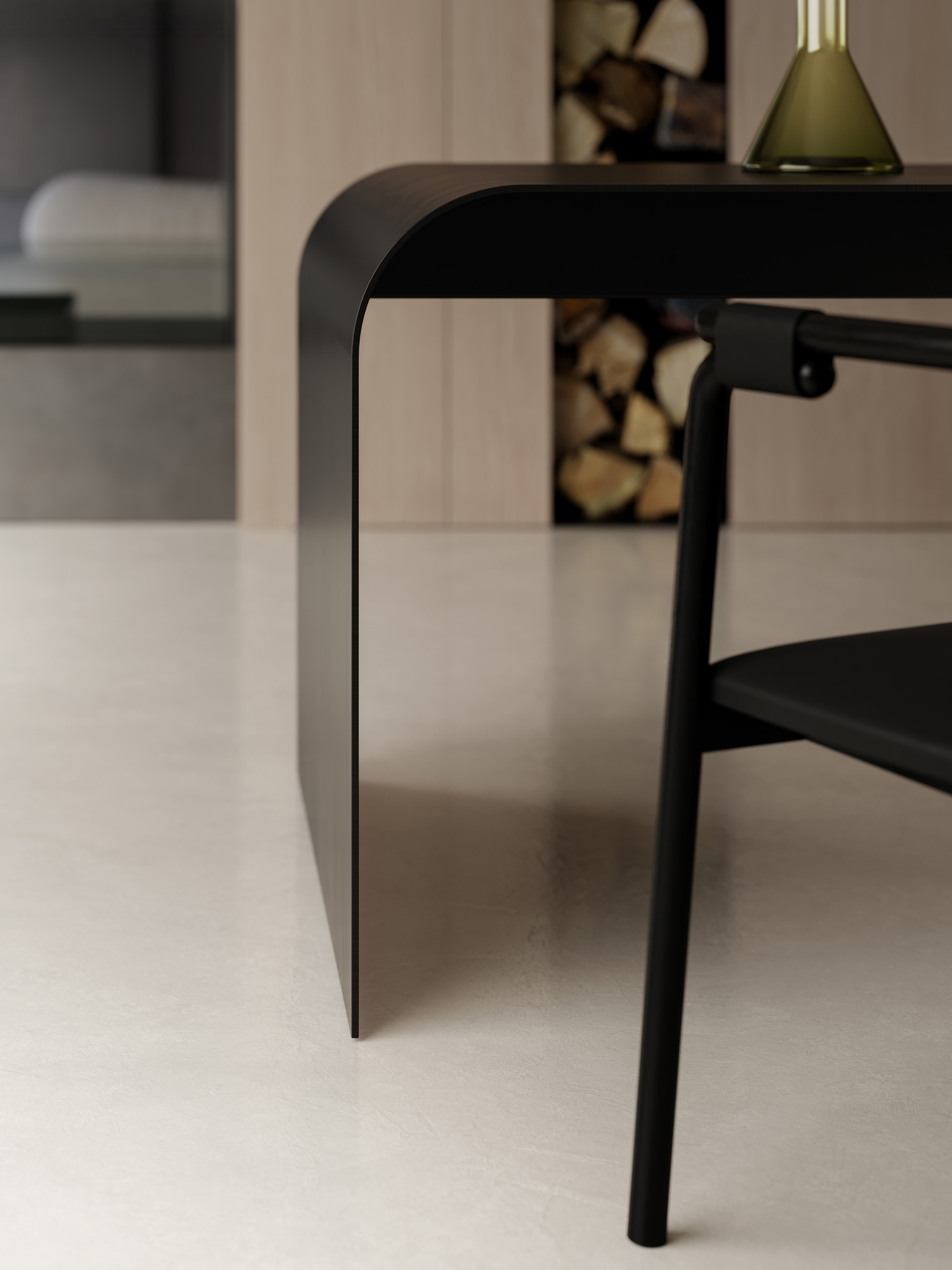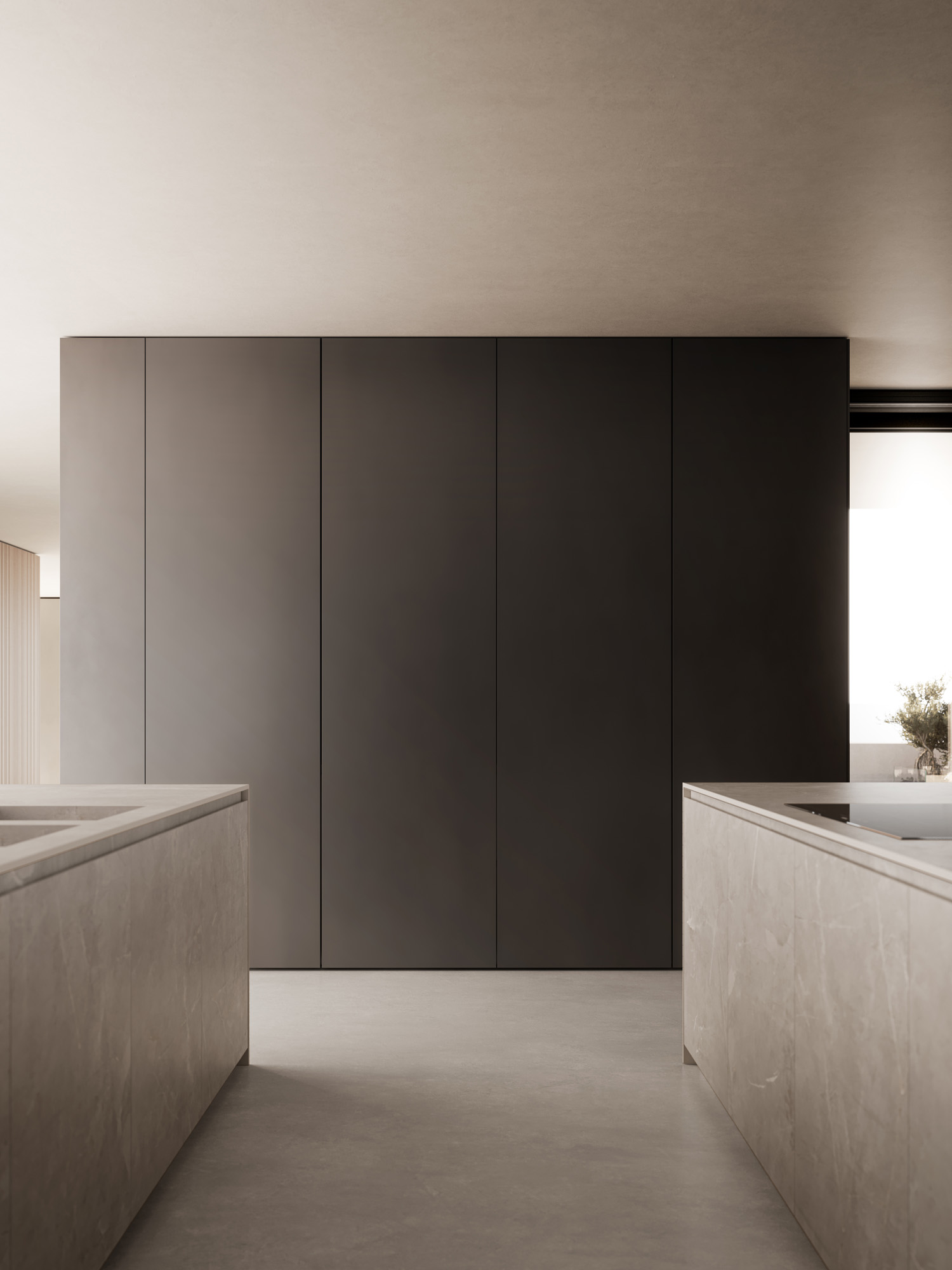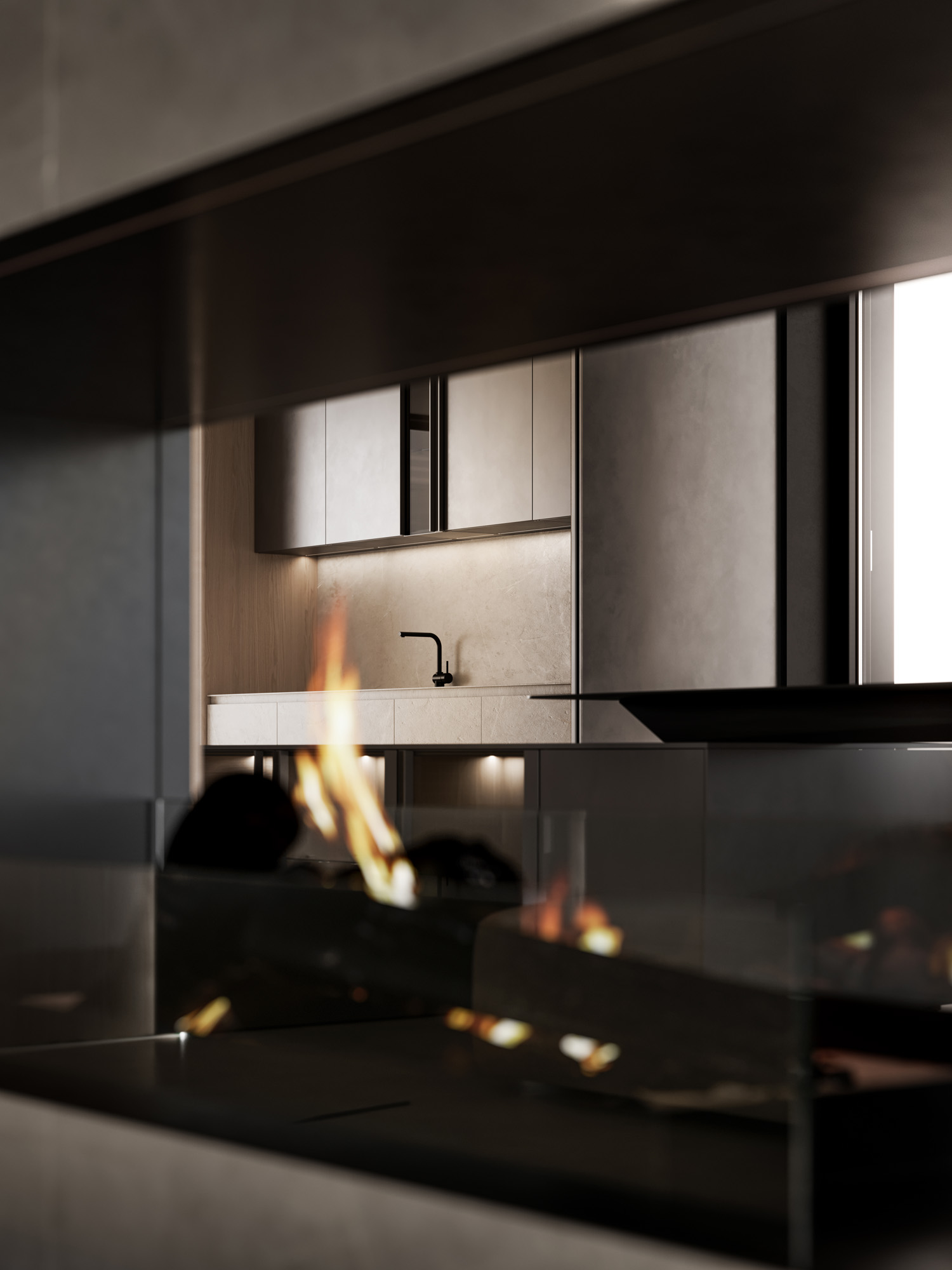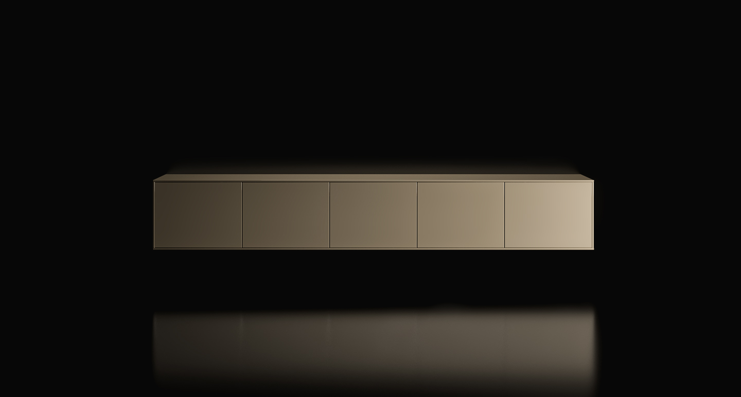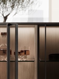 La continuazione dell’isola è definita da basi ribassate in laccato Metal Anthracite, con scocca interna in noce Brown e ante Glass, dove la superficie piena e trasparente, priva di profili, costruisce una continuità fluida tra pieni e vuoti. Il vetro come l’acqua, assorbe i riflessi e dissolve i confini, estendendo lo spazio in una percezione più profonda e silenziosa.