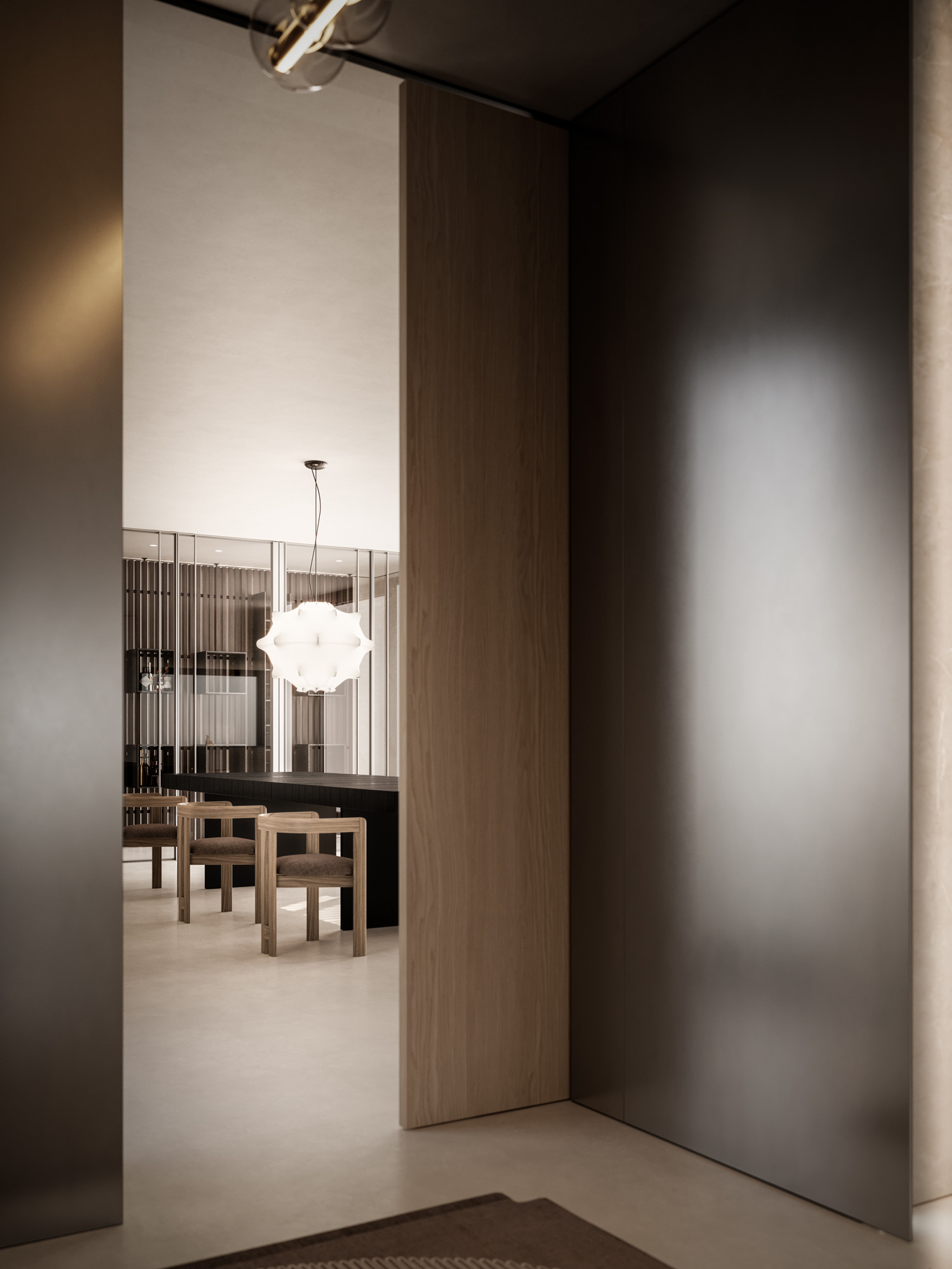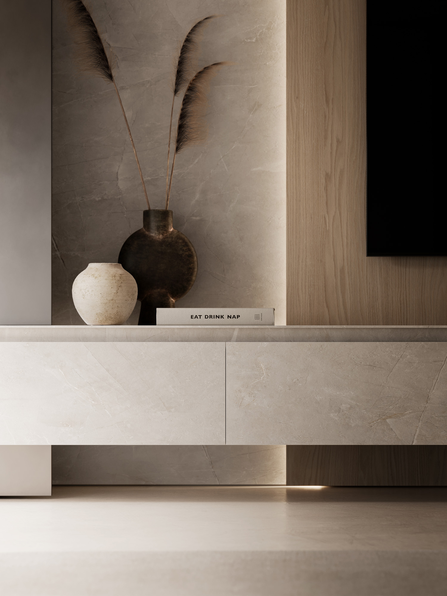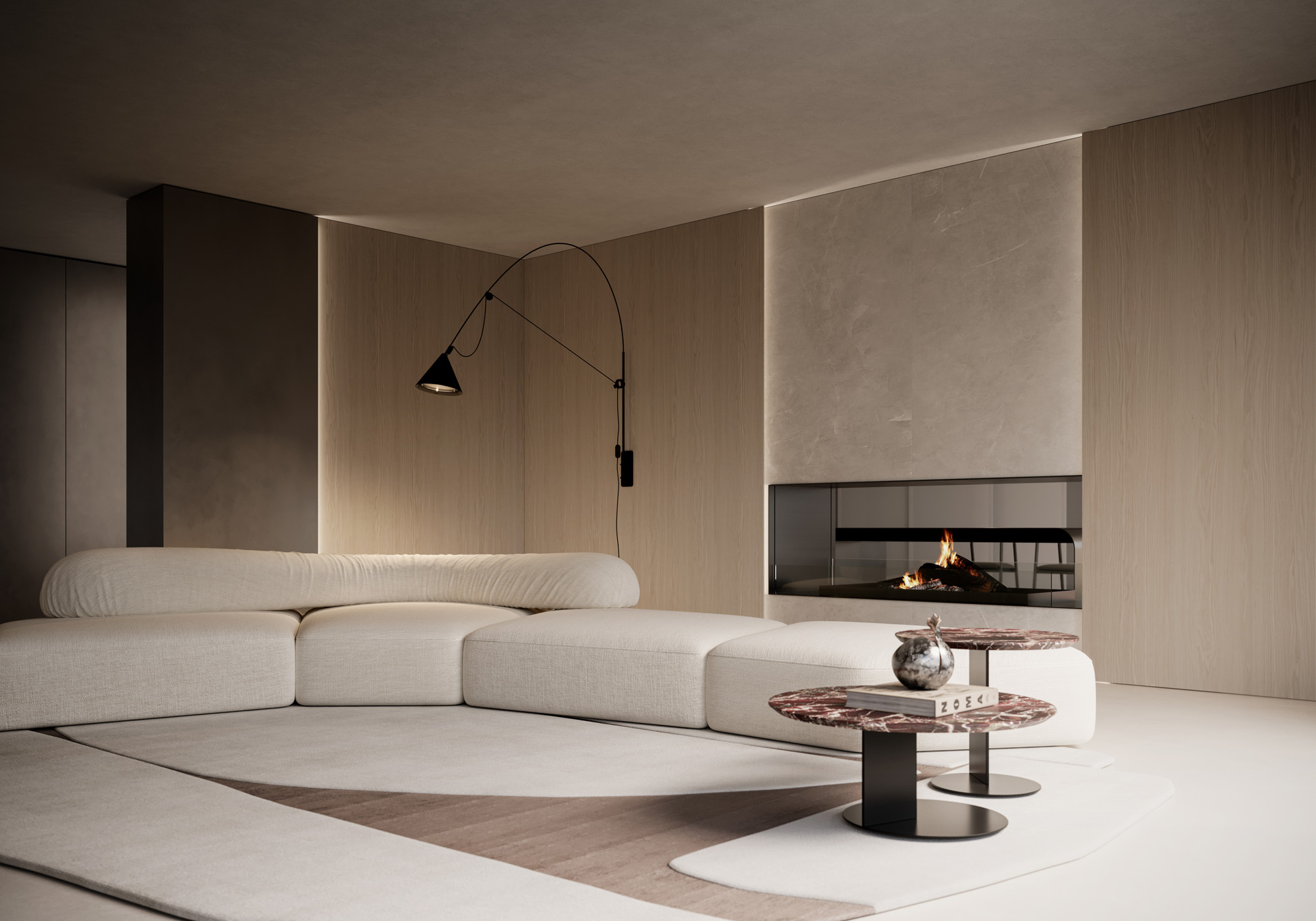 La luce scorre radente lungo la materia, ne rivela la tridimensionalità e definisce l’atmosfera. L’ambiente si trasforma in un’esperienza percettiva, dove design materia e luce costruiscono una dimensione emozionale.