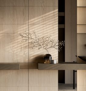 Legni, metalli, vetri e pietre si connettono in una sequenza cromatica calibrata di superfici opache, riflettenti e stratificate.