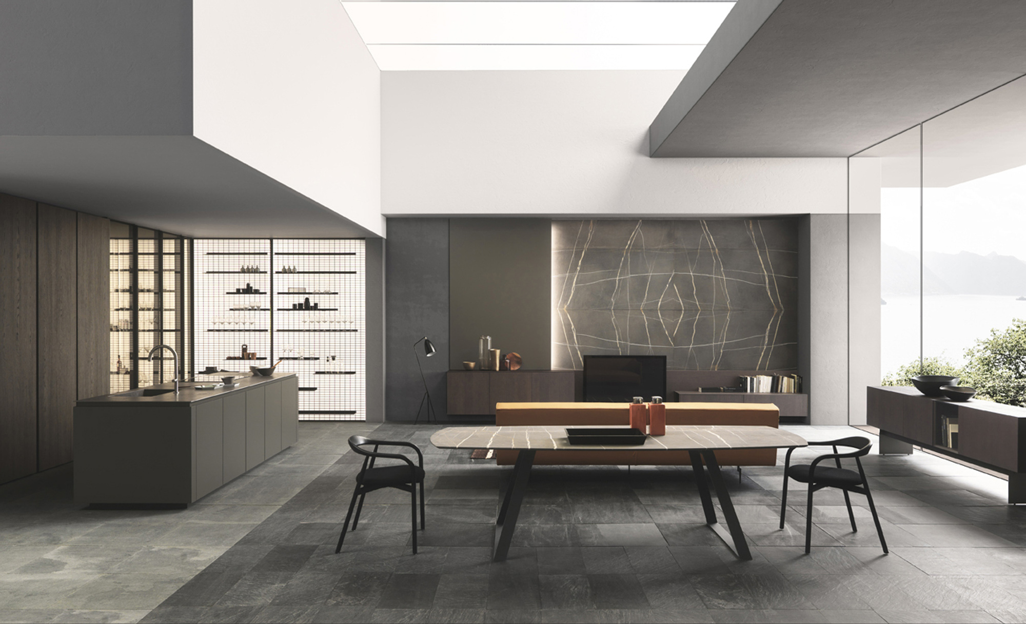 Il basamento in metallo rimane invariato, mentre il piano è personalizzabile in gres e marmi Modulnova, mantenendo la stessa libertà materica del progetto.