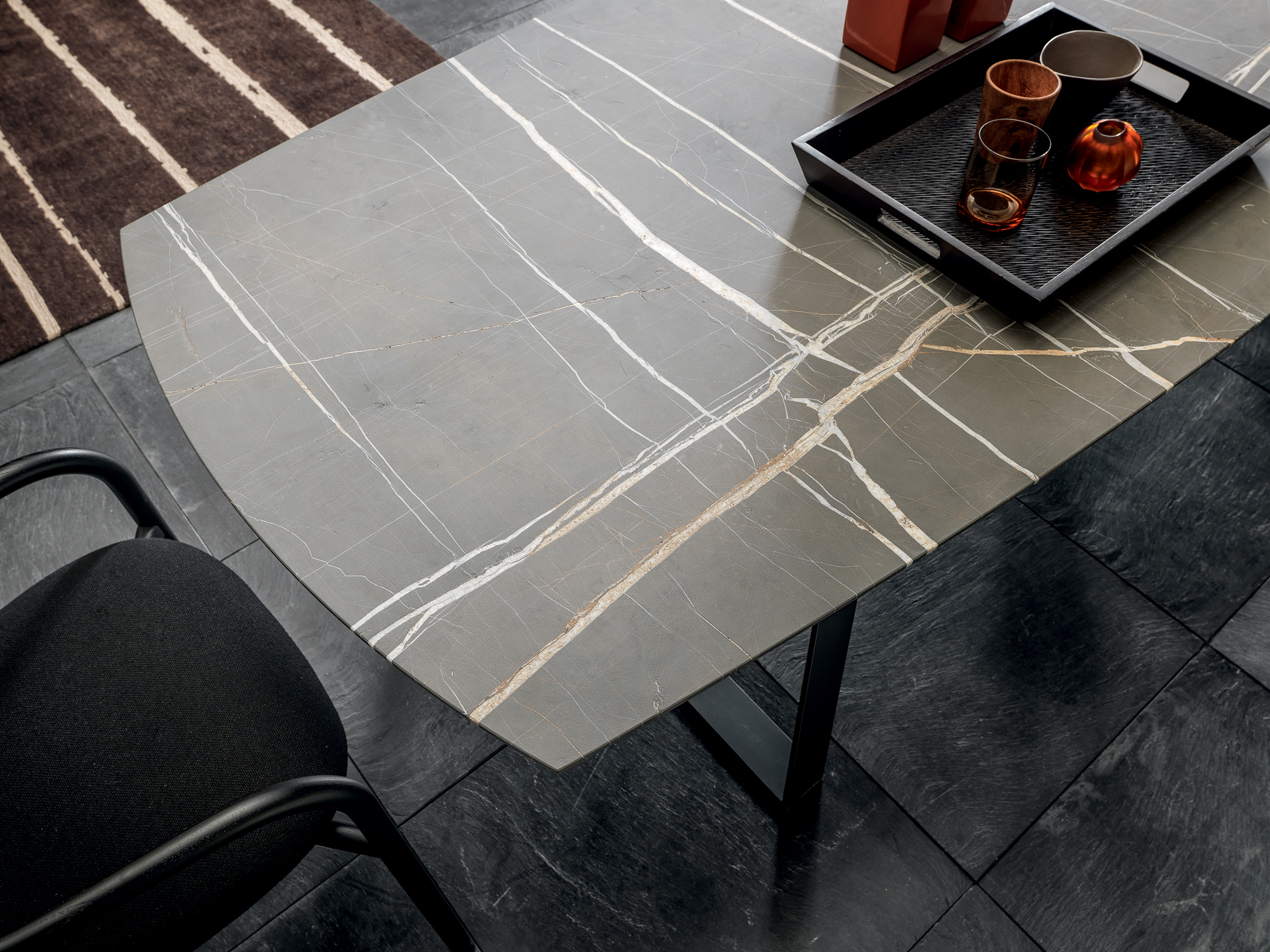 I piani del tavolo Blade sono disponibili in gres sp. 1,4 cm e in marmo, granito e pietra sp. 2 cm.