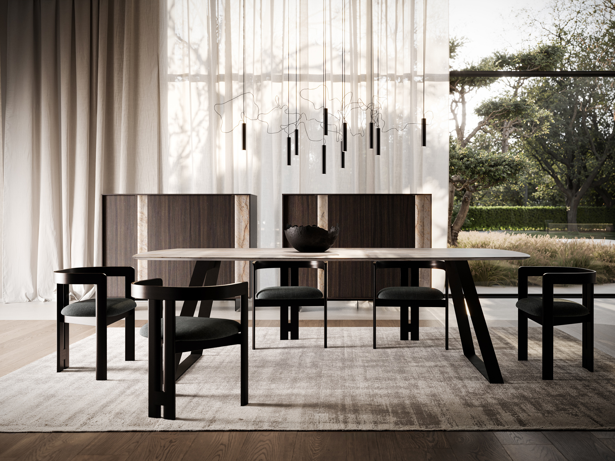 Il tavolo Blade Boat in pietra Sahara Noir Raw, nella versione sabbiata, esprime una matericità intensa.La superficie opaca mette in risalto la profondità della pietra e il suo disegno naturale, definendo una presenza scultorea e misurata.