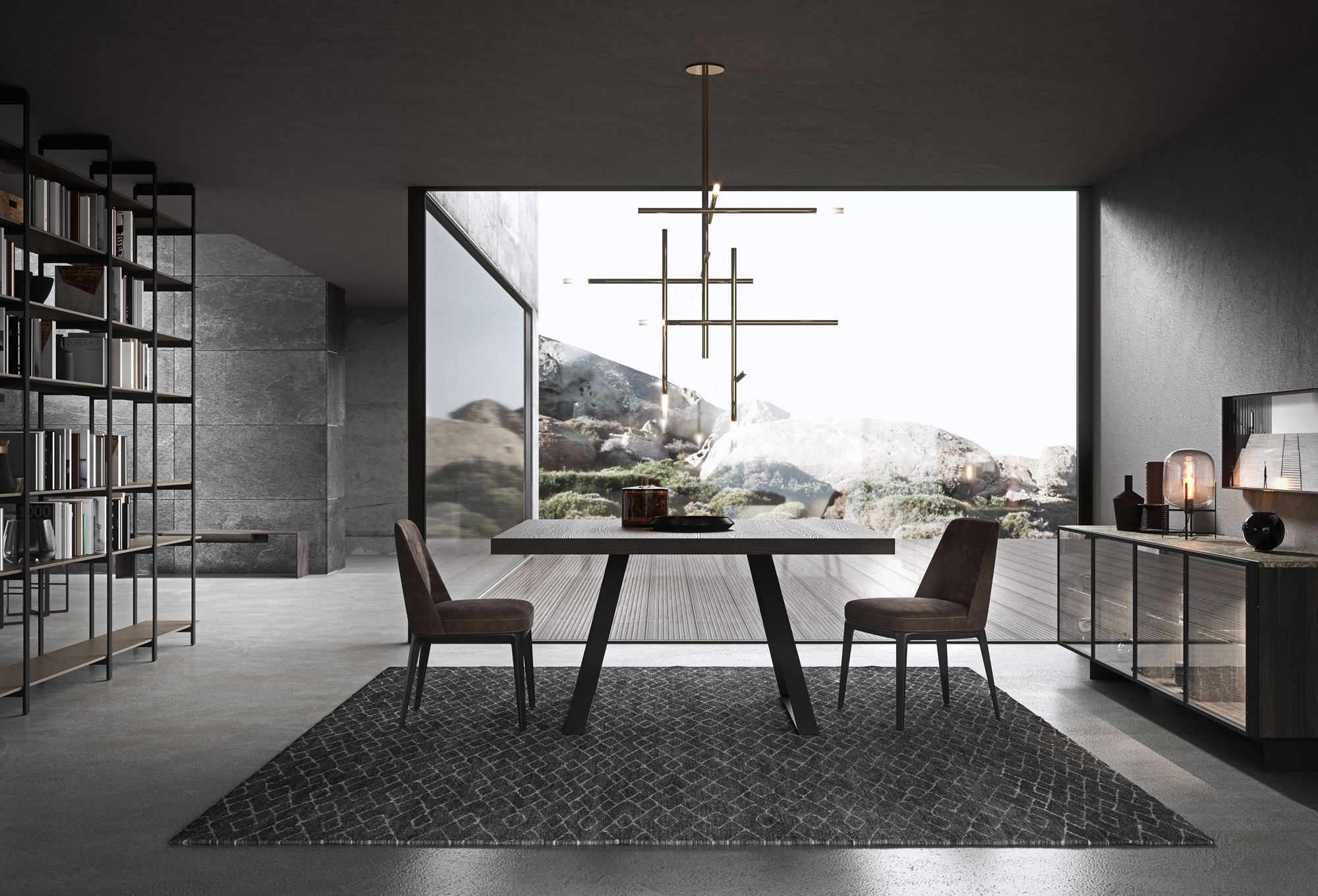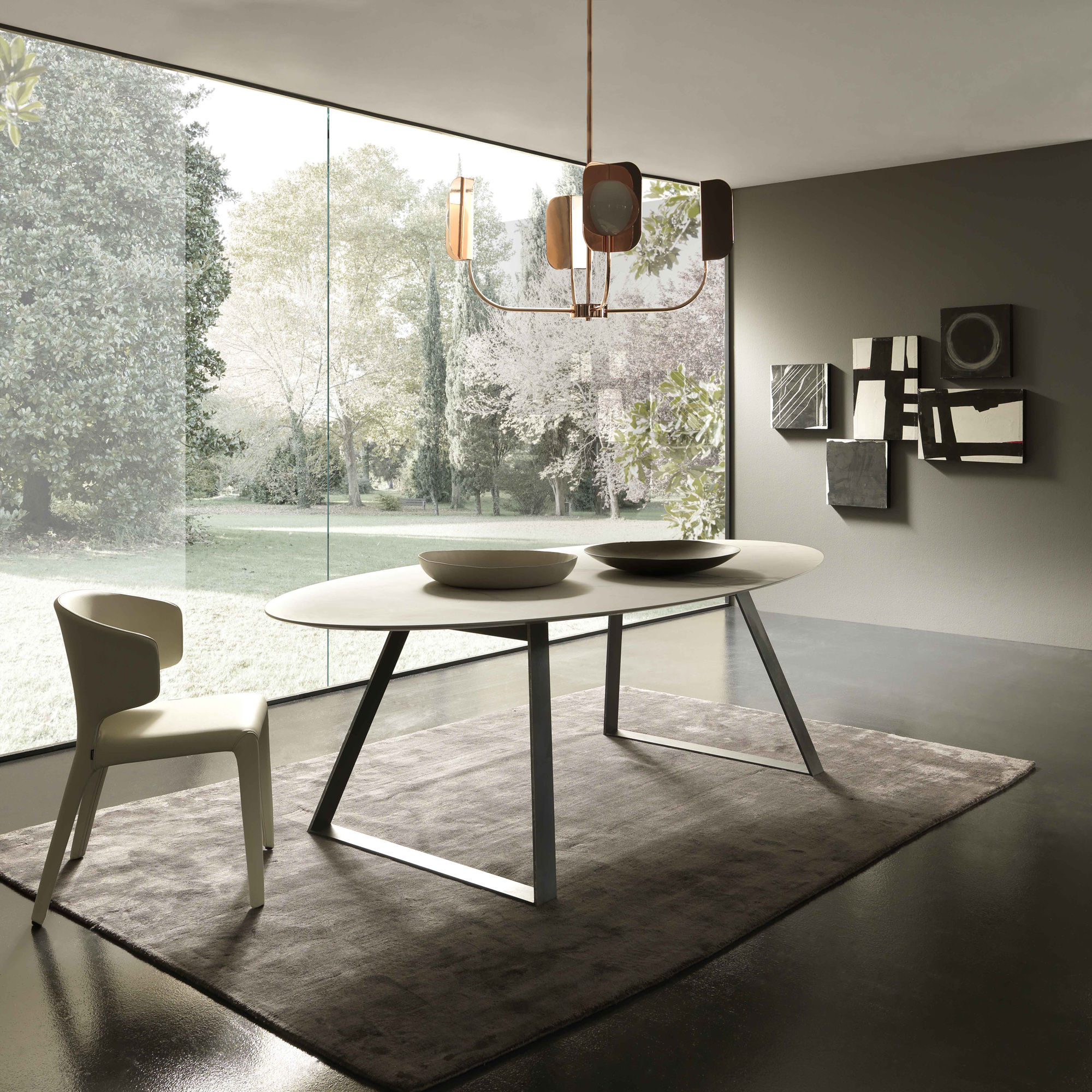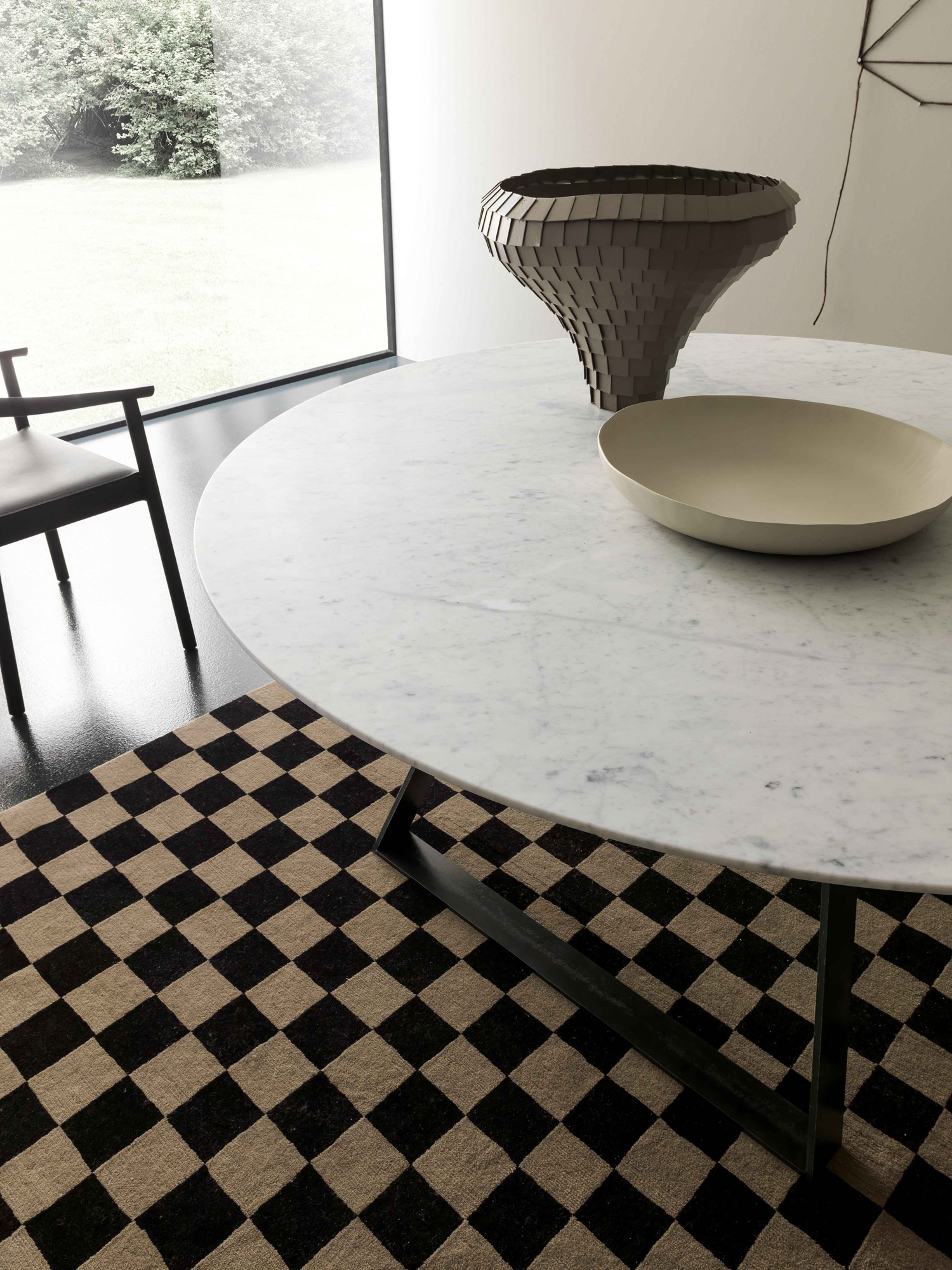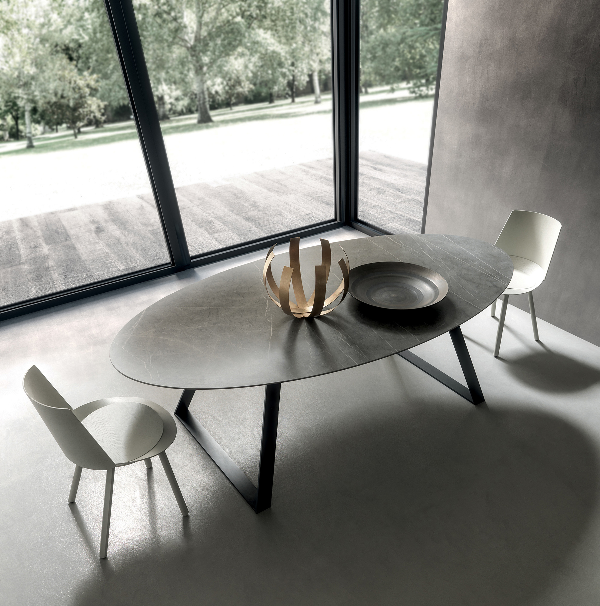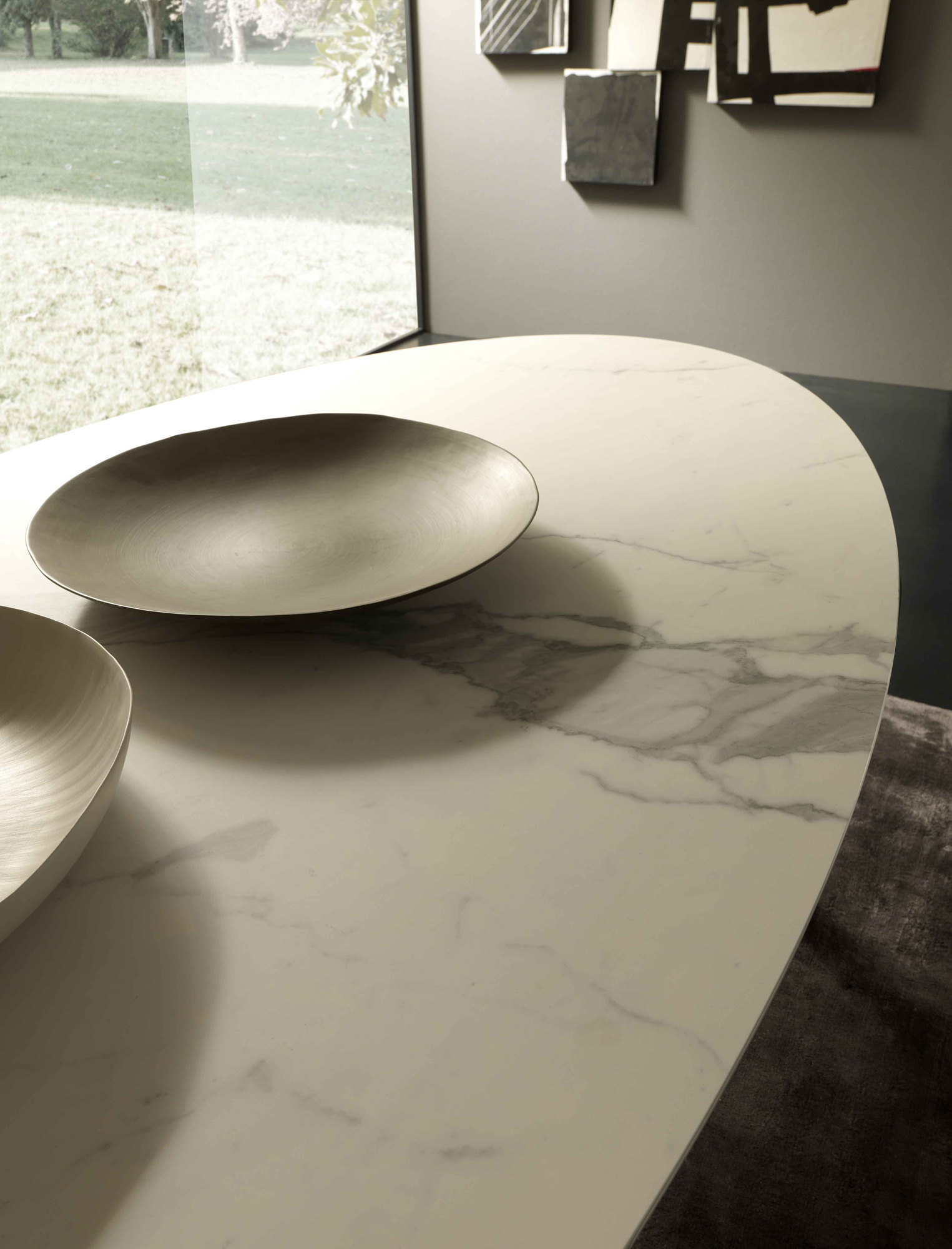 Il tavolo Blade è disponibile con piano rotondo, quadrato, ovale, rettangolare e nella versione Boat. Il piano può essere realizzato in gres, marmo, pietra o granito, mentre la struttura è proposta in metallo verniciato nero.