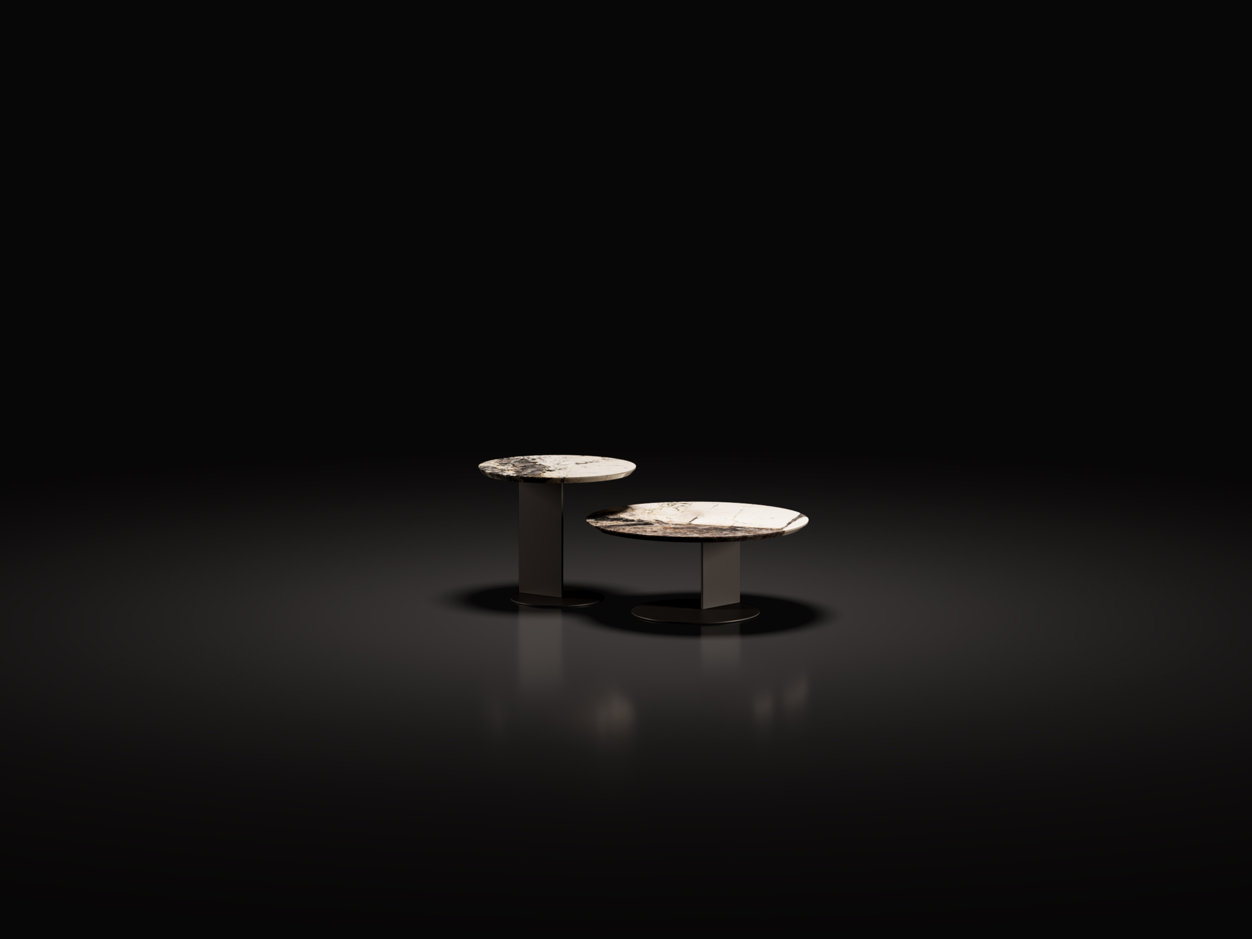 Configurabili in diversi materiali, altezze e diametri, sono definiti da un piano in pietra o gres e da un basamento strutturale in ferro trasparente pigmentato nero.