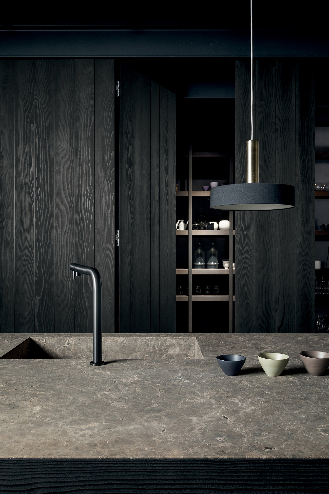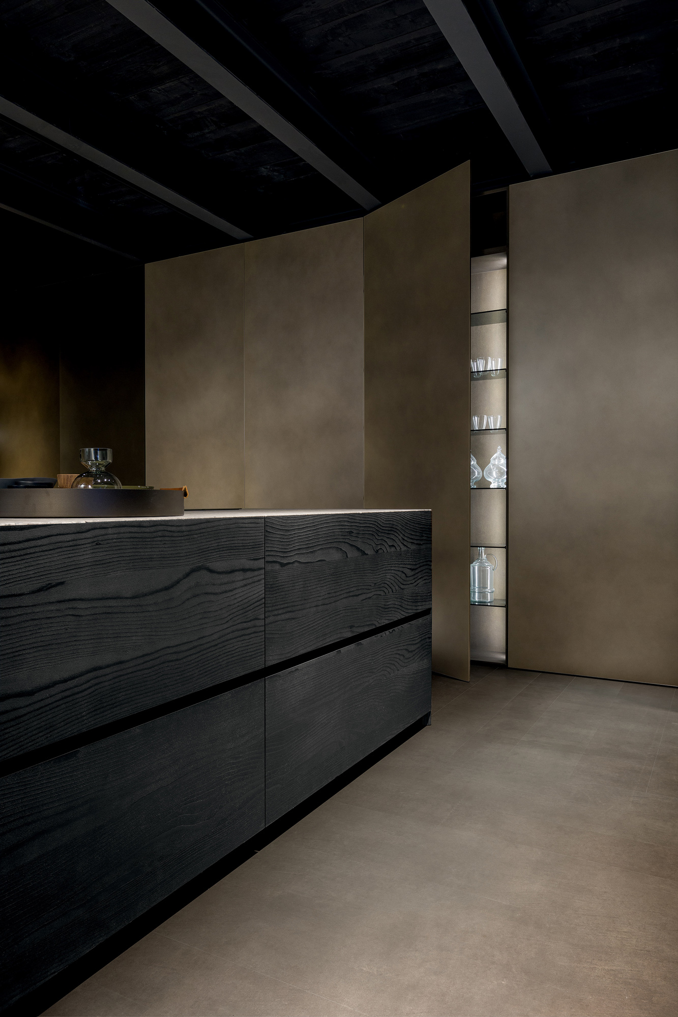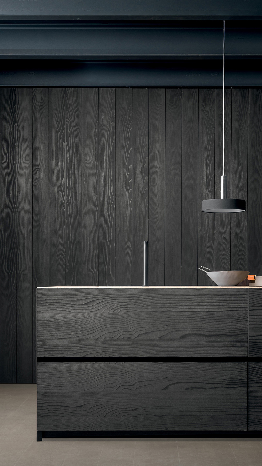 La configurazione monolitica di Fly nasce dall’incontro tra innovazione e ricerca di un minimalismo che esalta la purezza della forma. I bordi a 45° consentono l’apertura di ante e cassetti senza creare spessori visibili, lasciando emergere con forza il volume dell’isola, qui rivestita in legno Rovere Caffè.