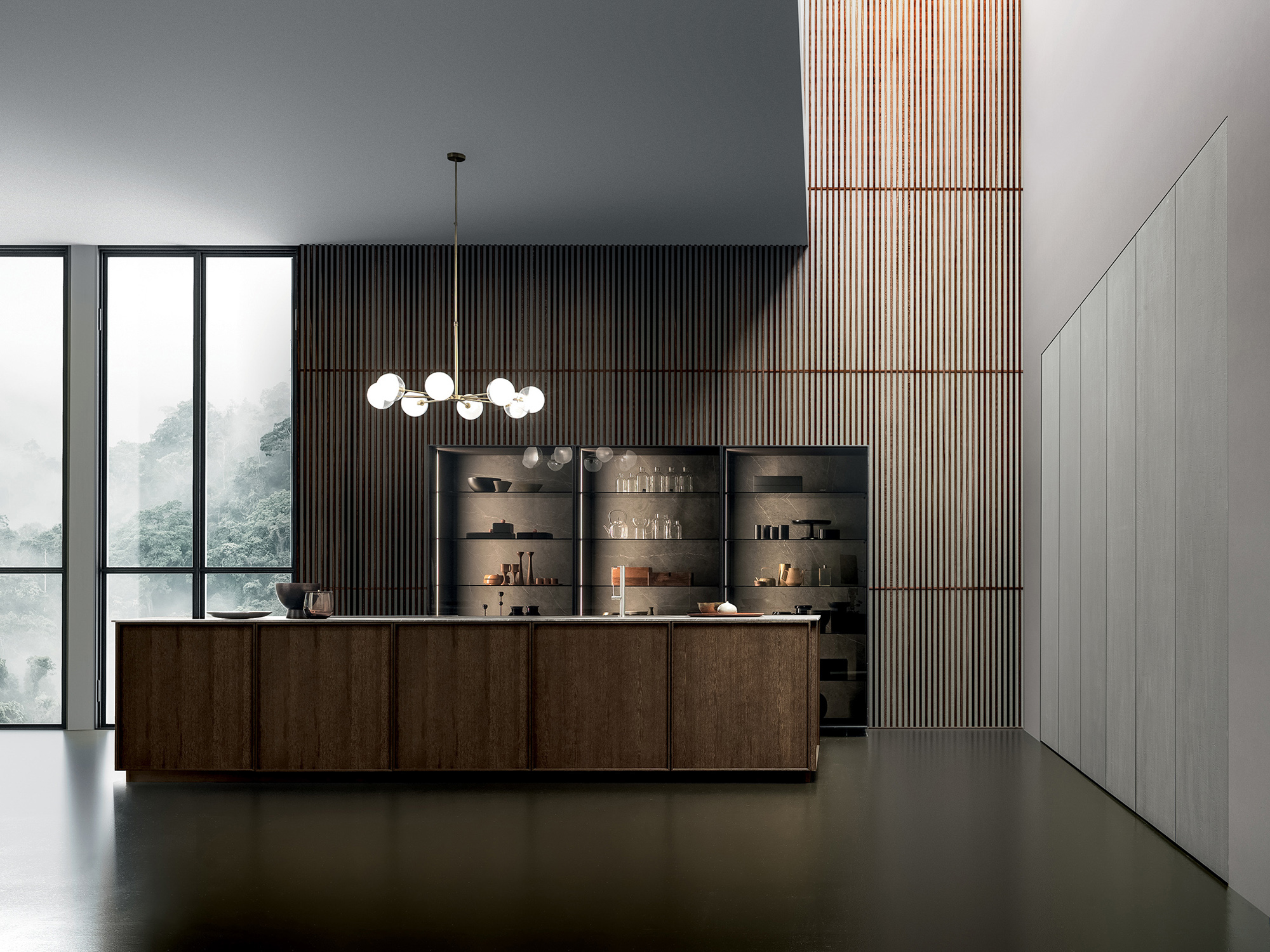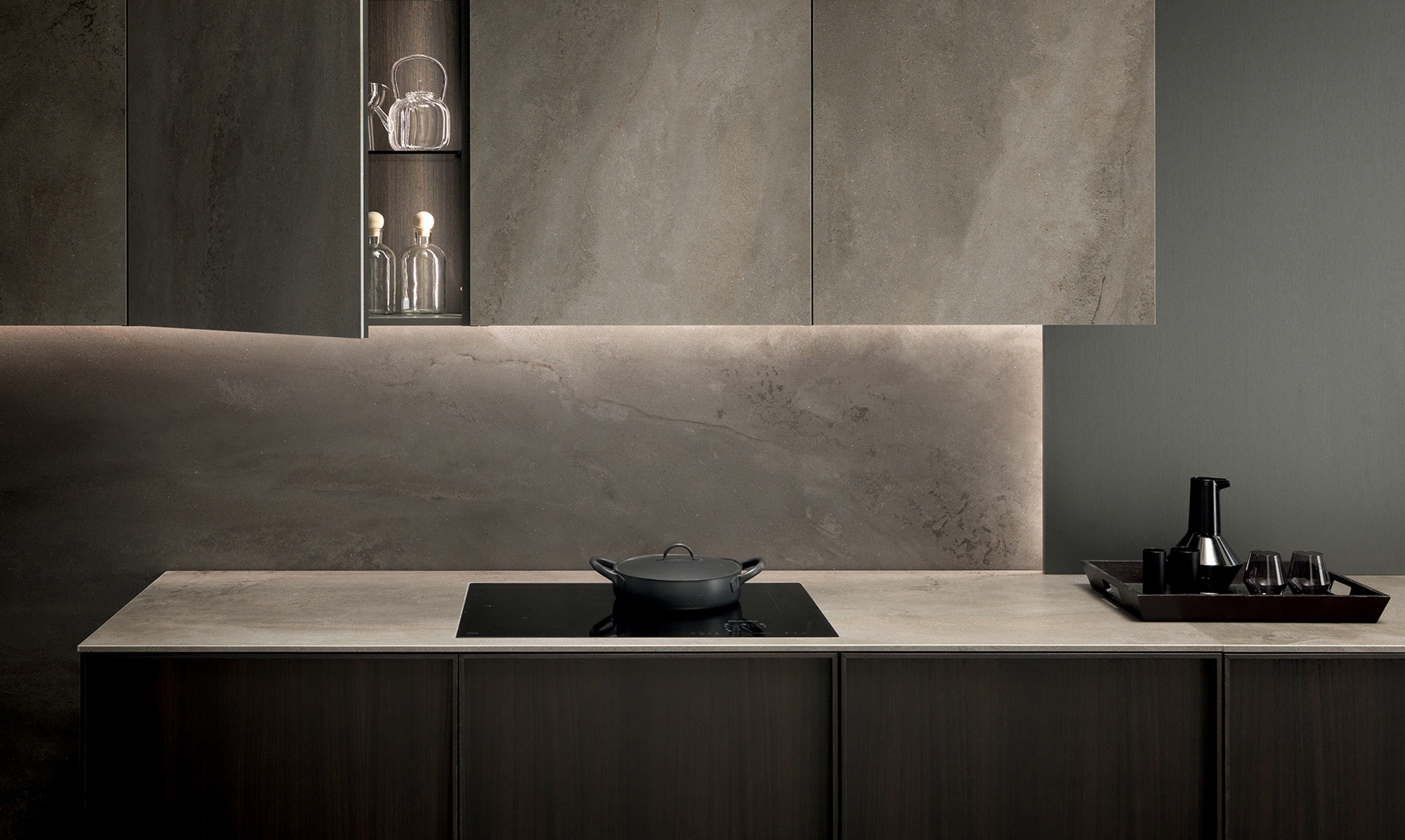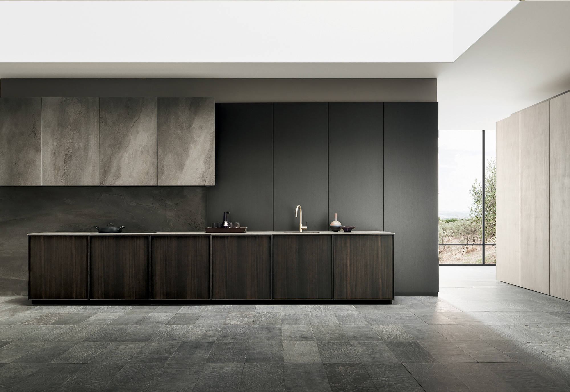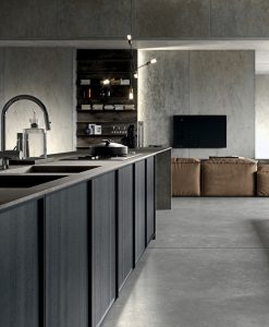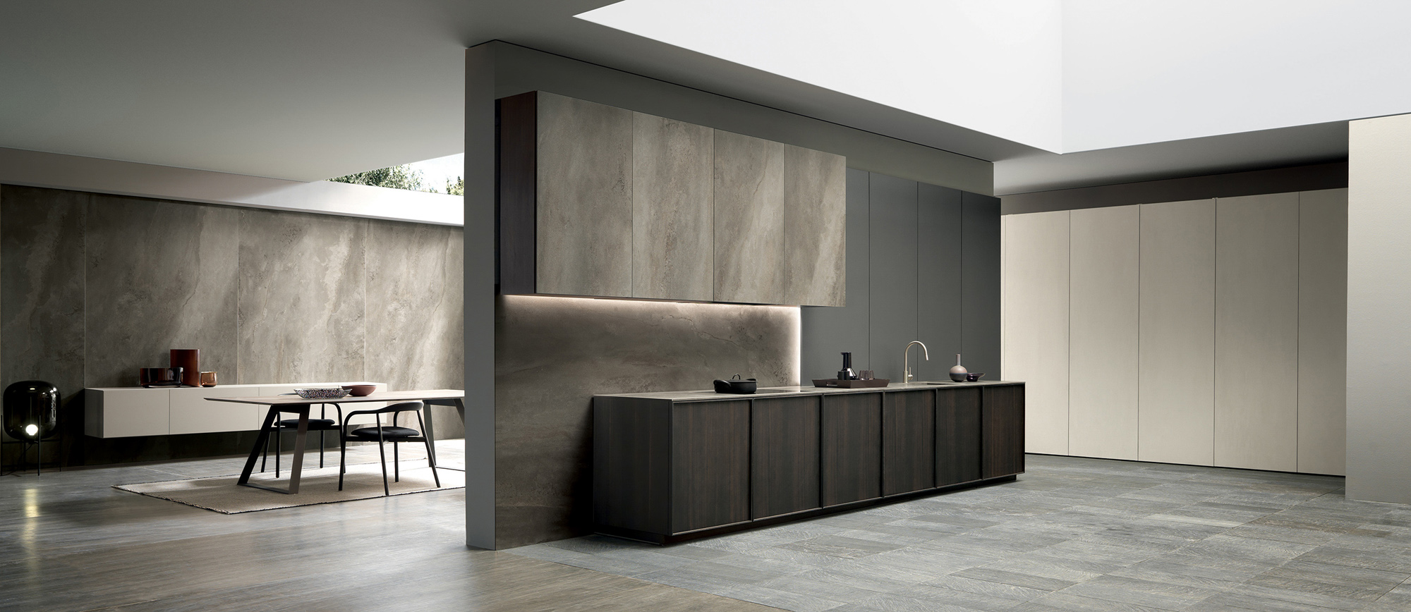 Il lungo top in gres city stone brown si allunga formando un tutt’uno con lo snack donando al progetto una linearità ed un minimalismo