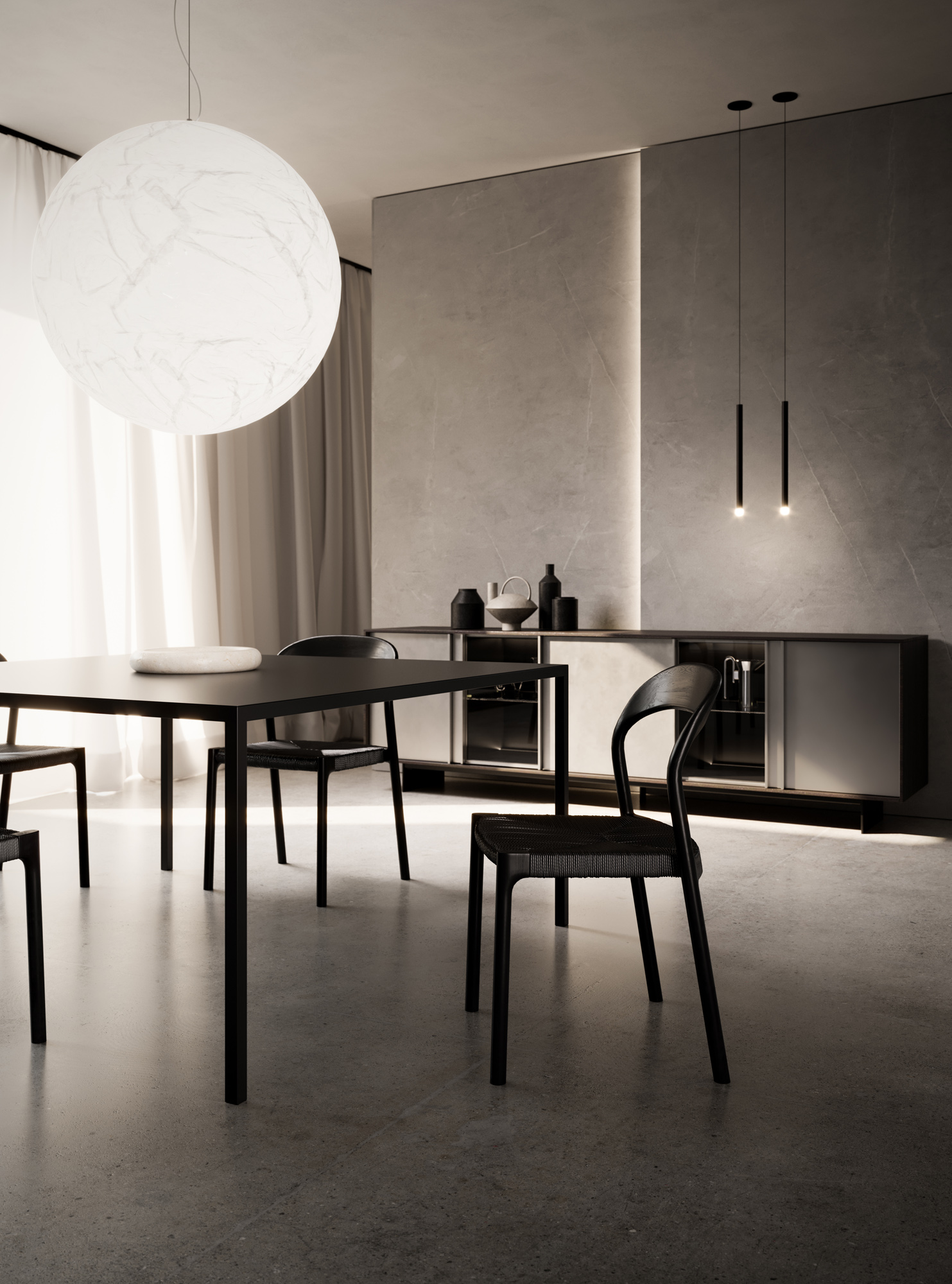 Il volume in metallo Dust ne definisce il rigore, mentre l’anta Glass apre la composizione a trasparenze e luce, amplificandone la profondità.