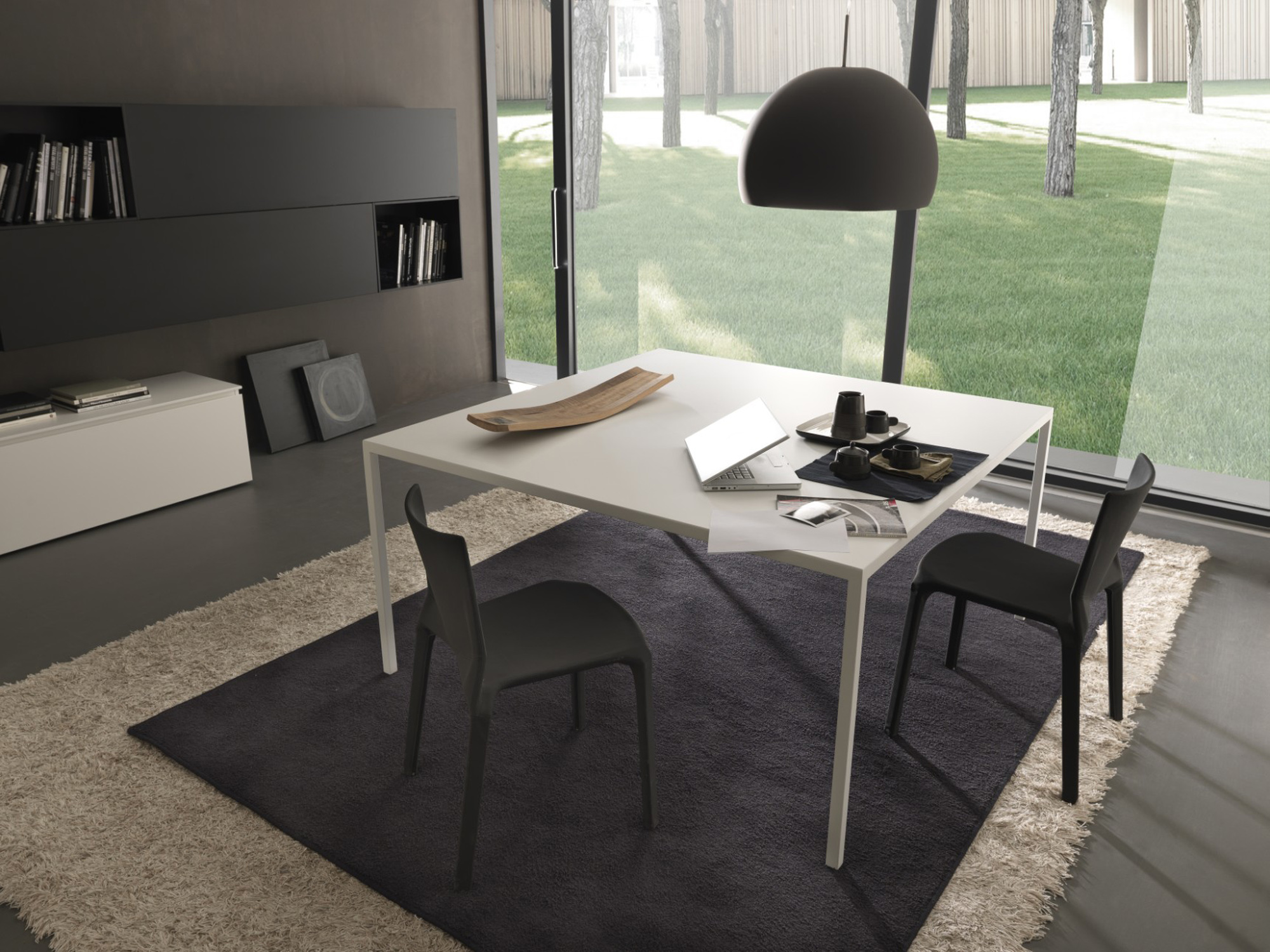 Iron è disponibile nelle finiture laccato satinato o resina cemento. Piano e struttura sono realizzati nella stessa finitura, generando una continuità materica che valorizza la purezza delle linee e la coerenza dell’insieme.