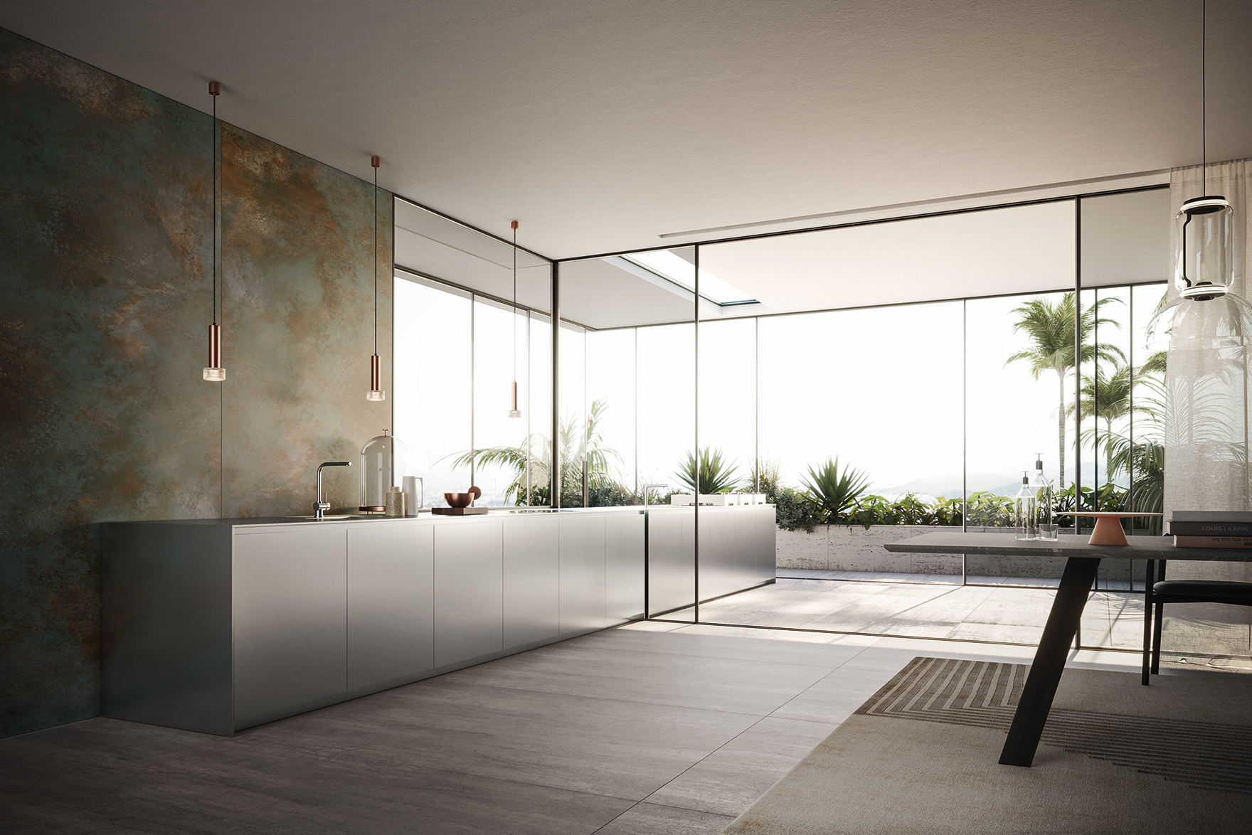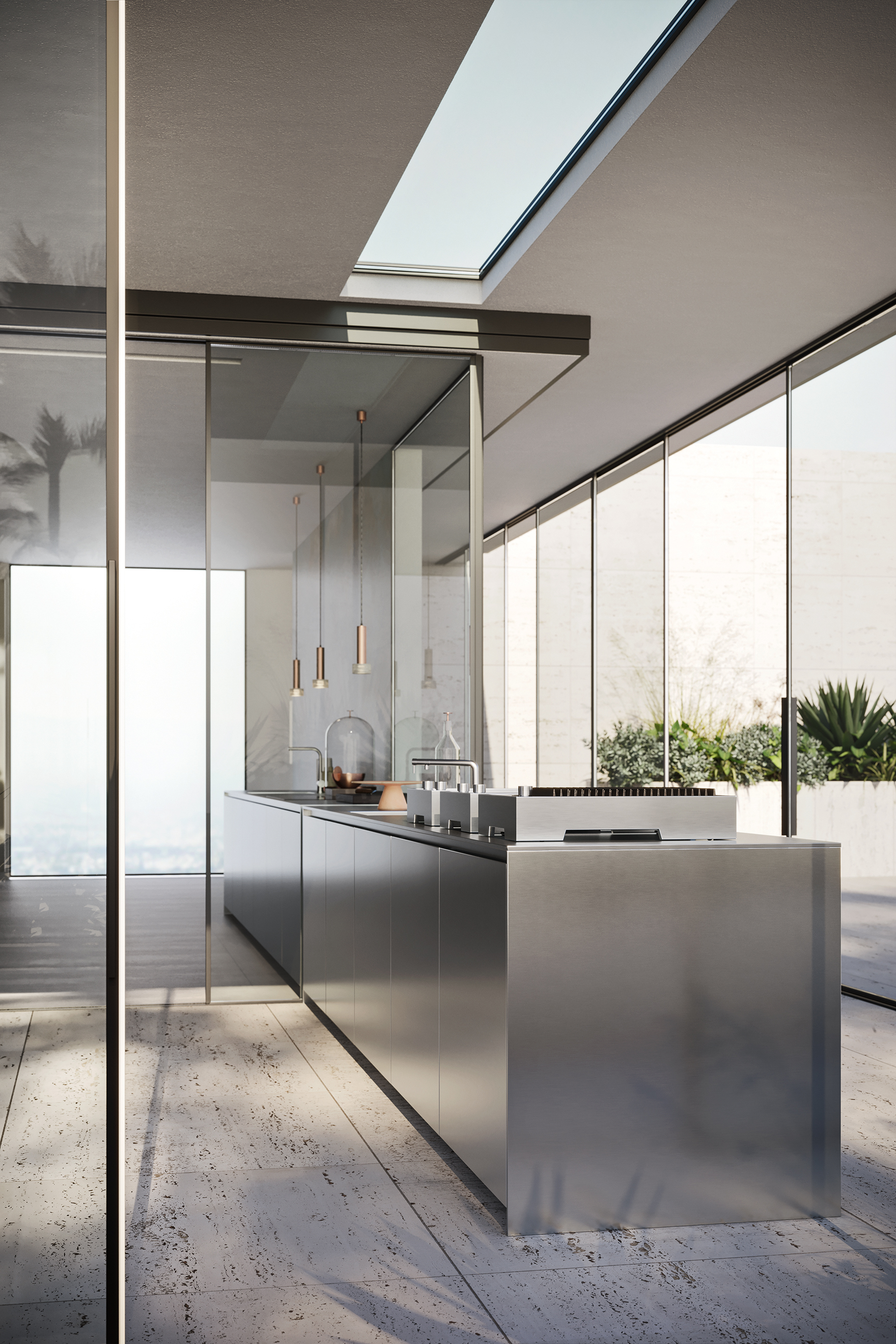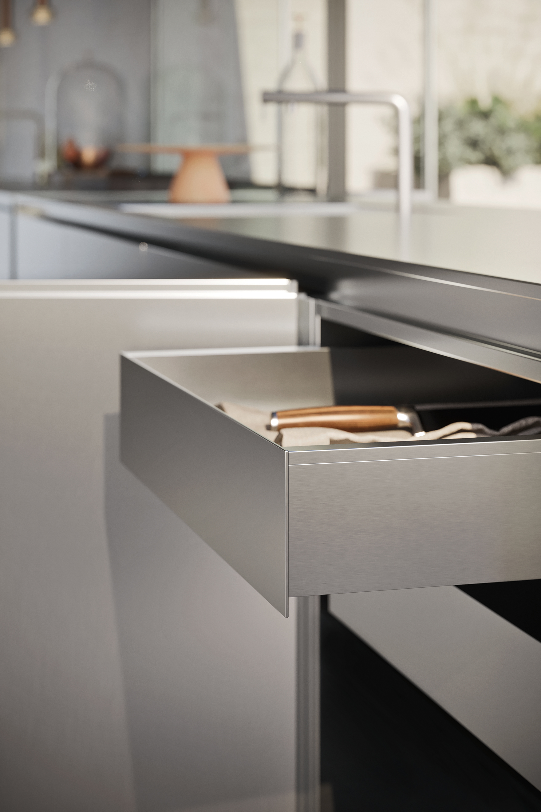 Basi, scocche, piano di lavoro e vasca integrata sono realizzati in acciaio inox, configurando un sistema continuo ad alte prestazioni. La versione standard prevede acciaio AISI 304; per contesti esposti a salsedine o agenti corrosivi è disponibile la configurazione in AISI 316, indicata per installazioni in prossimità di ambienti marini.