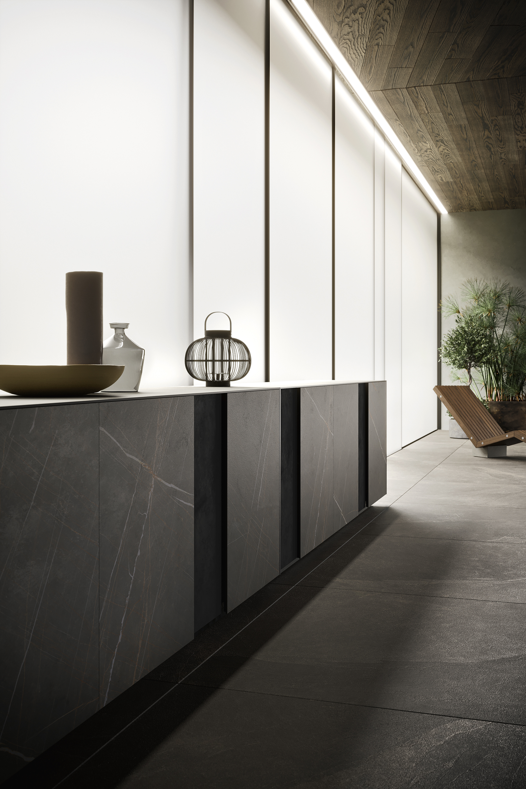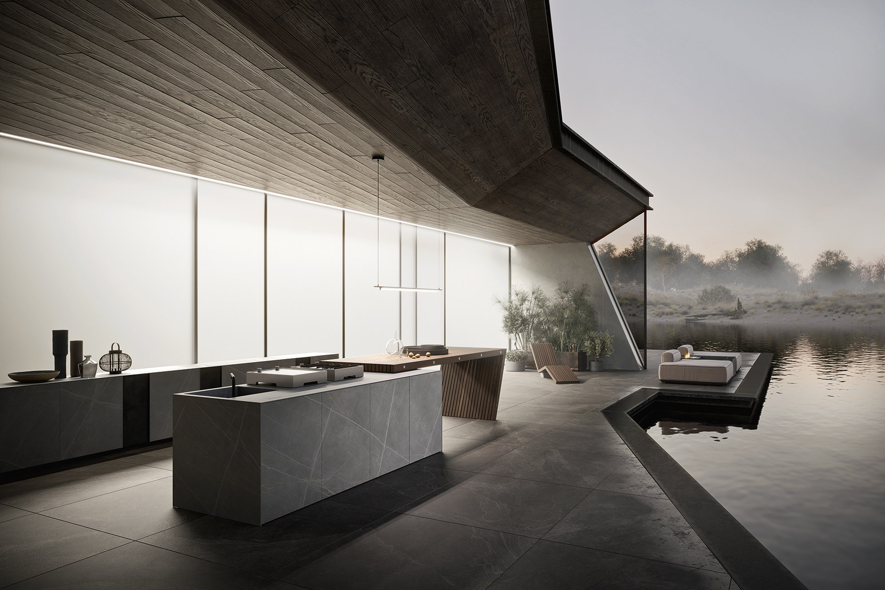La penisola e la chaise longue XY in frassino massello versione Light introducono una componente lignea che bilancia la profondità del gres e della pietra. Il legno dialoga con la materia scura, definendo una relazione calibrata tra superficie minerale e presenza naturale.