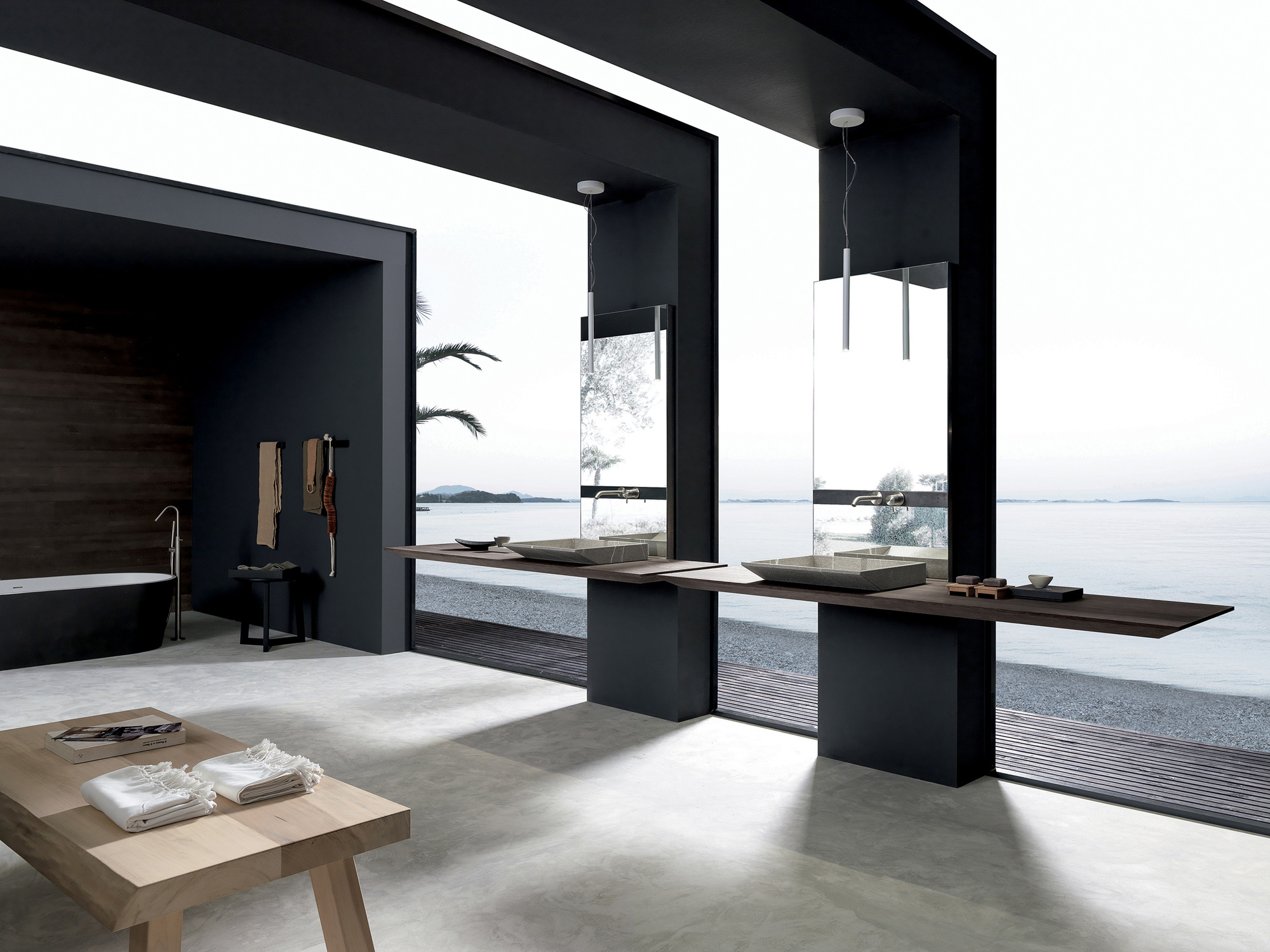 Nuove proporzioni prendono forma attraverso una combinazione armoniosa di materiali diversi, dando vita a un arredo bagno moderno dal forte impatto visivo. Il telaio verticale a specchio sostiene un piano sospeso in ferro nero e rovere carbone, creando un equilibrio perfetto tra leggerezza strutturale ed estetica contemporanea.