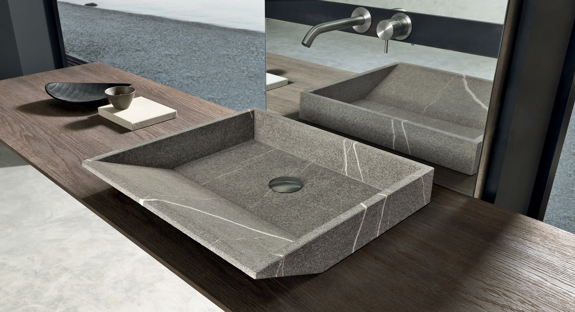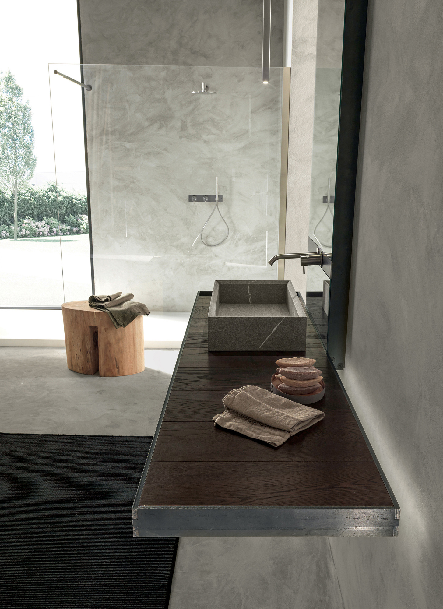 Il lavabo in pietra piasentina fiammata valorizza la composizione con un tocco materico e raffinato. La specchiera, arricchita da un inserto in ferro nero, integra la rubinetteria in modo elegante e funzionale, offrendo una soluzione innovativa per un bagno di design pratico e distintivo.