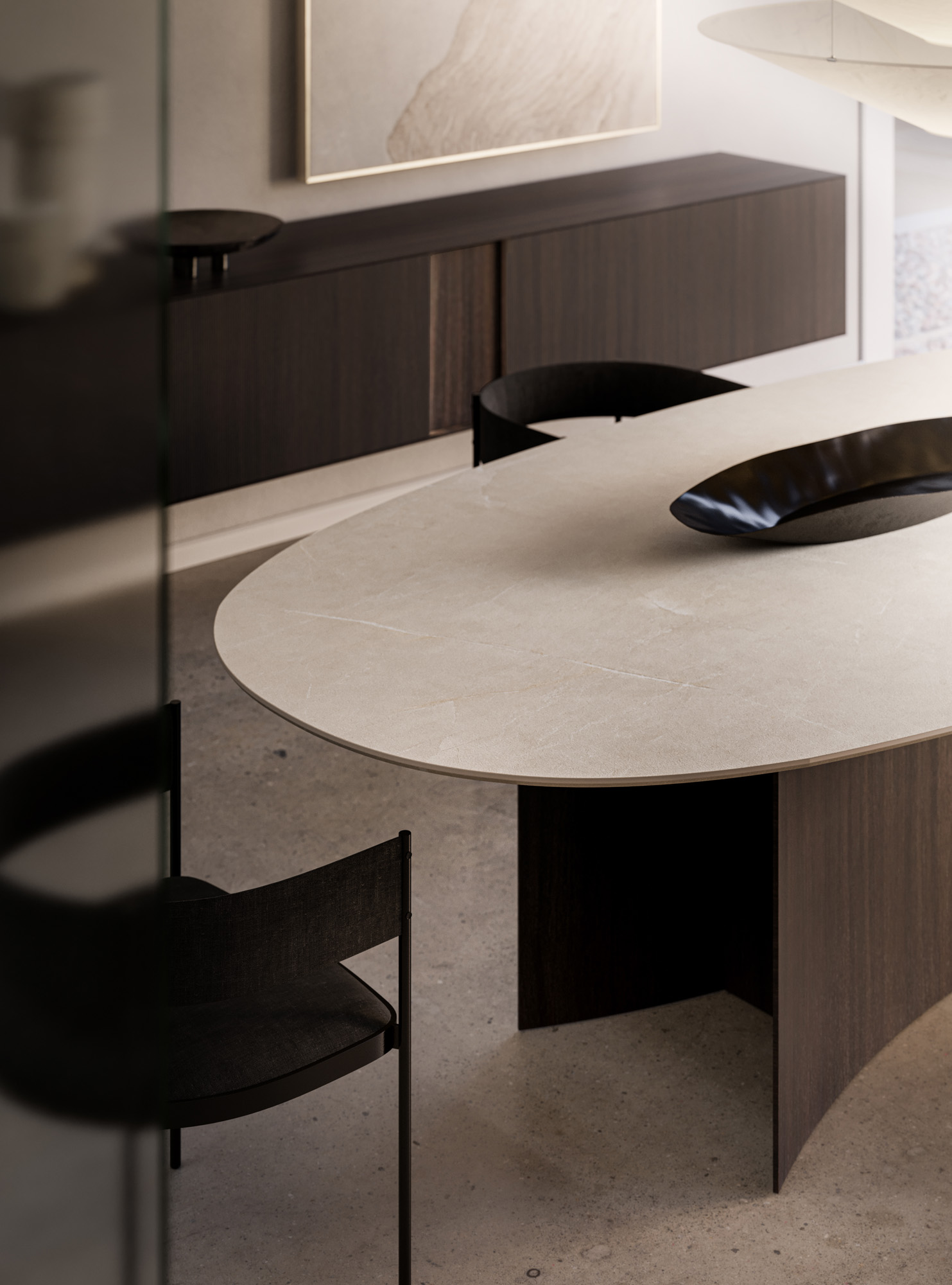Time è un tavolo da pranzo dalle linee leggere e armoniose, progettato per definire con eleganza lo spazio dining. La forma ellittica e l’utilizzo di materiali naturali ne sottolineano il carattere equilibrato e la presenza nello spazio.