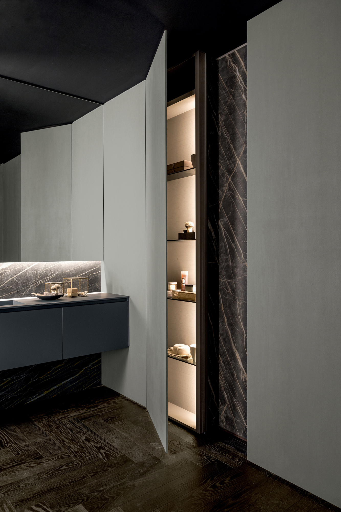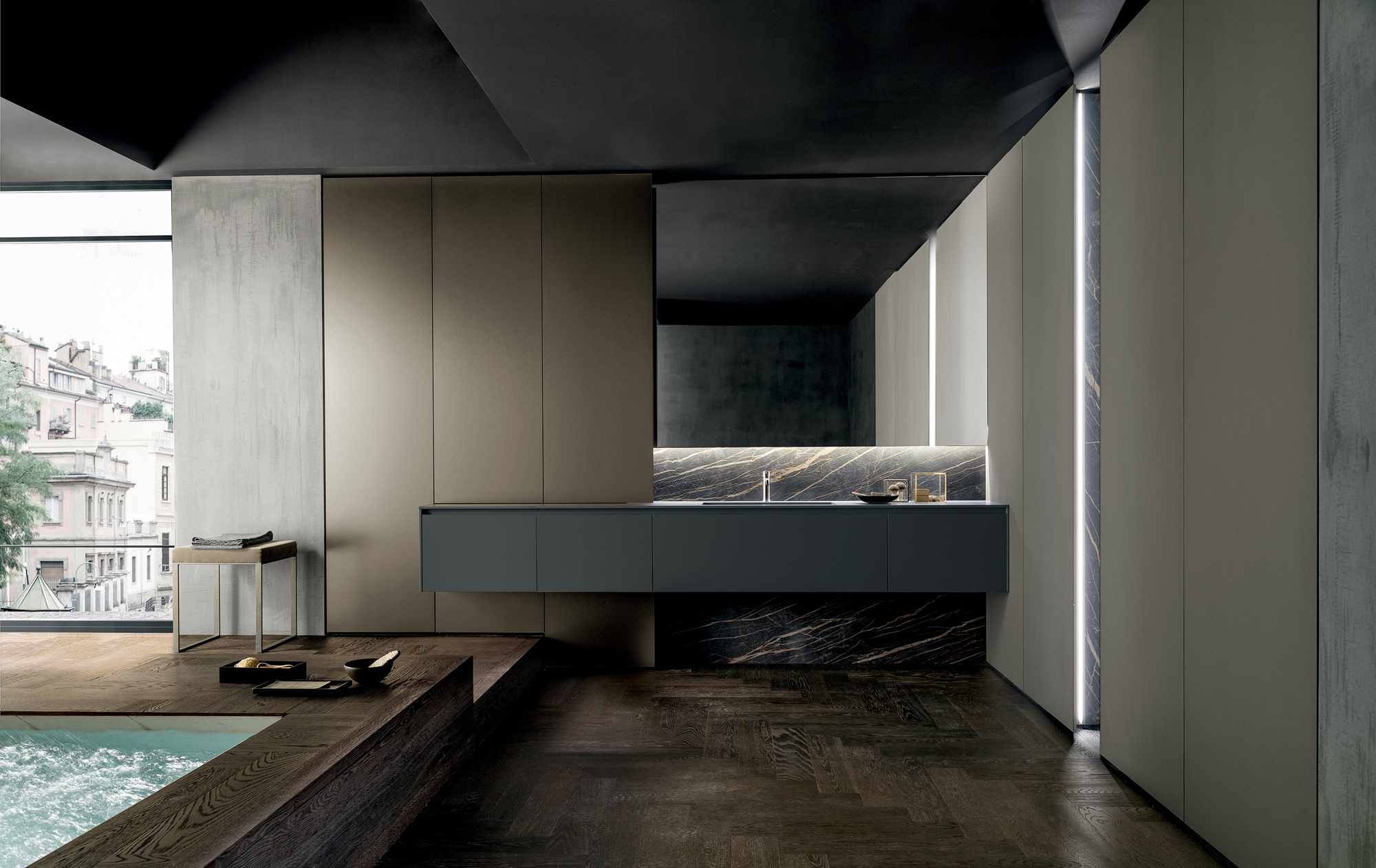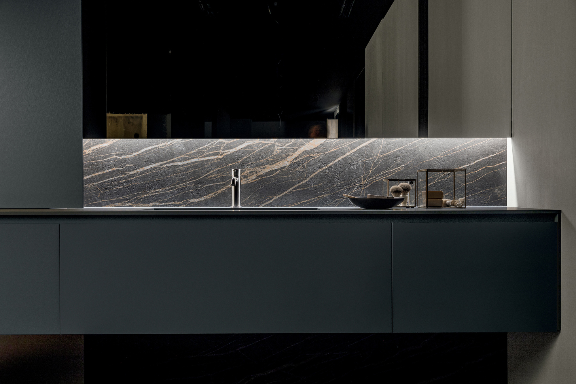 Nel modello Twenty, l’illuminazione diventa parte integrante del progetto, contribuendo a definire quell’equilibrio sottile tra presenza e sottrazione. La luce non invade lo spazio, ma lo attraversa con discrezione, emergendo da tagli essenziali e superfici continue che ne amplificano la percezione.