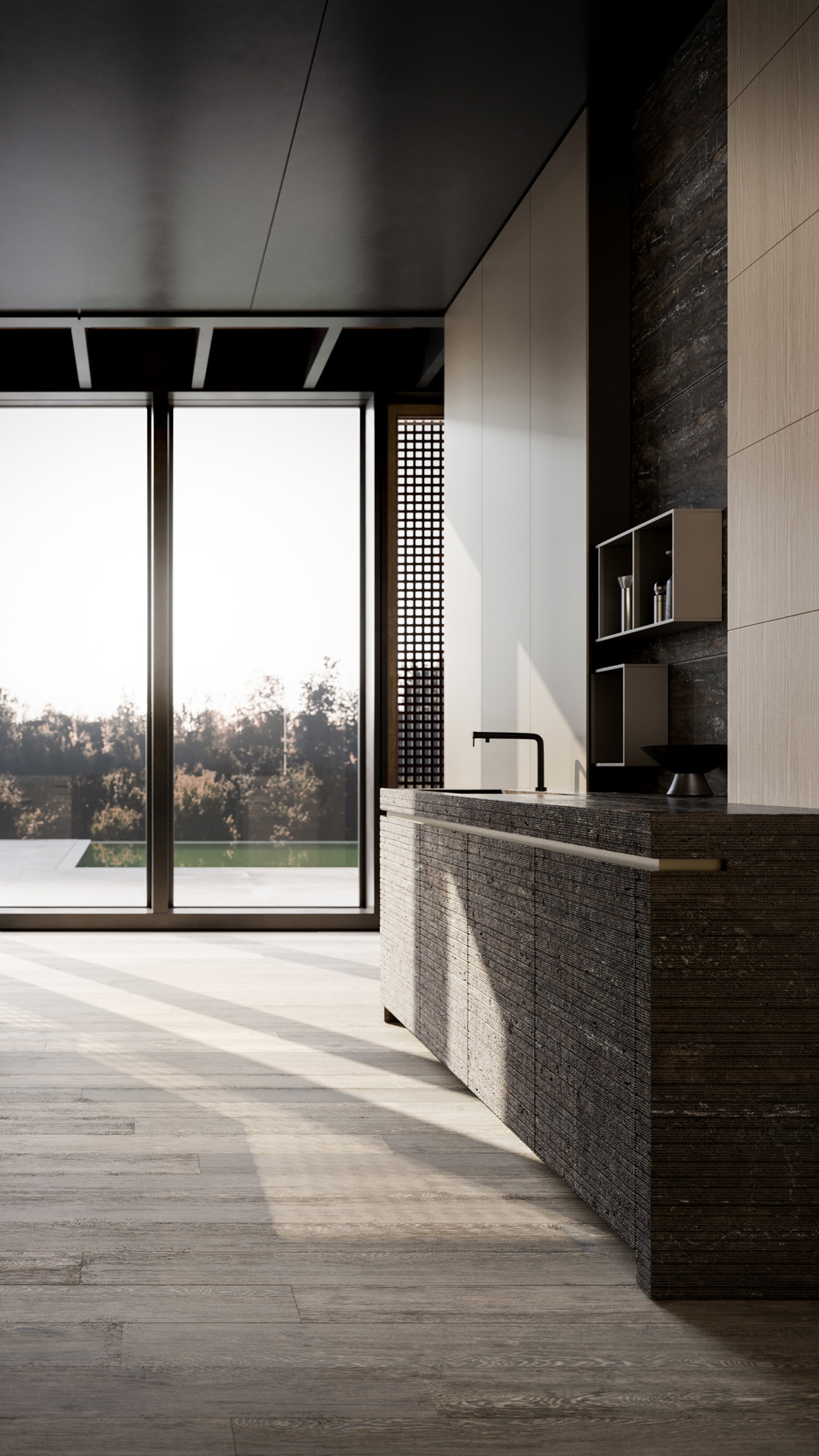 Twenty Lab presenta il Travertino Titanium, una materia stratificata e profonda che custodisce la memoria della terra. La nuova finitura tridimensionale Graf introduce nel sistema cucina una profondità finora riservata alle boiserie, rendendo la materia leggibile e architettonica.