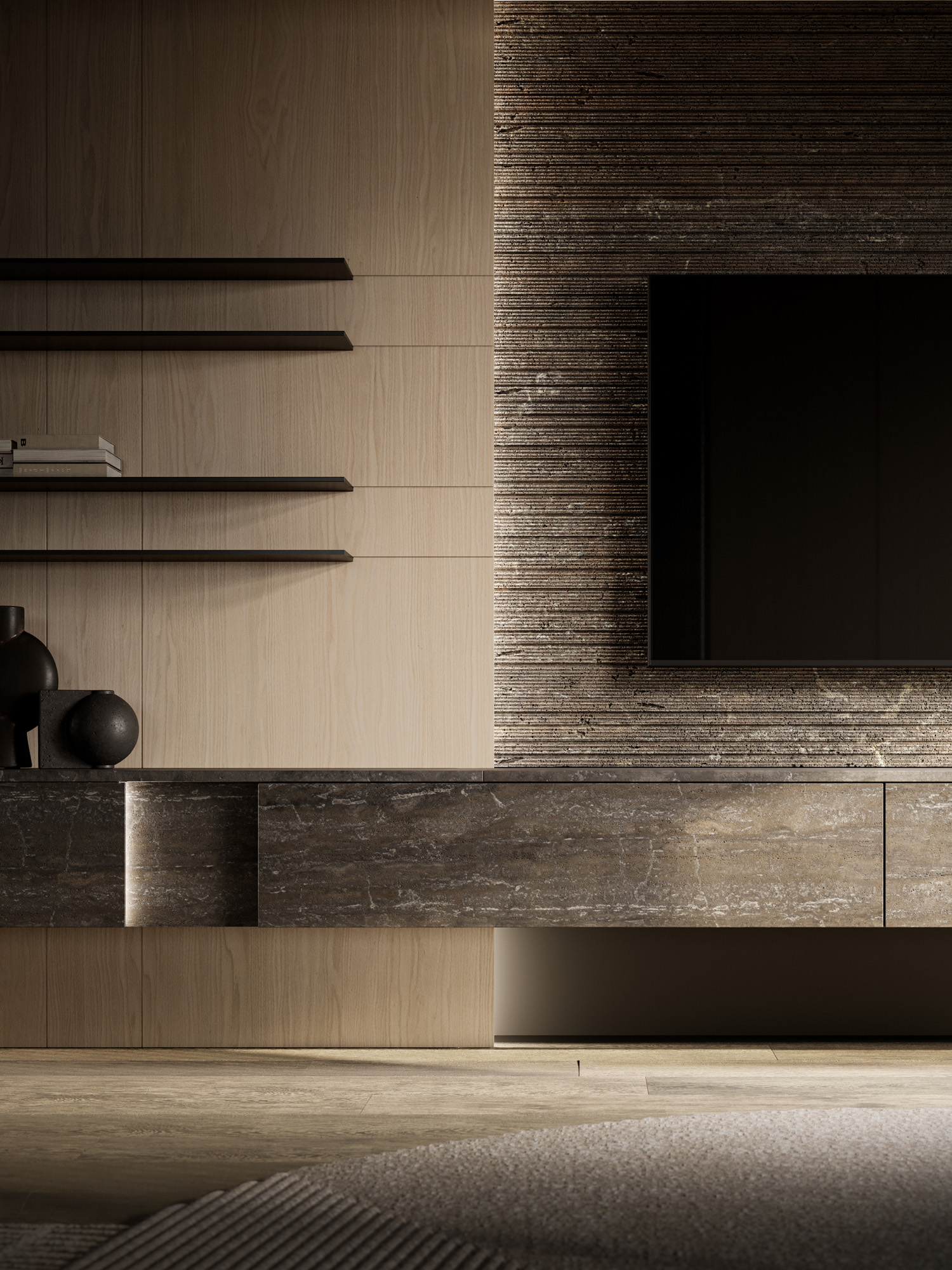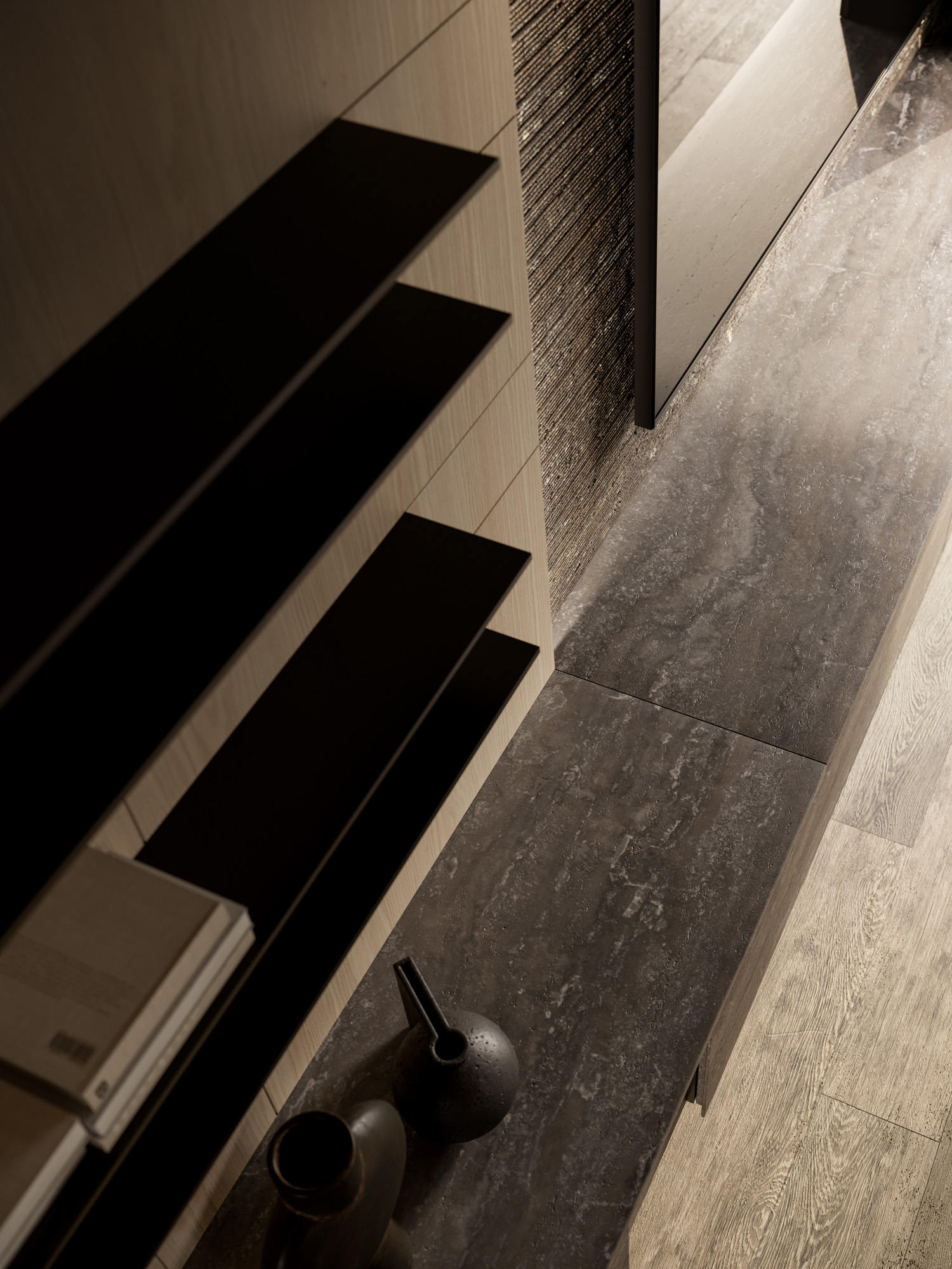 Vertical nasce dall’incontro tra materia, luce e architettura, dando forma a uno spazio in cui ogni elemento contribuisce a costruire equilibrio e continuità. Il Travertino Titanium introduce una presenza materica intensa e sofisticata, capace di dialogare con la luce e di restituire profondità alle superfici.