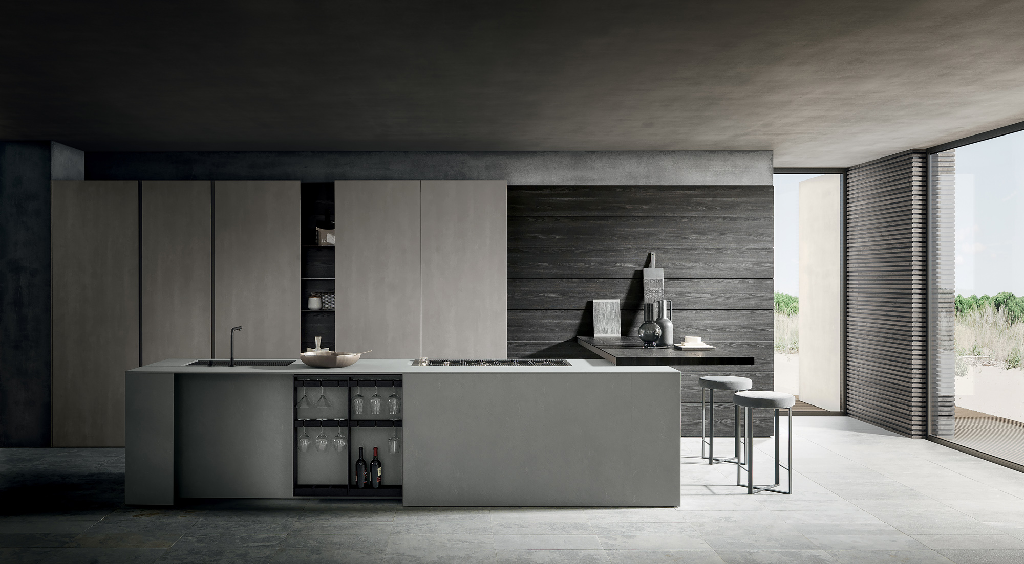 Il suo movimento orizzontale introduce una dimensione fluida all’interno della composizione cucina, generando un’interazione continua tra la zona operativa e quella contenitiva. In questo modo, lo spazio non è più rigidamente suddiviso, ma diventa modulabile e reattivo, capace di cambiare configurazione in funzione delle diverse fasi di utilizzo, dalla preparazione alla cottura.
