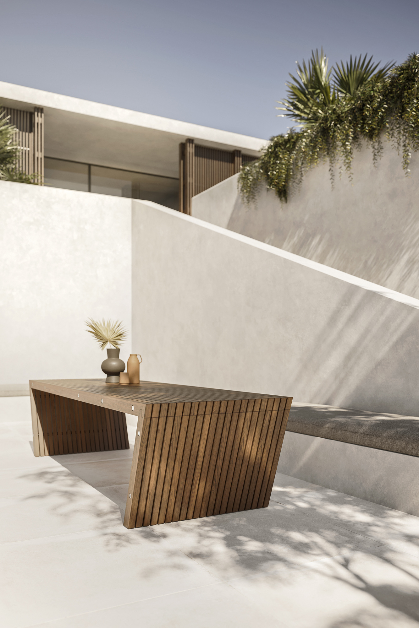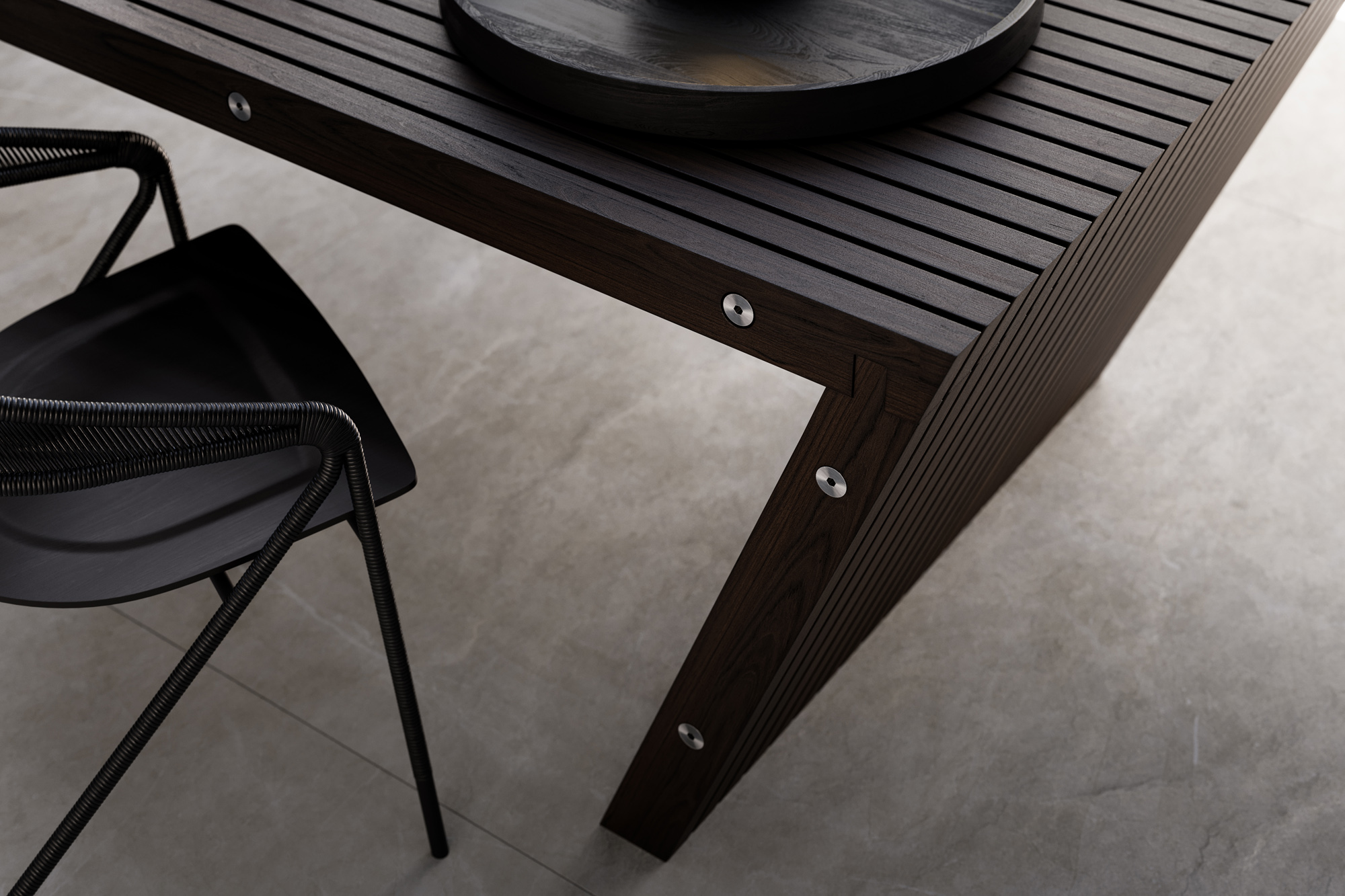 Il frassino massello lavorato a listelli ne costruisce la struttura e la presenza visiva, nelle versioni Light e Dark.