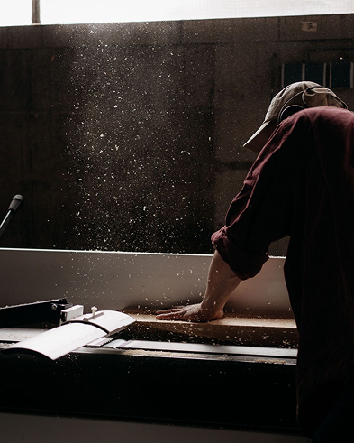 Il folding nasce da una lavorazione manuale che permette al legno di proseguire oltre la superficie dell’anta, accompagnandone la venatura su bordi e spessori con continuità e precisione. Un intervento che richiede controllo, sensibilità e competenza esecutiva, perché la materia mantenga coerenza lungo tutto il volume.