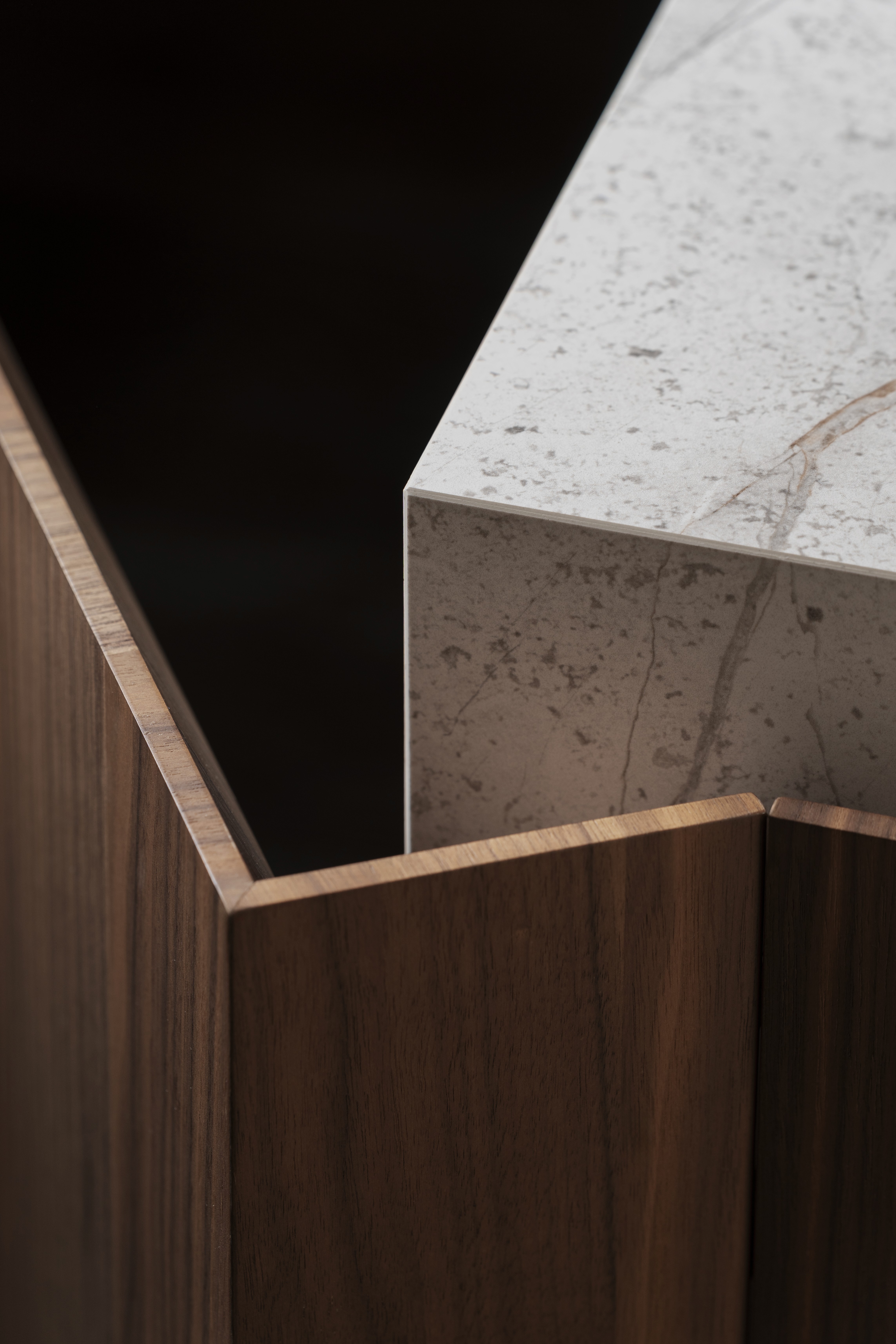 La ricerca Modulnova sulla pietra nasce dalla volontà di ampliare le possibilità del progetto, portando un materiale naturalmente pieno e materico verso una nuova libertà applicativa. Attraverso lo sviluppo di soluzioni costruttive dedicate, la pietra mantiene intatta la propria forza espressiva, ma acquisisce una leggerezza strutturale che ne rende possibile un impiego più evoluto. In Blade Lab questa innovazione trova una delle sue espressioni più avanzate. L’anta in pietra, marmo o granito viene realizzata a partire da una lastra scavata e integrata con un pannello in alveolare di alluminio, in uno spessore di 15 mm.