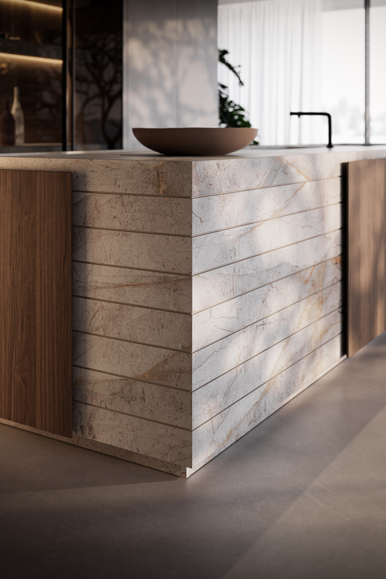 Una soluzione che consente di conservare la presenza monolitica della materia, rendendola al tempo stesso compatibile con un sistema progettuale ad alte prestazioni. Il risultato è un equilibrio preciso tra materia e tecnologia, tra intensità visiva e controllo costruttivo. La pietra non perde il proprio carattere, ma entra nel progetto con una nuova precisione, aprendo la strada a superfici più rigorose, a volumi essenziali e a una più ampia libertà compositiva. È in questa capacità di trasformare un materiale notoriamente pesante in una presenza architettonica più leggera che si riconosce una delle innovazioni più significative della ricerca Modulnova.
