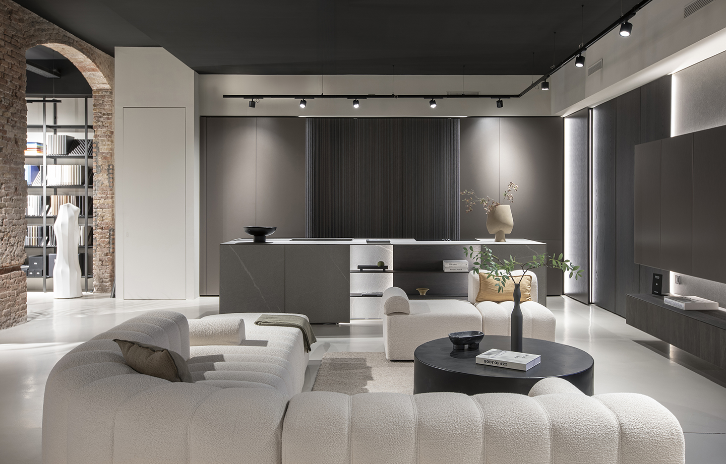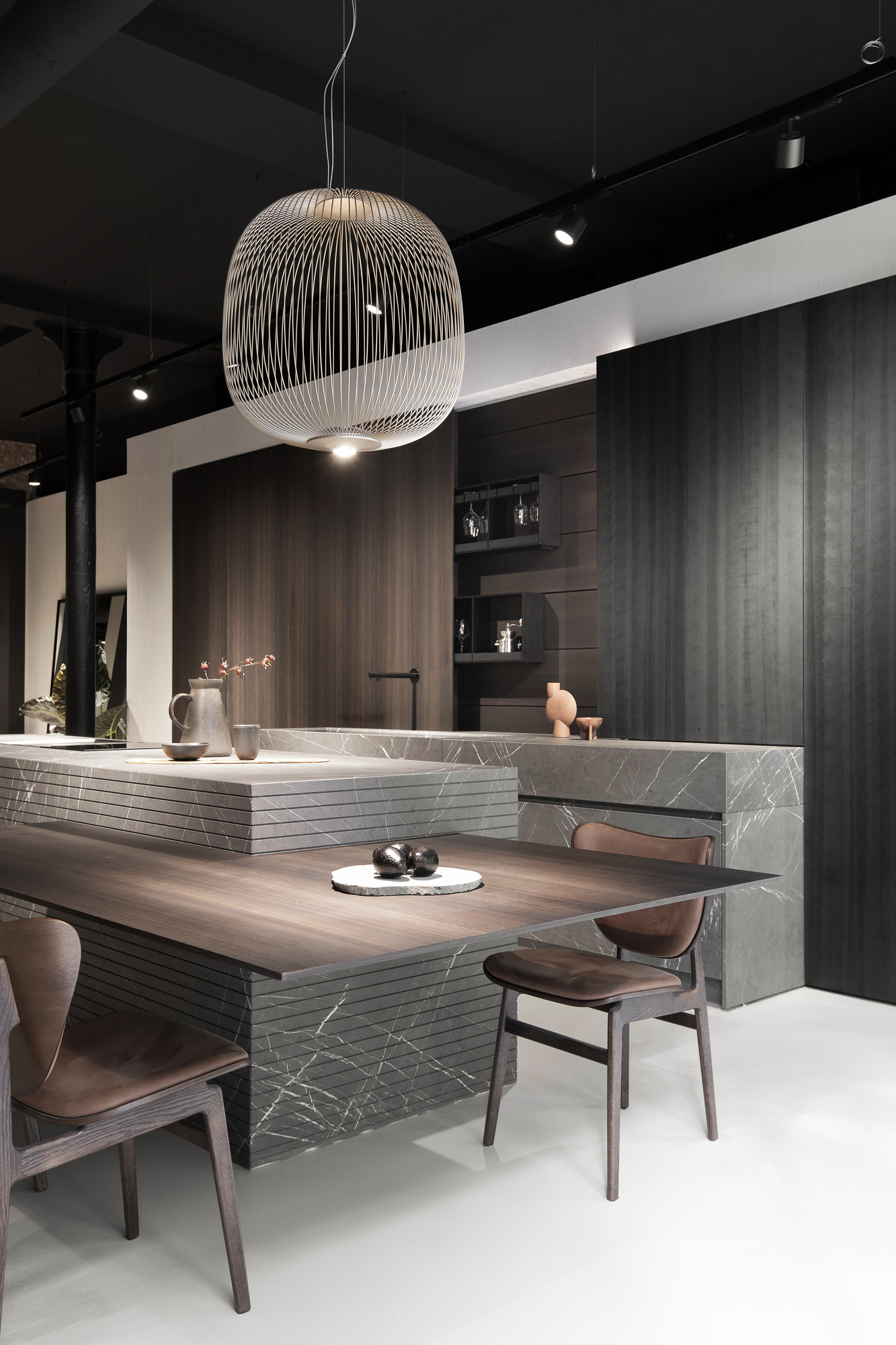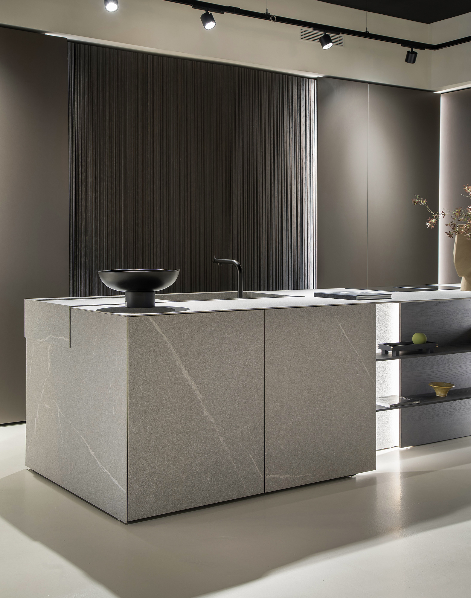 Un grande tavolo XY in impiallacciato di legno Rovere Fumo segna il passaggio verso le altre due nuove composizioni presenti in showroom: una sistema parete living Skill/MH6 con pensili in Milltech Lead Grey, così come le ante delle basi, mentre le mensole sono in Noce Cenere e lo schienale della tv in marmo Moon Grey; e un sistema cucina Concept dove colonne in Noce Cenere e Lead Grey si abbinano a basi con anta Skill Gres Moon Grey, materiale utilizzato anche per la boiserie che ospita la televisione.