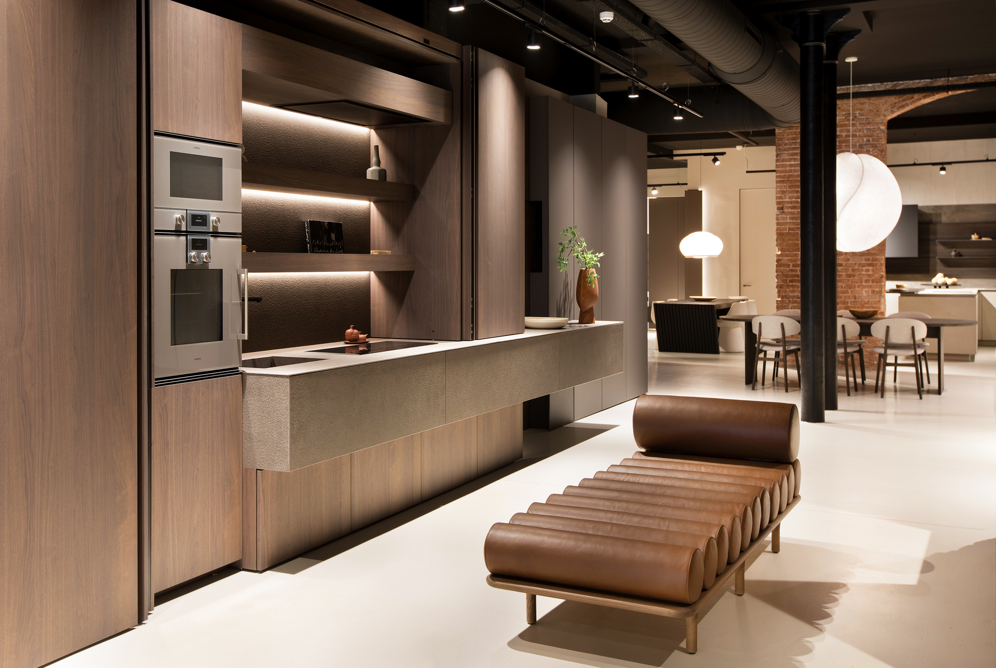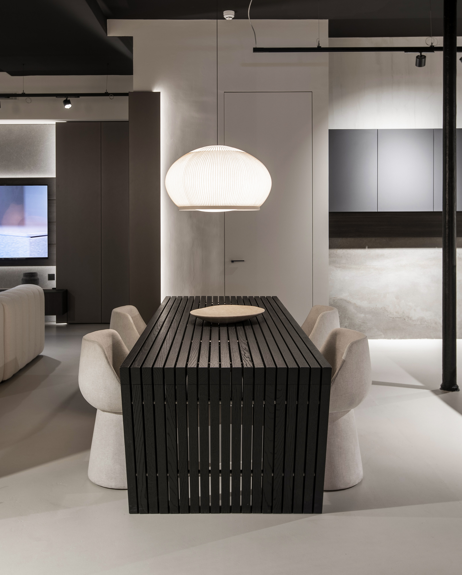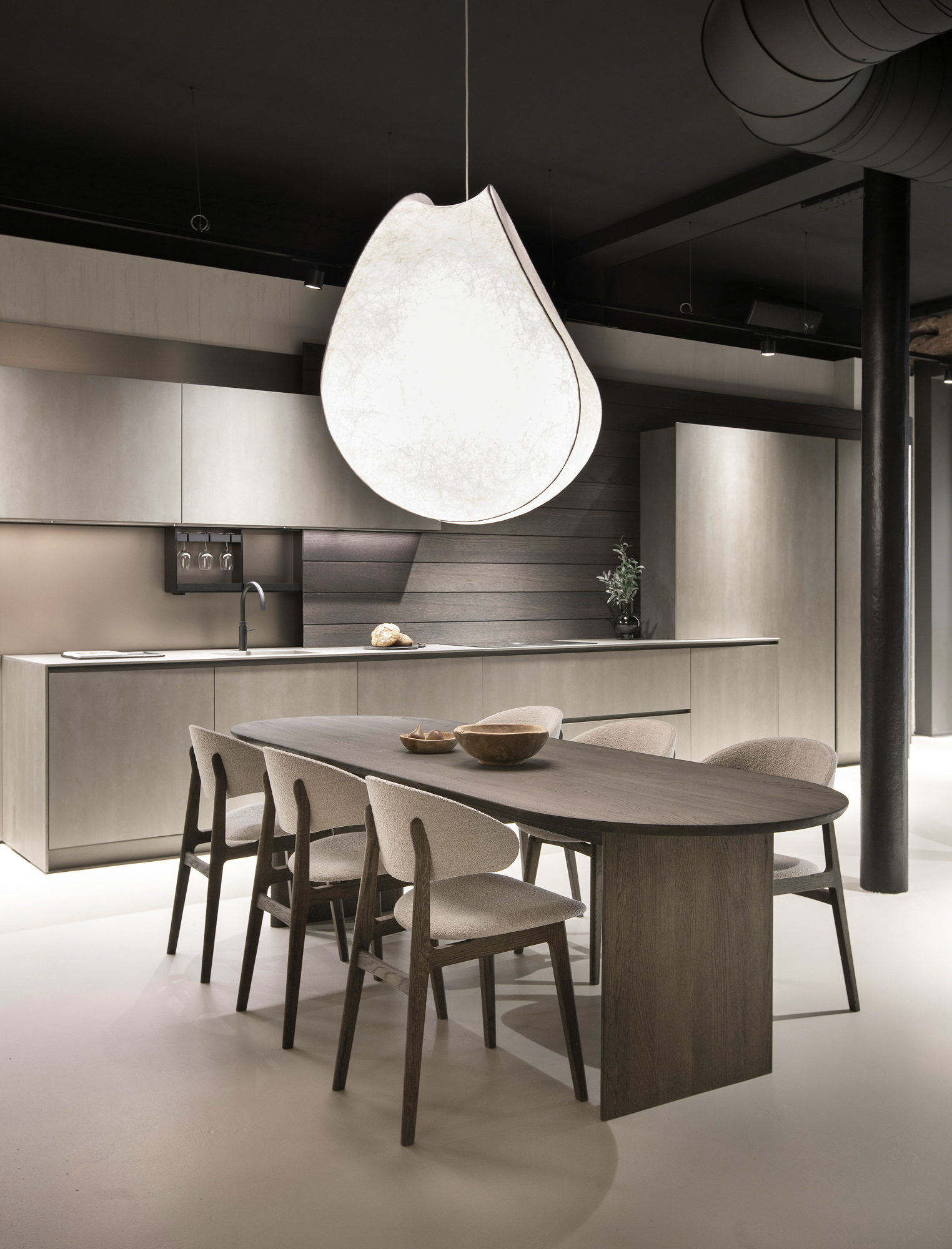 Un grande tavolo XY in impiallacciato di legno Rovere Fumo segna il passaggio verso le altre due nuove composizioni presenti in showroom: una sistema parete living Skill/MH6 con pensili in Milltech Lead Grey, così come le ante delle basi, mentre le mensole sono in Noce Cenere e lo schienale della tv in marmo Moon Grey; e un sistema cucina Concept dove colonne in Noce Cenere e Lead Grey si abbinano a basi con anta Skill Gres Moon Grey, materiale utilizzato anche per la boiserie che ospita la televisione.