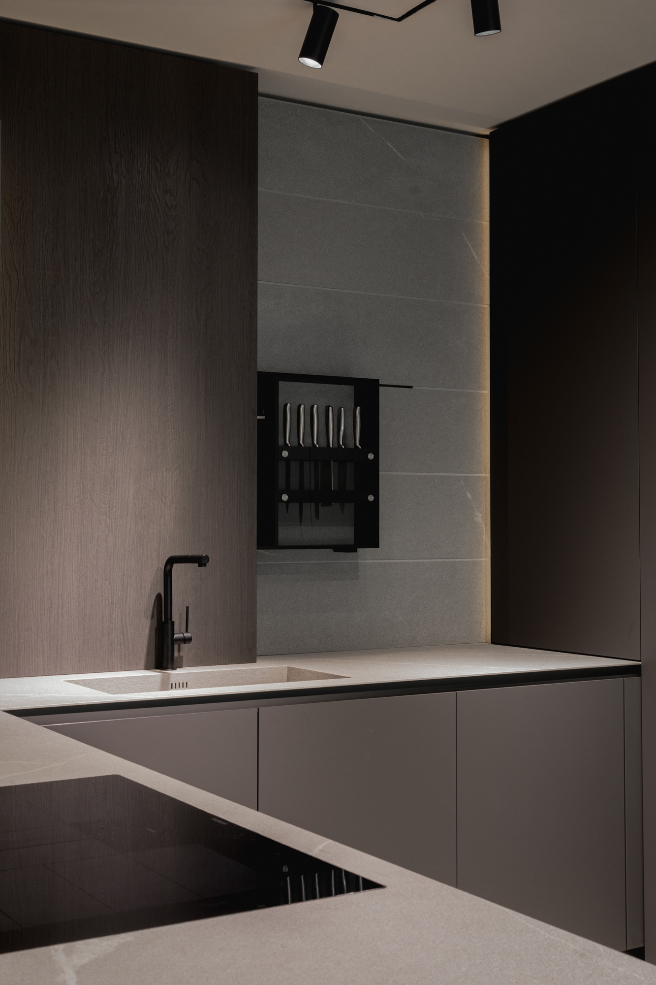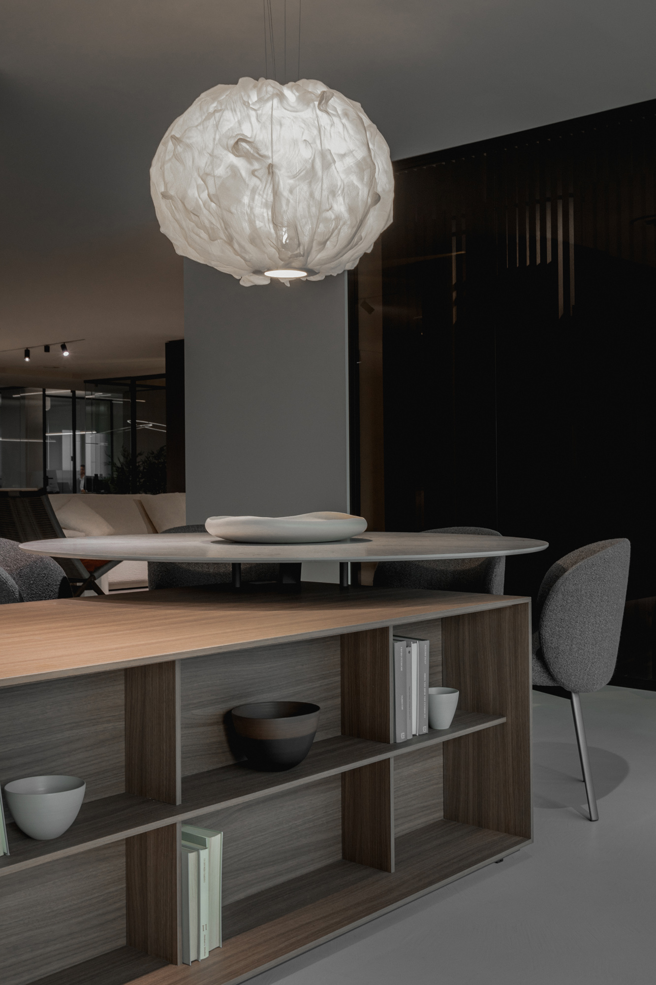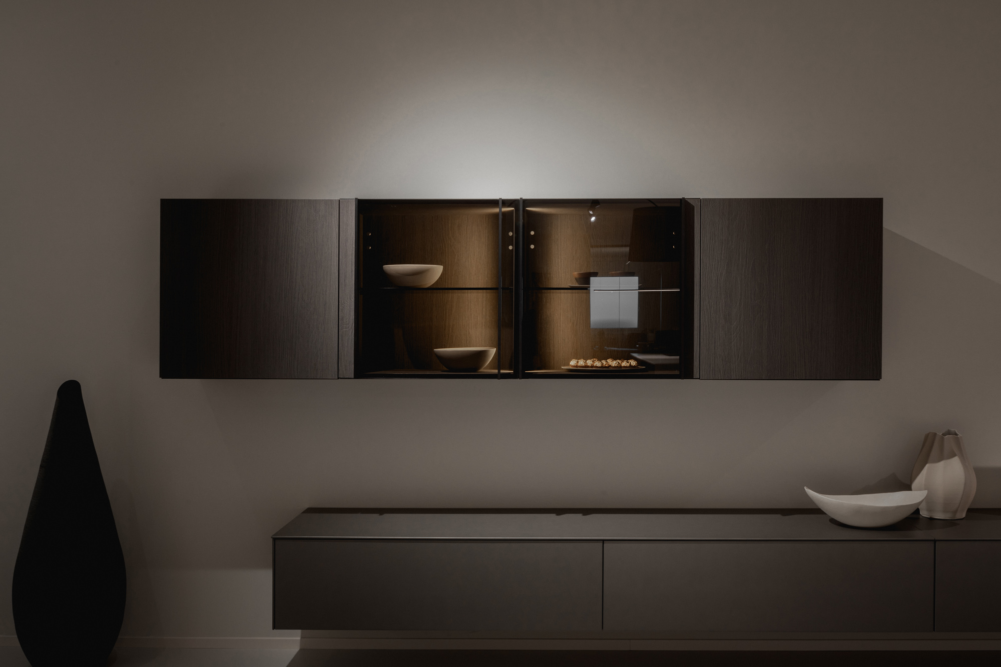 I materiali sono selezionati per le loro qualità estetiche e performative: pietre naturali dalle venature profonde, legni dalle texture autentiche e tattili, laccati opachi che restituiscono superfici continue e minimali, fino a metalli e finiture tecniche che introducono accenti contemporanei e raffinati. La lavorazione accurata esalta la matericità senza comprometterne la pulizia formale, creando un linguaggio coerente e sofisticato.