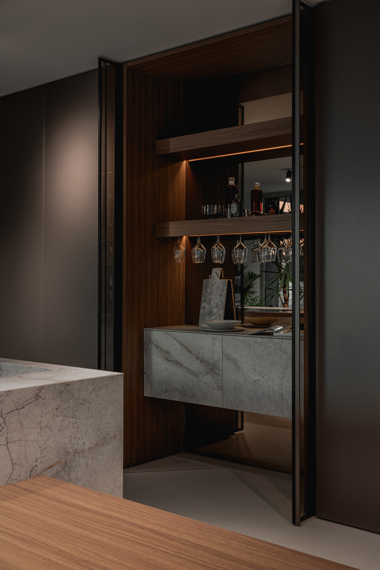 La cucina Blade Lab, penisola Infinity, cabina Glass ante rientranti