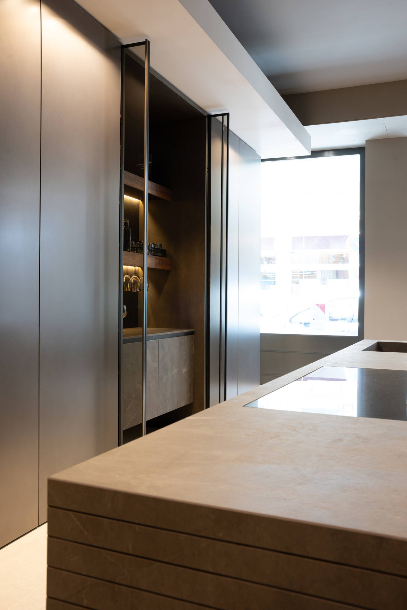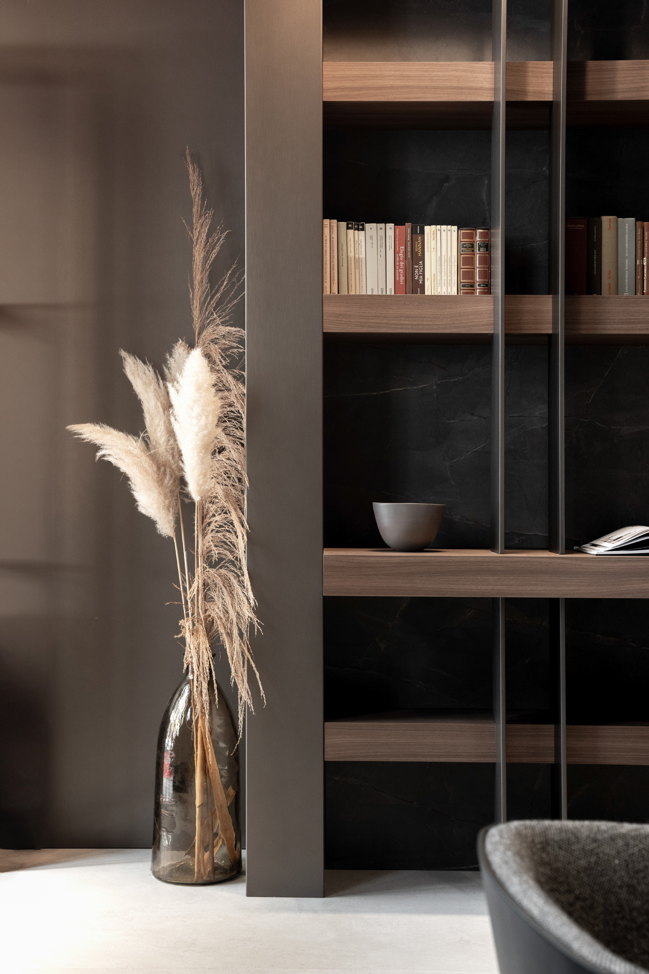I materiali sono selezionati per le loro qualità estetiche e performative: pietre naturali dalle venature profonde, legni dalle texture autentiche e tattili, laccati opachi che restituiscono superfici continue e minimali, fino a metalli e finiture tecniche che introducono accenti contemporanei e raffinati. La lavorazione accurata esalta la matericità senza comprometterne la pulizia formale, creando un linguaggio coerente e sofisticato.