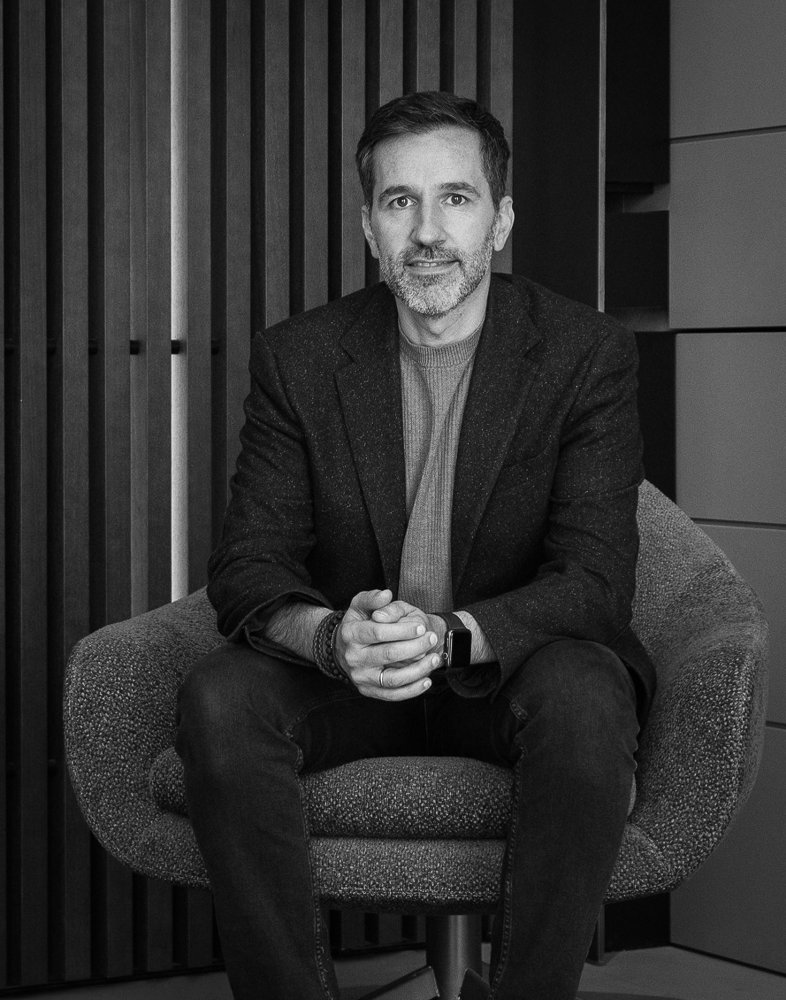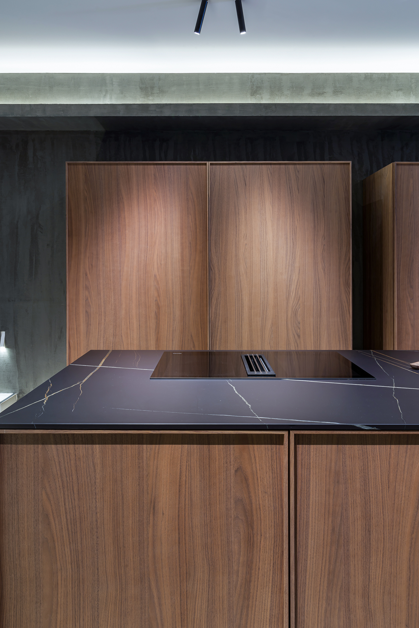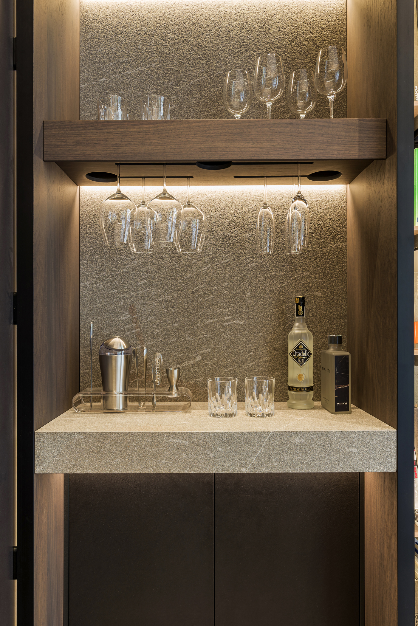L’intero progetto è definito da un’atmosfera avvolgente e sofisticata, costruita sul dialogo tra i toni caldi del legno e la matericità autentica della pietra, che insieme generano un linguaggio coerente e continuo. Il sistema di colonne Blade Edge interpreta questo equilibrio attraverso ante che combinano l’alluminio Bronze Dust con profili in Noce Cenere, creando un raffinato gioco di profondità e riflessi, ulteriormente enfatizzato dalle ante Ghost con finitura Groove.
