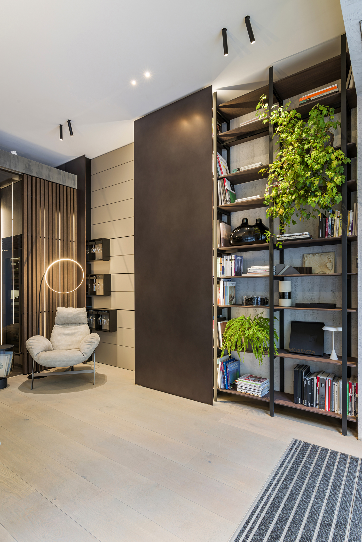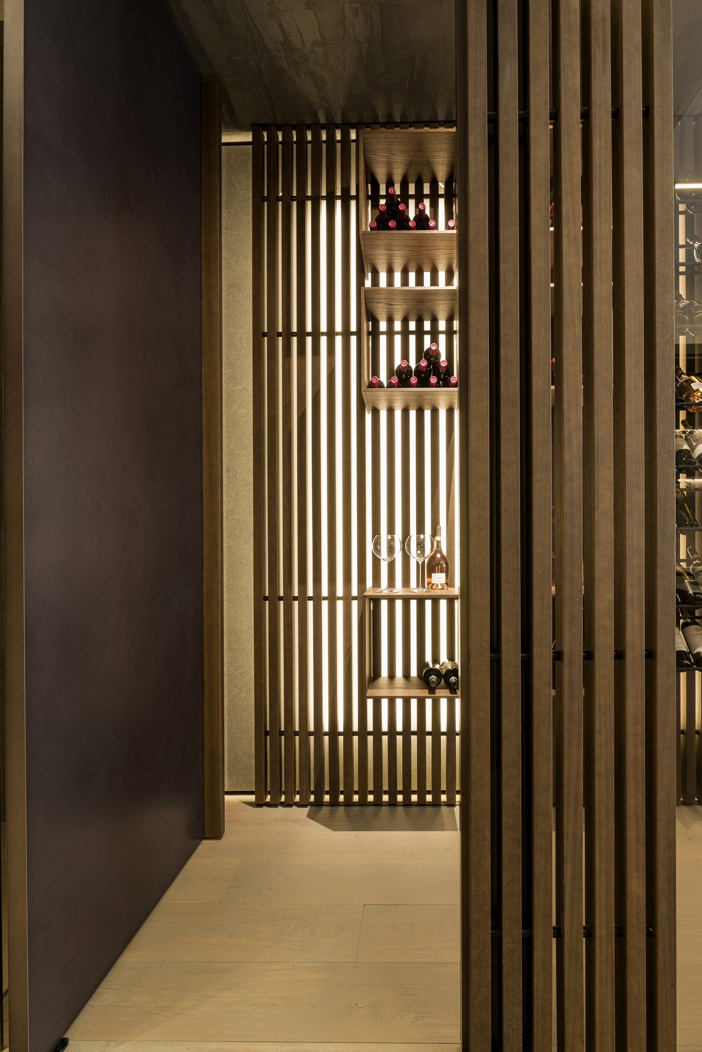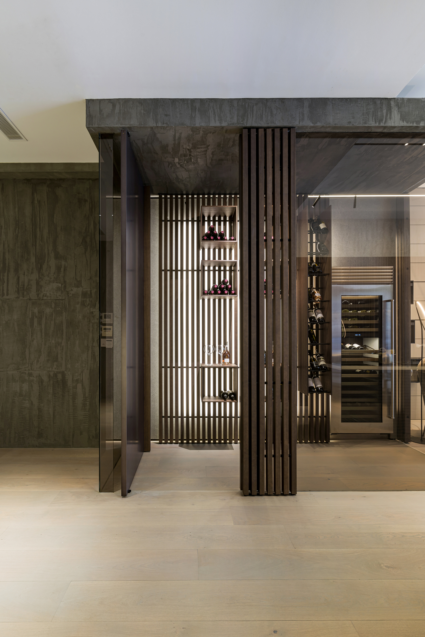 Elemento distintivo del progetto è il sistema cantina, concepito come esperienza spaziale: una porta a bilico introduce a un volume in vetro Bronze, dove il sistema Solid organizza lo spazio attraverso doghe in legno retroilluminato, elementi a giorno e una cella dedicata alla conservazione del vino. Un ambiente tecnico che si trasforma in elemento scenografico, in perfetto equilibrio tra funzione e rappresentazione.