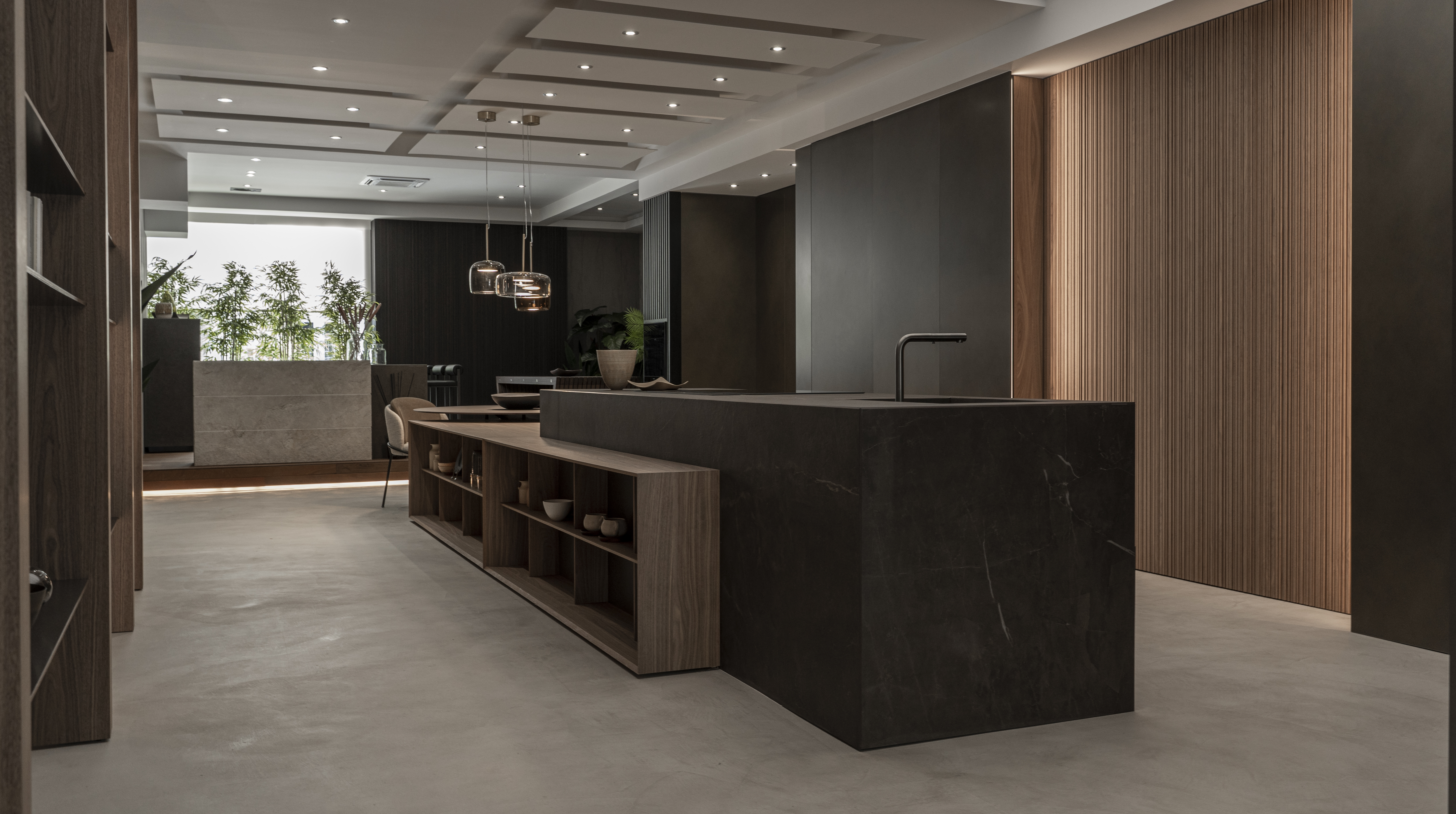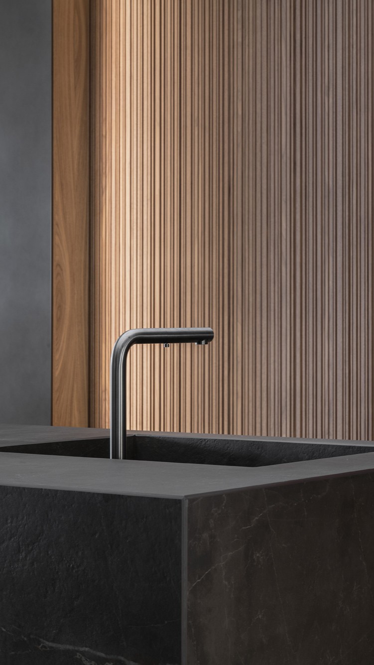 I materiali sono selezionati per le loro qualità estetiche e performative: pietre naturali dalle venature profonde, legni dalle texture autentiche e tattili, laccati opachi che restituiscono superfici continue e minimali, fino a metalli e finiture tecniche che introducono accenti contemporanei e raffinati. La lavorazione accurata esalta la matericità senza comprometterne la pulizia formale, creando un linguaggio coerente e sofisticato.