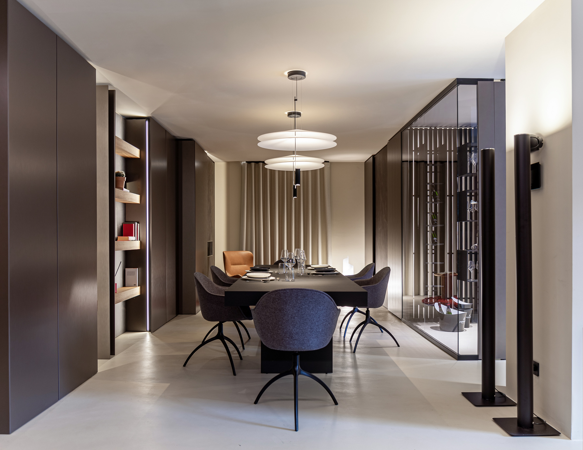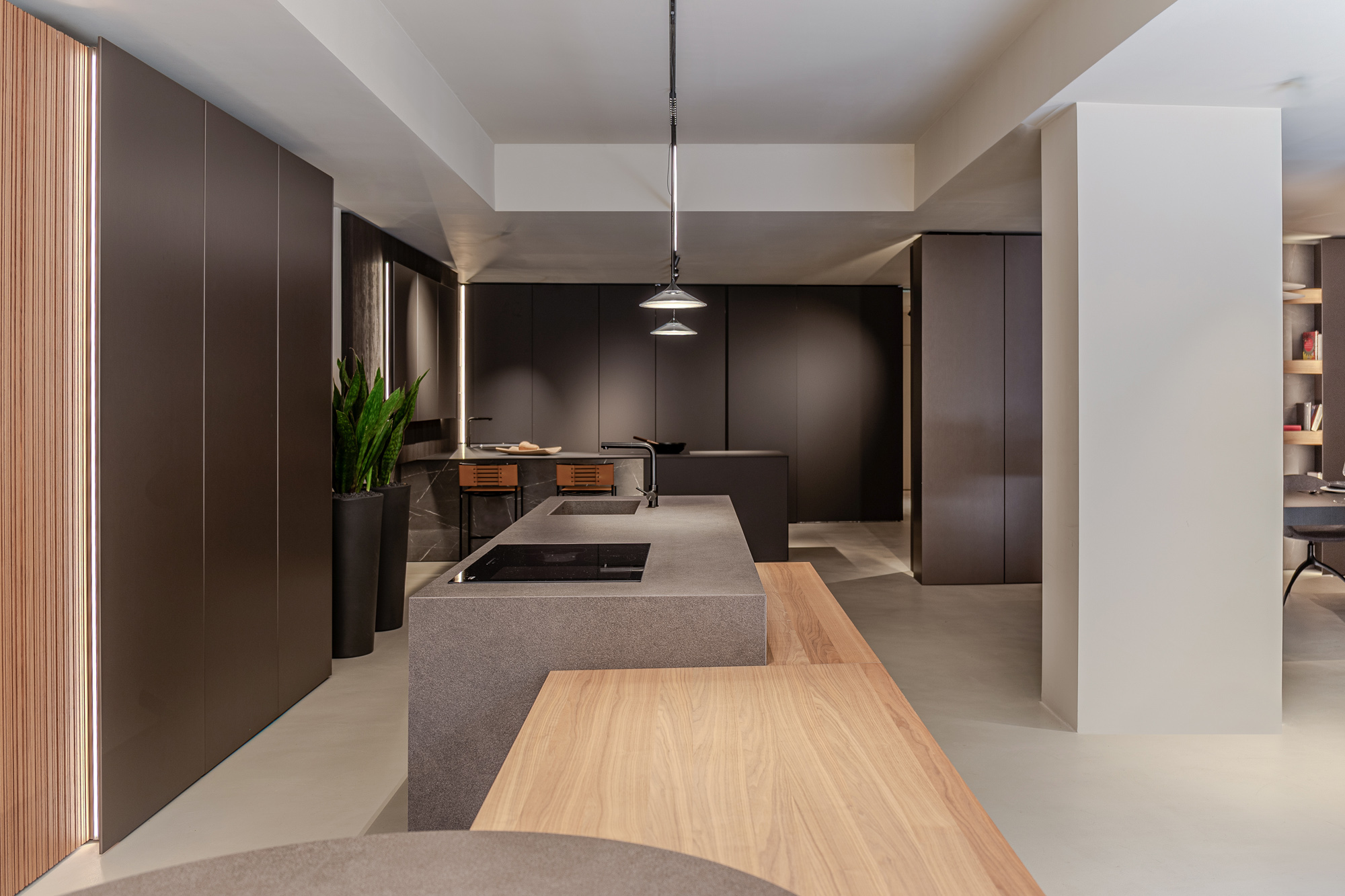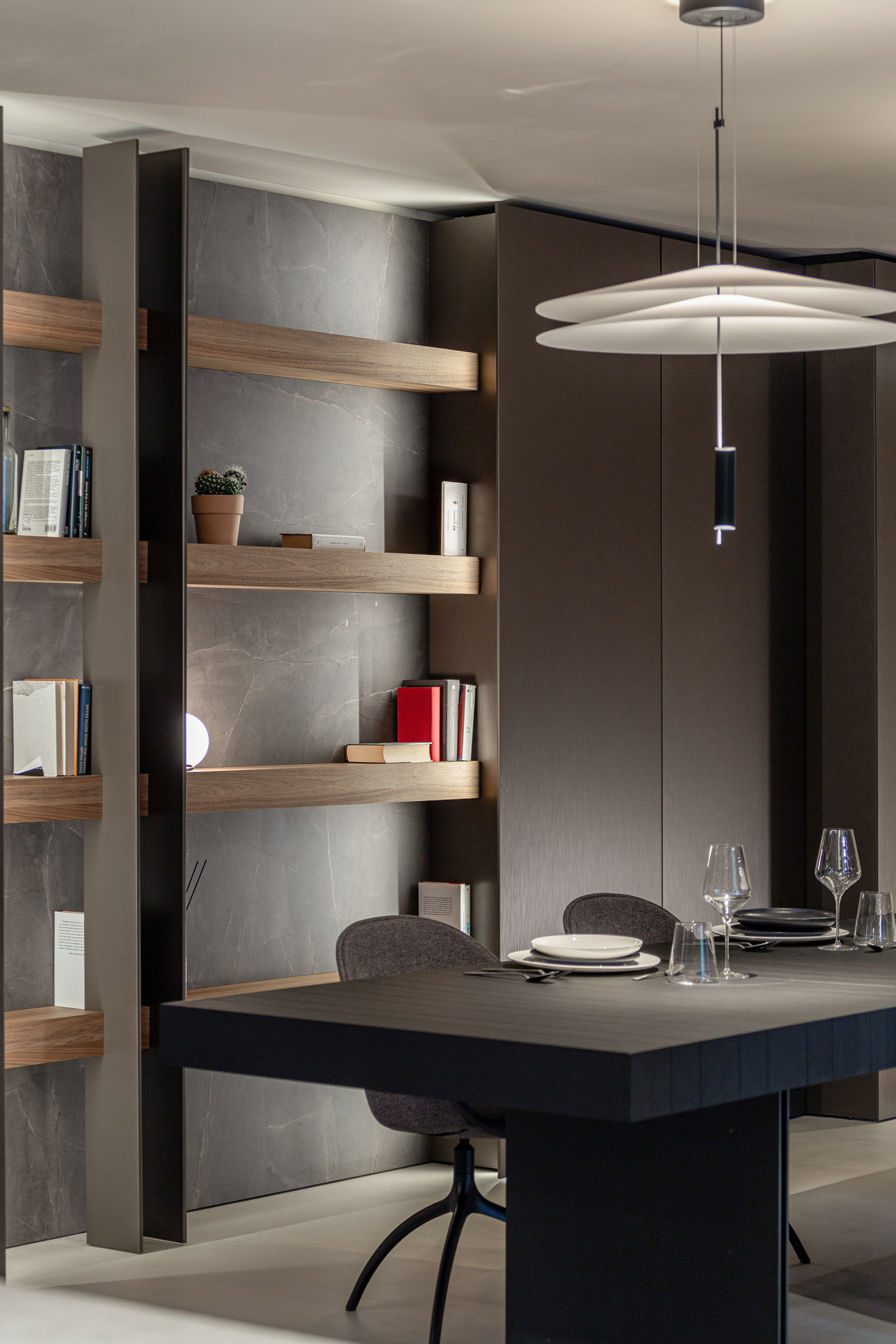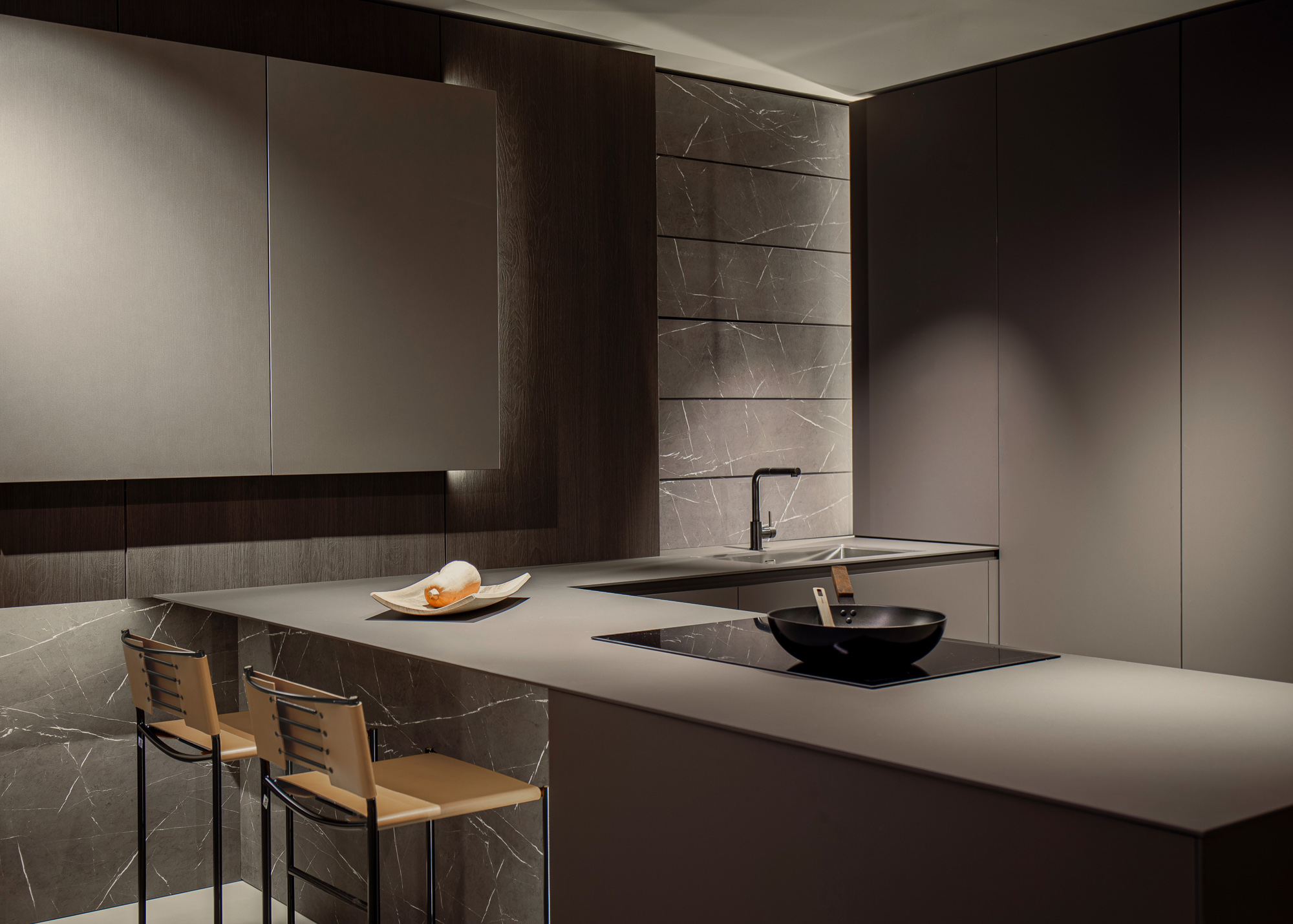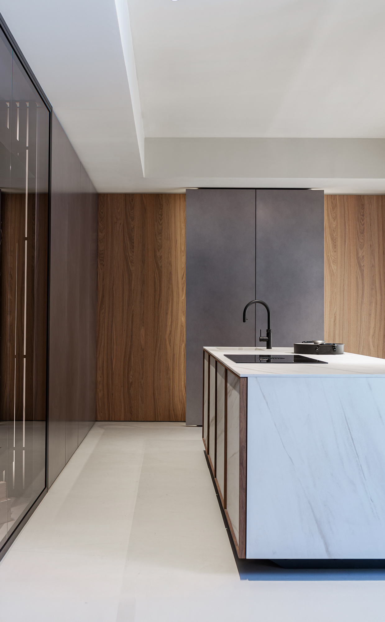 Ogni ambiente è concepito come una micro-architettura, dove cucina, living e bagno dialogano attraverso un linguaggio essenziale e rigoroso. La ricerca sui materiali — pietra, legni e superfici tecnologiche — definisce atmosfere sofisticate e avvolgenti, in cui il design si esprime attraverso equilibrio, proporzione e continuità.