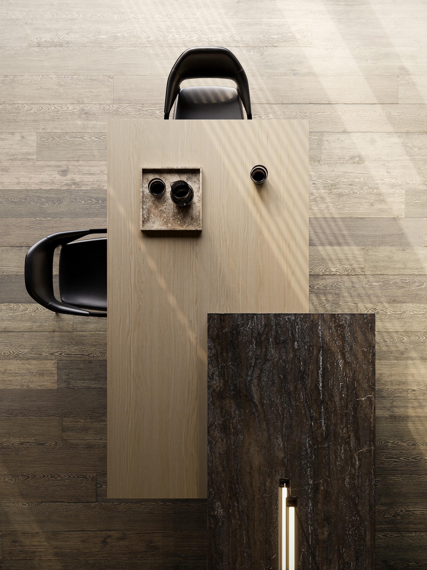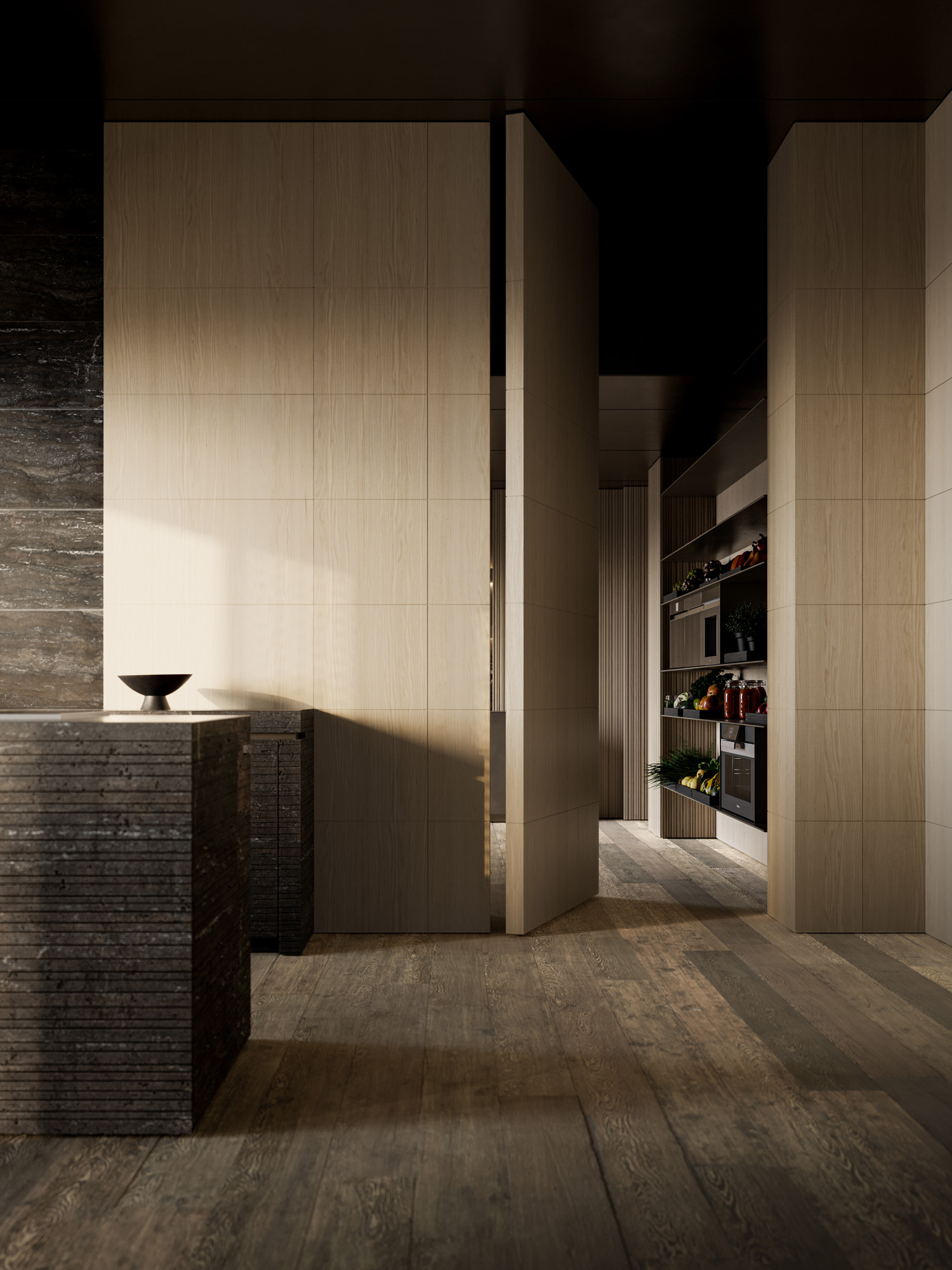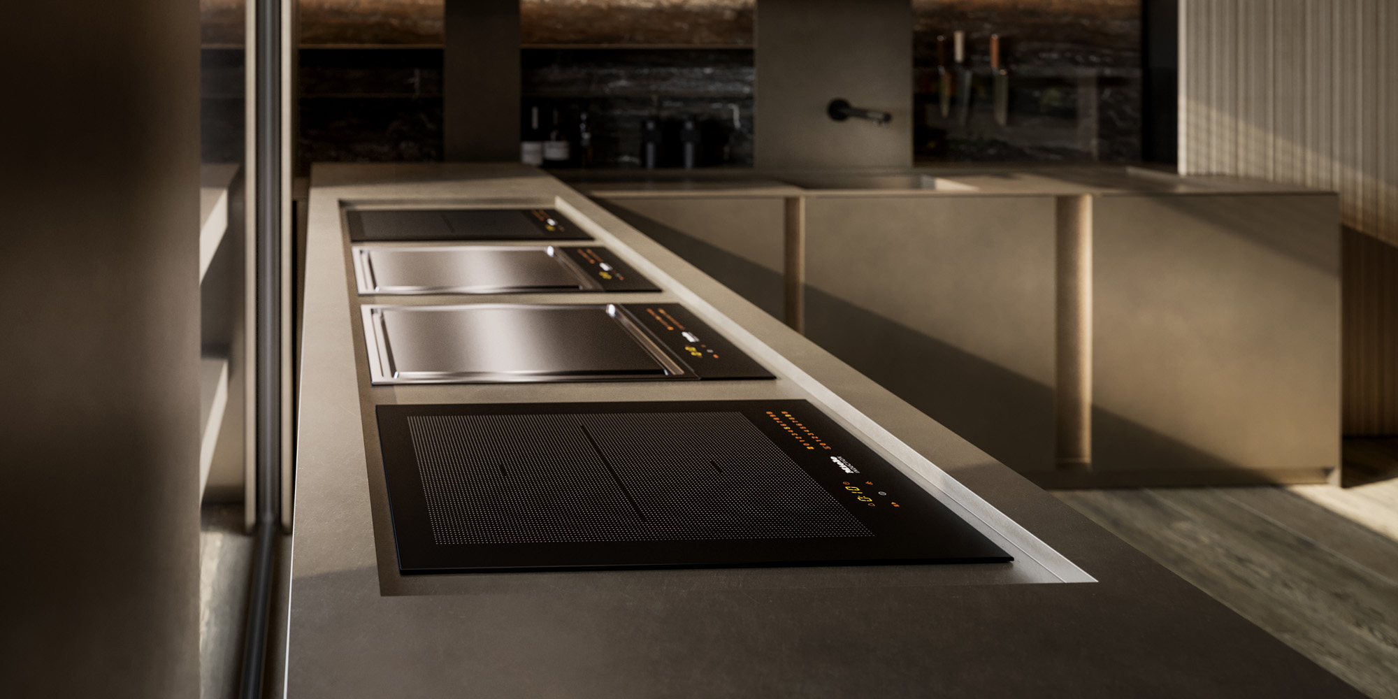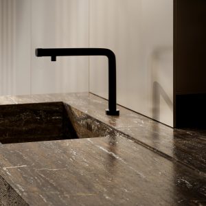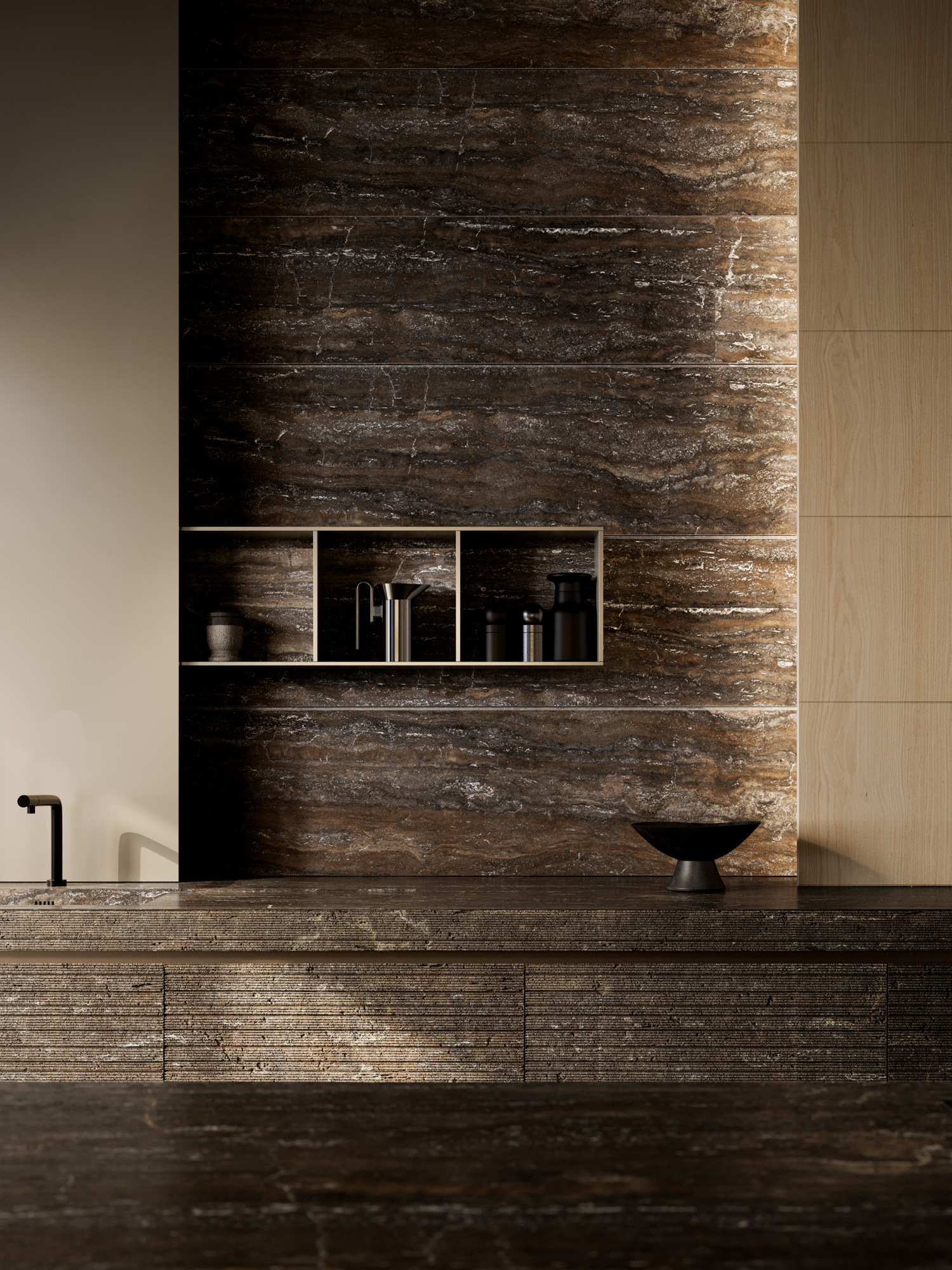 La continuità percorre gli ambienti, connette legni, metalli, vetri e pietre in una sequenza cromatica calibrata di superfici opache, riflettenti e stratificate.