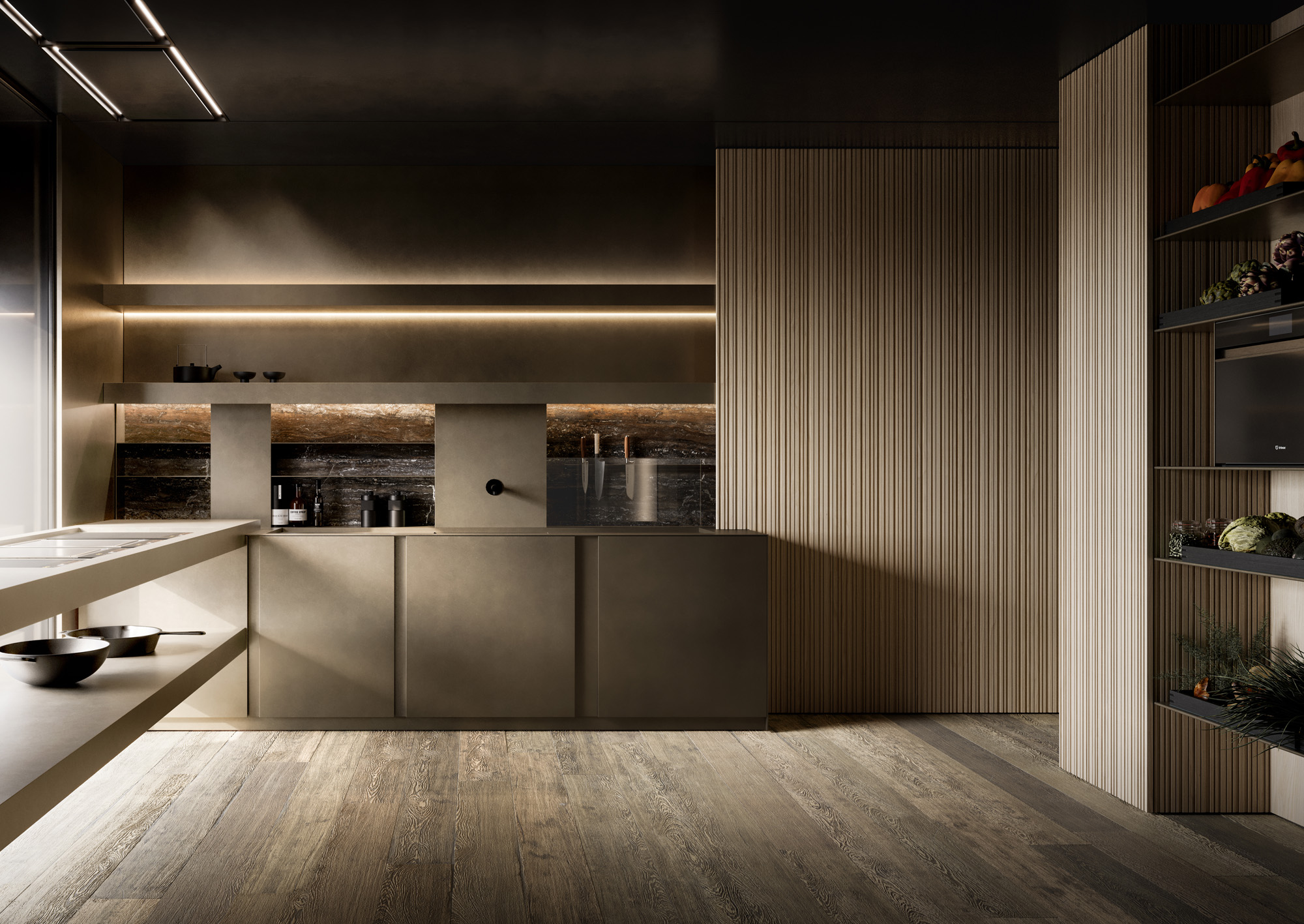Un luogo pensato per chi vive la cucina come gesto quotidiano e materia viva. La cucina prende forma attraverso il sistema Vertical e il programma Skill in Peltrox, dove l’acciaio si esprime tra superficie e profondità. La parete diventa strumento: mensole, forni, oggetti. Elementi esposti, pronti, accessibili. Una dispensa visiva che restituisce alla cucina il suo carattere più autentico.