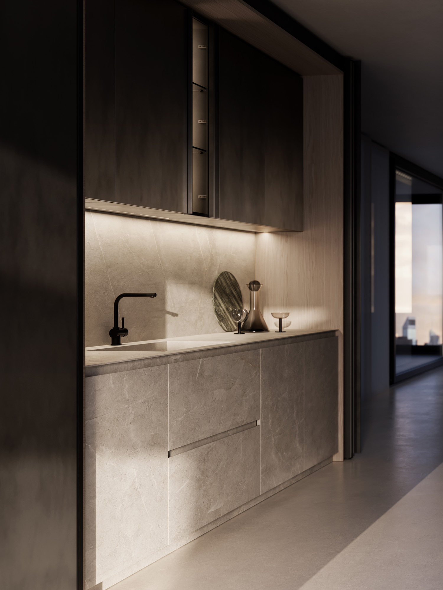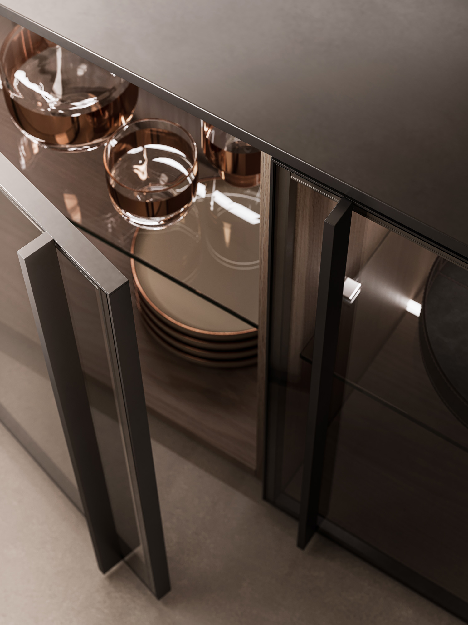 La continuazione dell’isola è definita da basi ribassate in laccato Metal Anthracite, con scocca interna in noce Brown e ante Glass, dove la superficie piena e trasparente, priva di profili, costruisce una continuità fluida tra pieni e vuoti. Il vetro come l’acqua, assorbe i riflessi e dissolve i confini, estendendo lo spazio in una percezione più profonda e silenziosa.