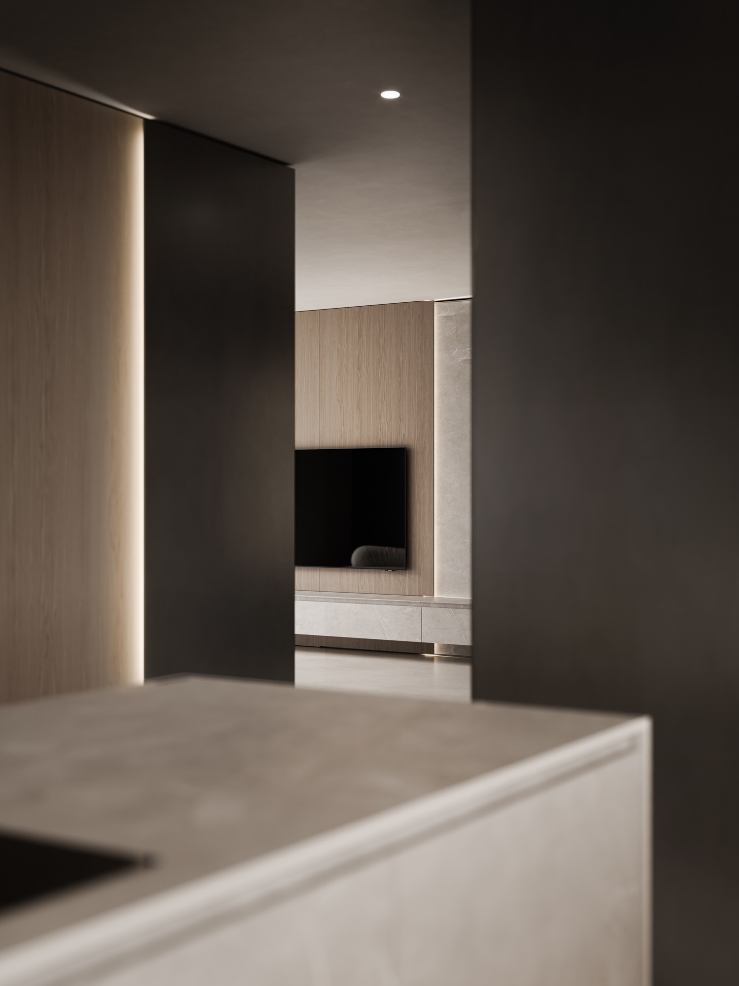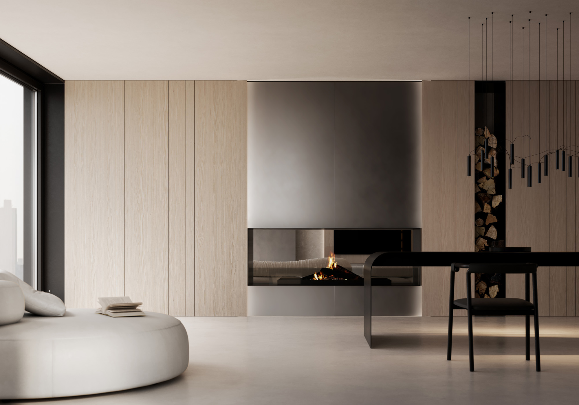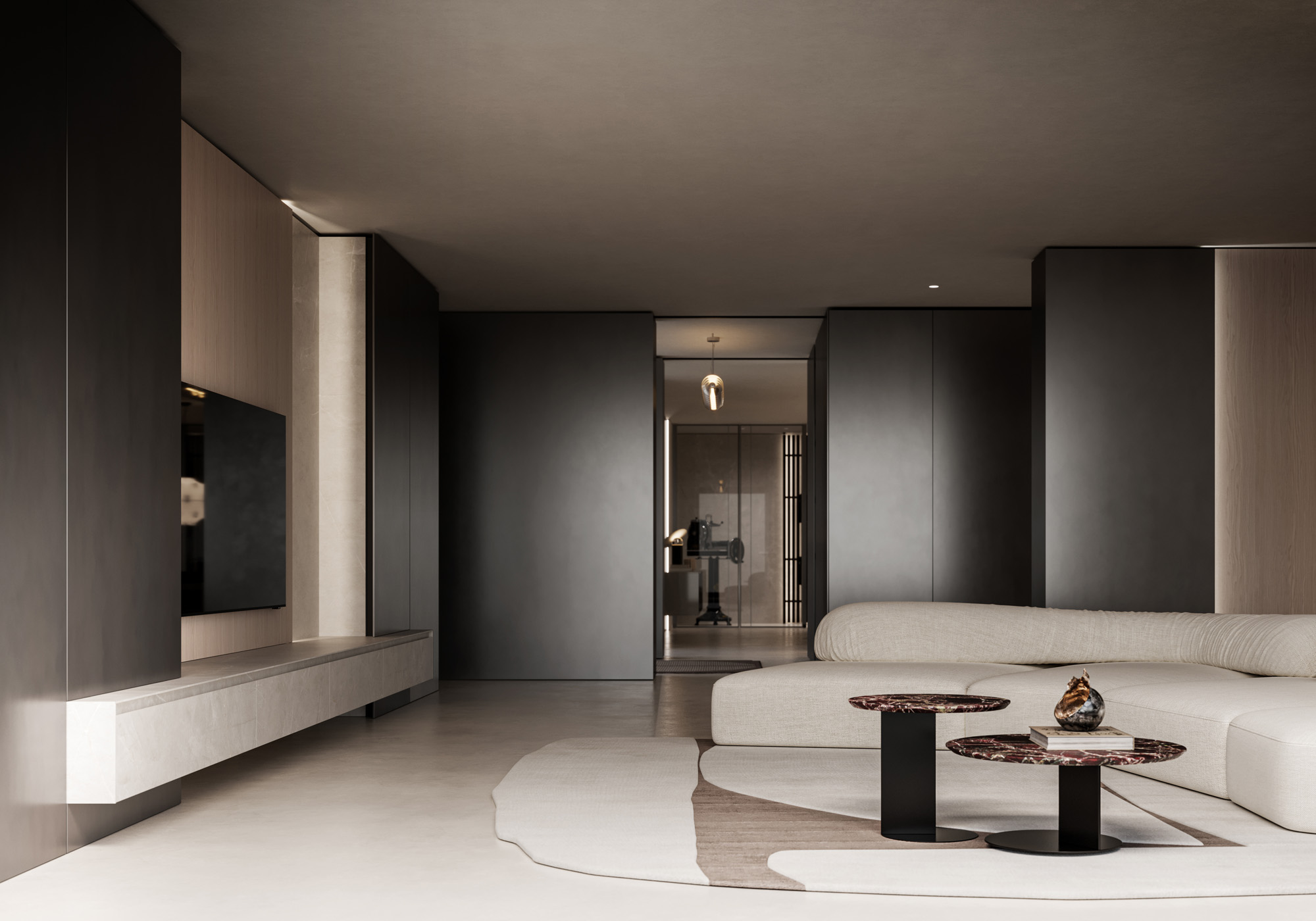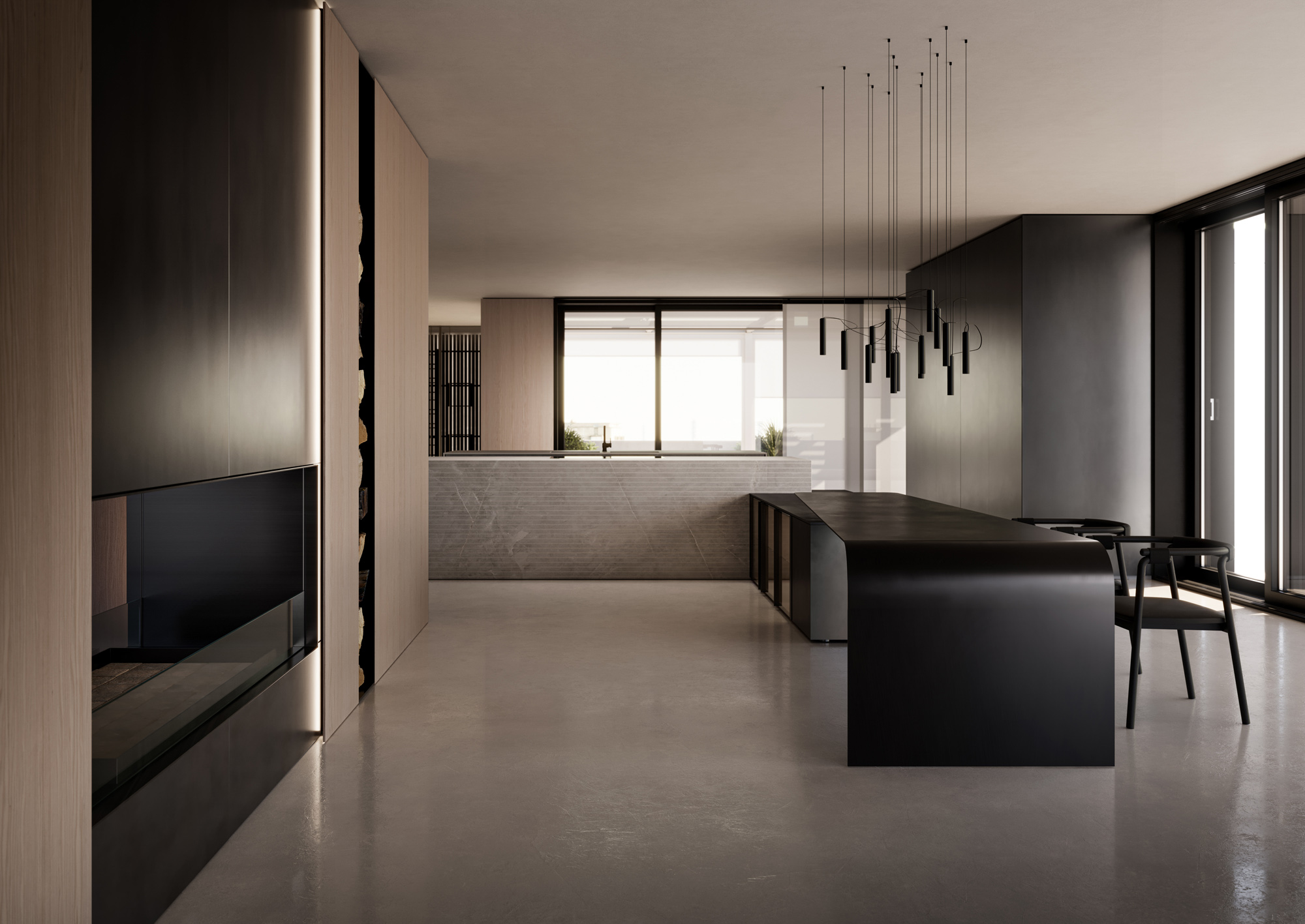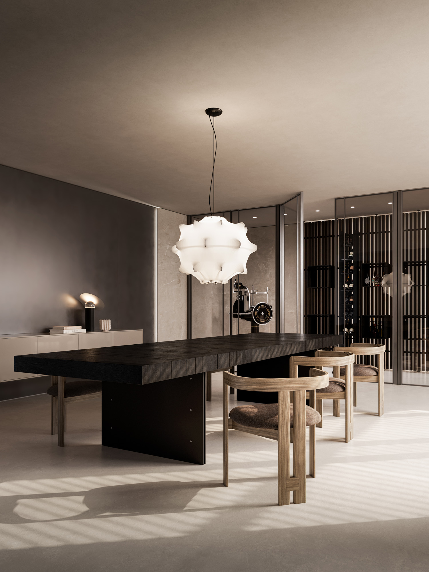 La luce scorre radente lungo la materia, ne rivela la tridimensionalità e definisce l’atmosfera. L’ambiente si trasforma in un’esperienza percettiva, dove design materia e luce costruiscono una dimensione emozionale.