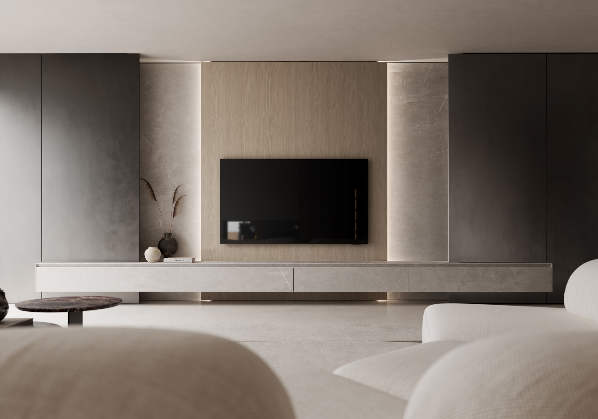 Le tonalità si accordano in un equilibrio caldo e misurato, dove il gres nei toni sabbia, il legno chiaro e le superfici neutre costruiscono una continuità che attraversa il living.