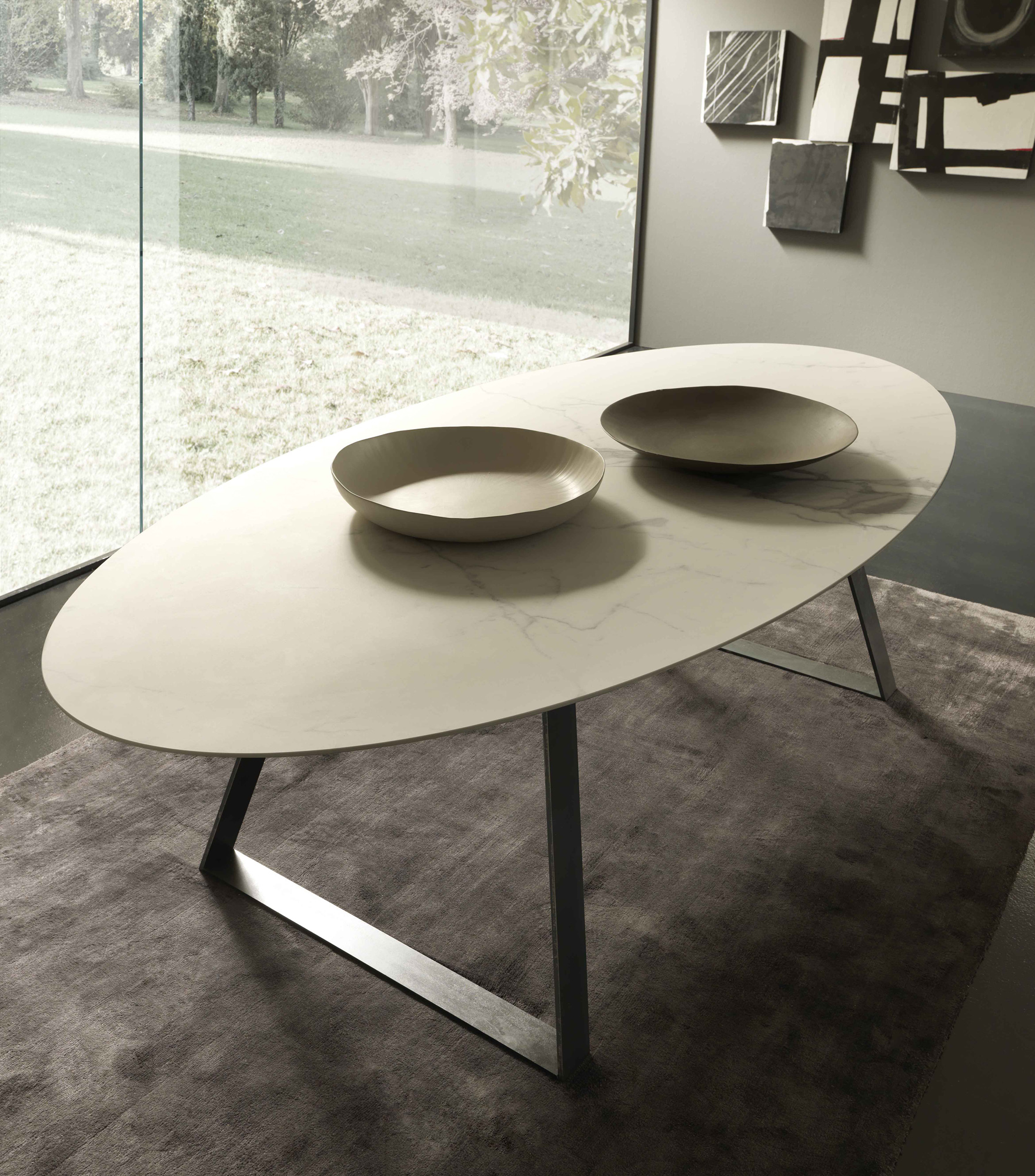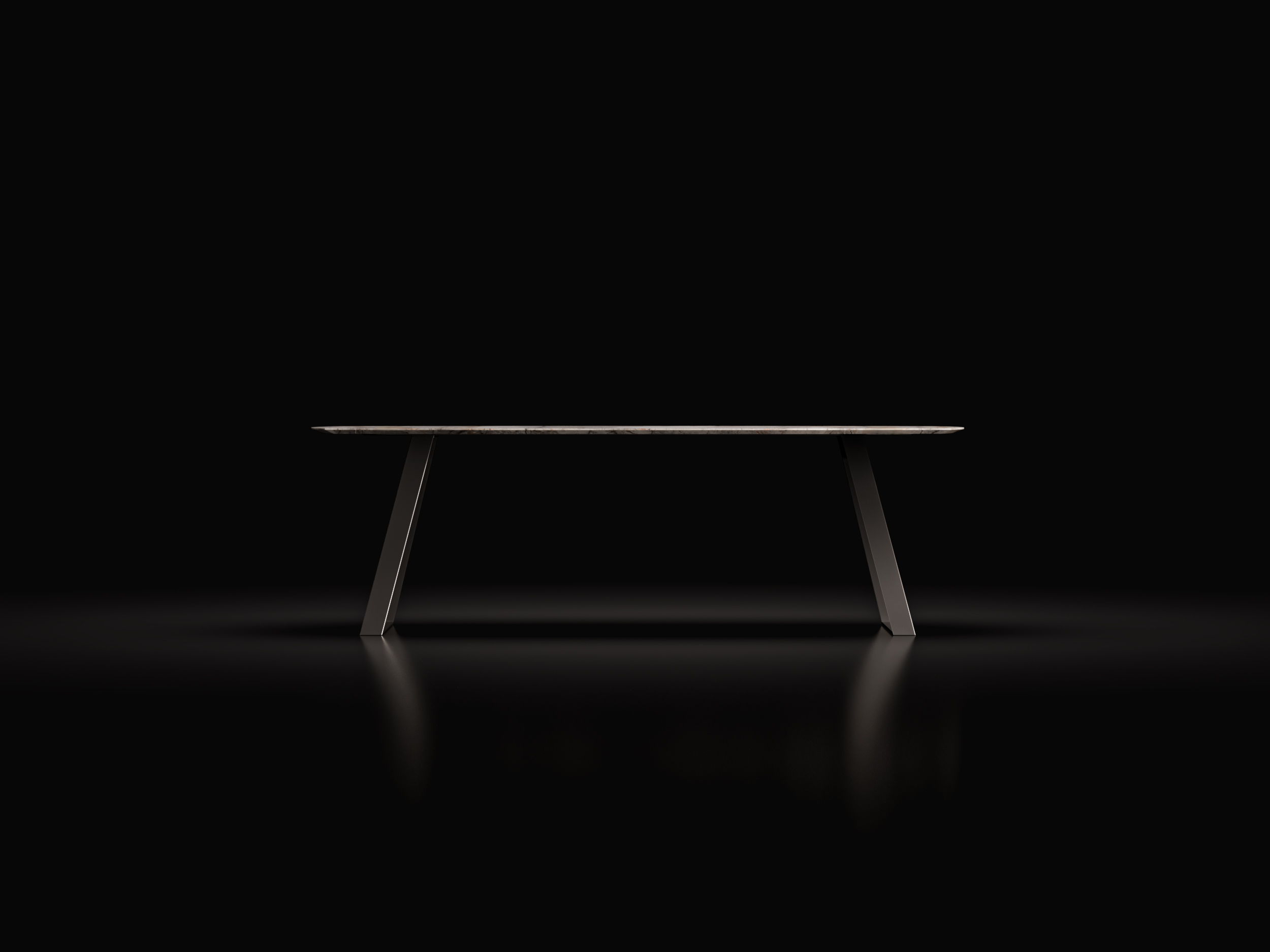 Il tavolo Blade è disponibile con piano rotondo, quadrato, ovale, rettangolare e nella versione Boat. Il piano può essere realizzato in gres, marmo, pietra o granito, mentre la struttura è proposta in metallo verniciato nero.