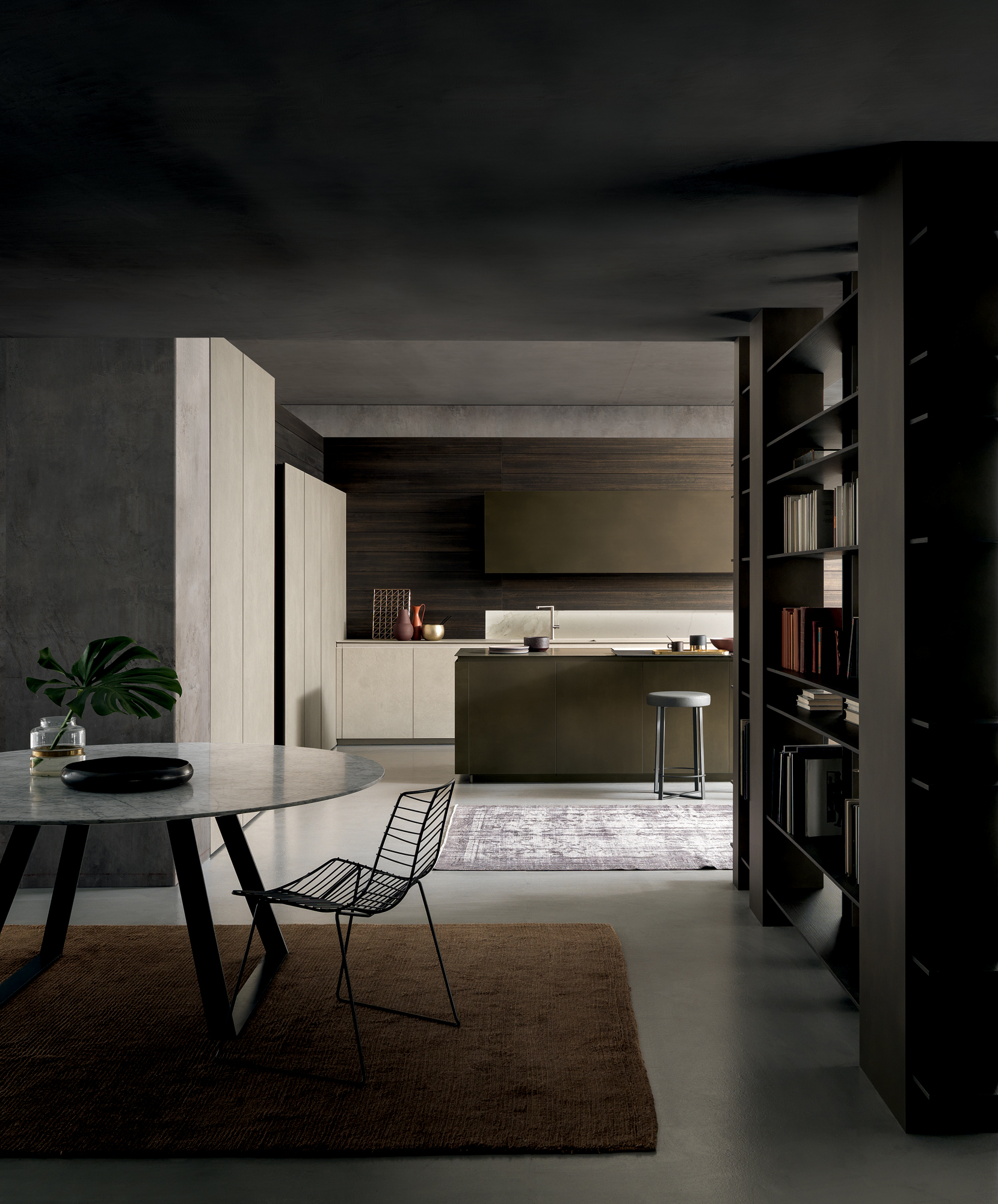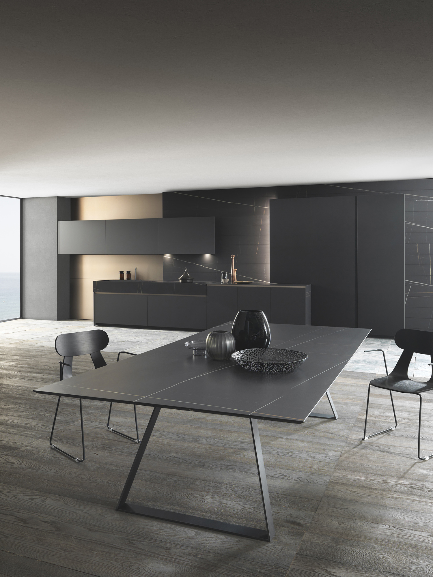 Il basamento in metallo rimane invariato, mentre il piano è personalizzabile in gres e marmi Modulnova, mantenendo la stessa libertà materica del progetto.