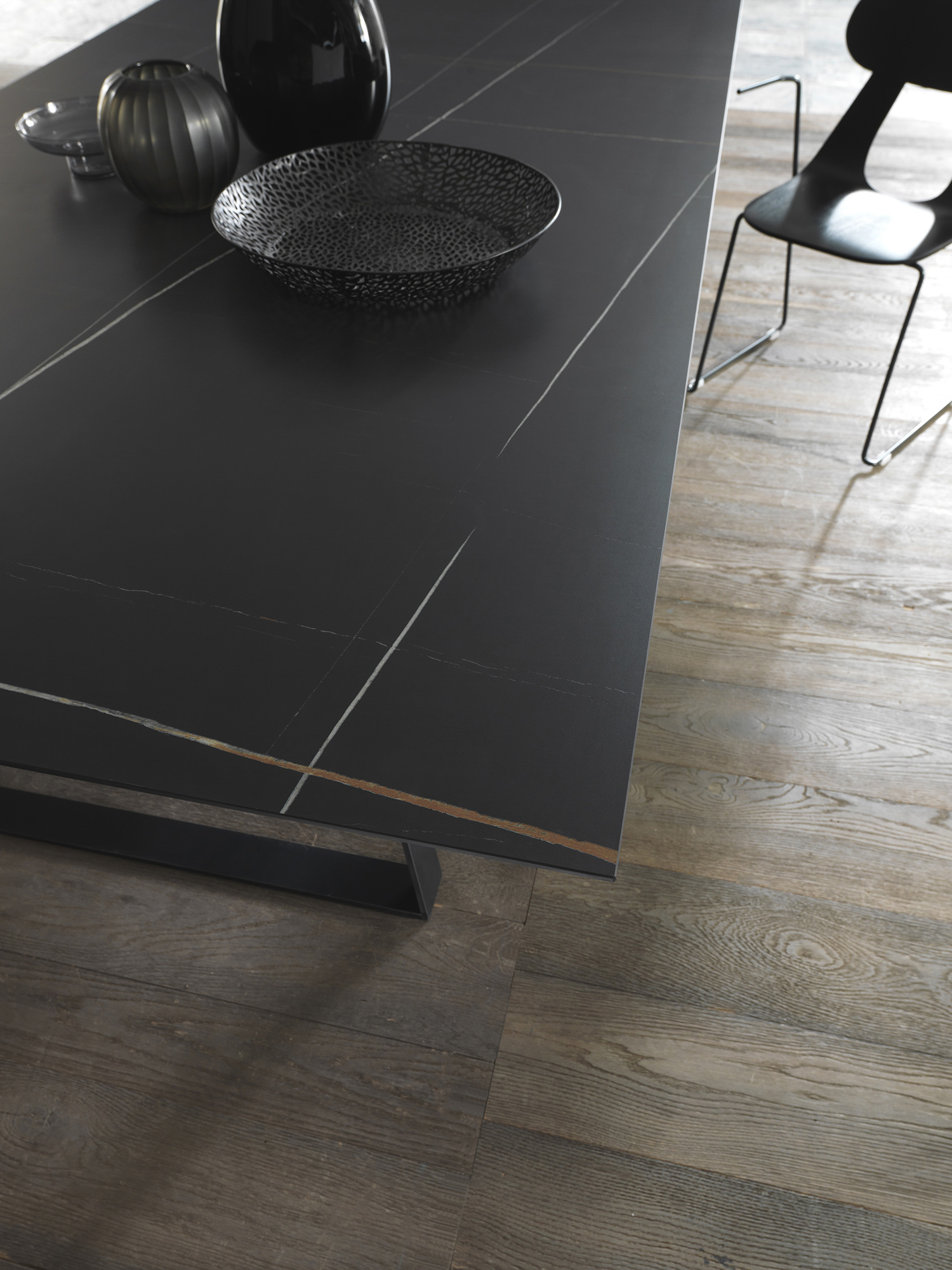 I piani del tavolo Blade sono disponibili in gres sp. 1,4 cm e in marmo, granito e pietra sp. 2 cm.