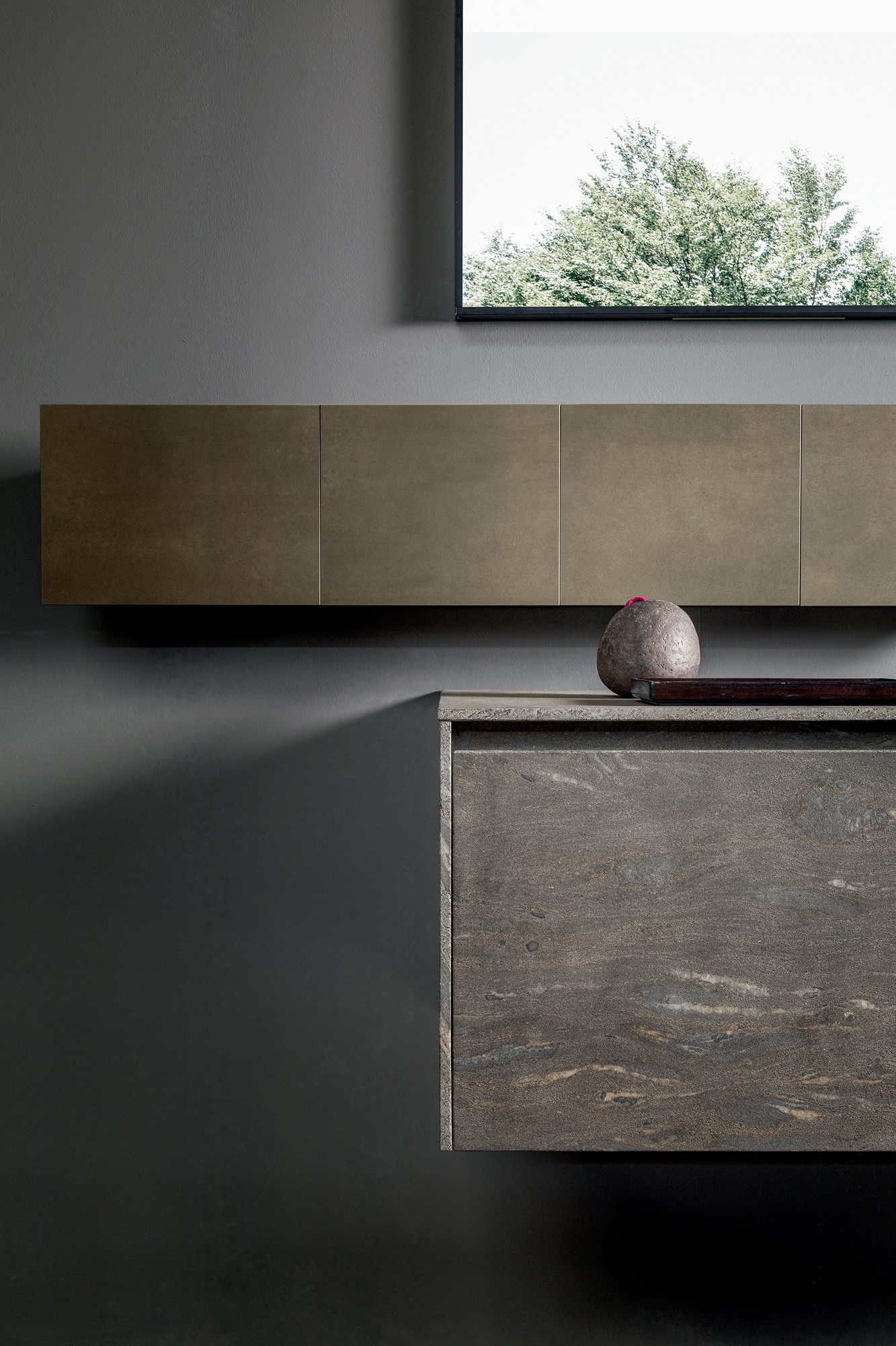 Il programma Blade Lab comprende basi con frontali in pietra, marmo o granito naturale dello spessore di 1,5 cm. La struttura dell’anta, con corpo interno in alveolare di alluminio o fibra di vetro, unisce solidità e leggerezza.