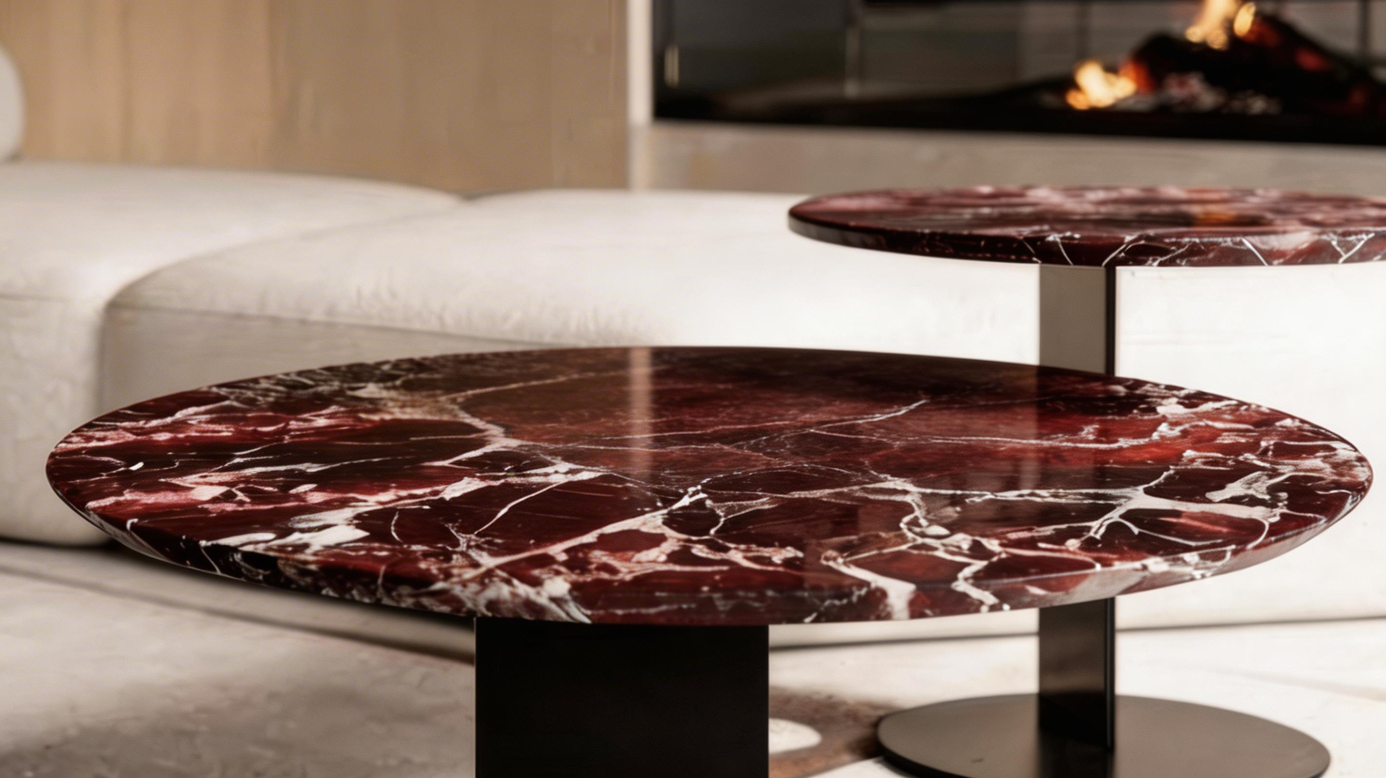 Configurabili in diversi materiali, altezze e diametri, sono definiti da un piano in pietra o gres e da un basamento strutturale in ferro trasparente pigmentato nero.