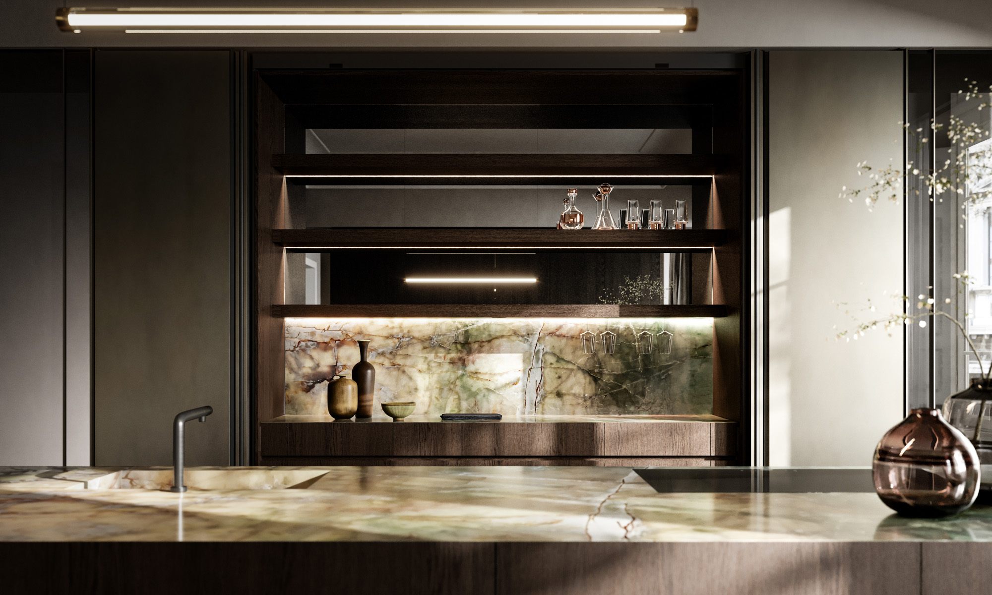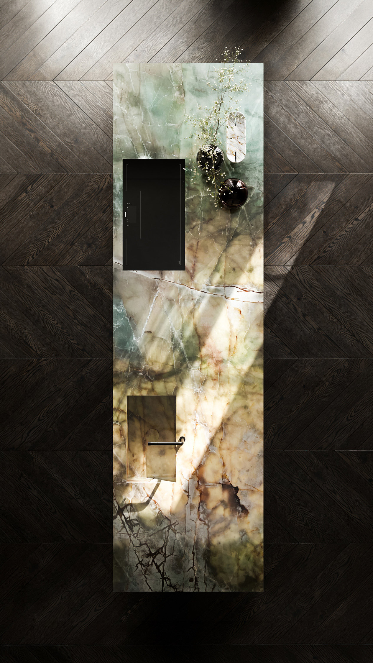 Lo spessore scompare, definendo una presenza pura. La quarzite Aqua Light e il legno Rovere Caffè instaurano un dialogo naturale e profondo che dà forma a un volume prezioso, attraversato da contrasti di temperatura, luce e materia.