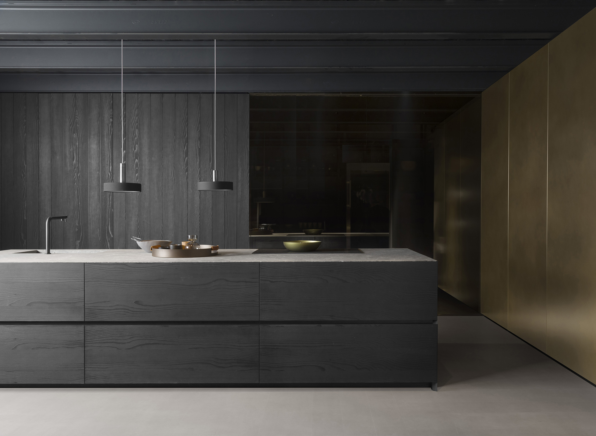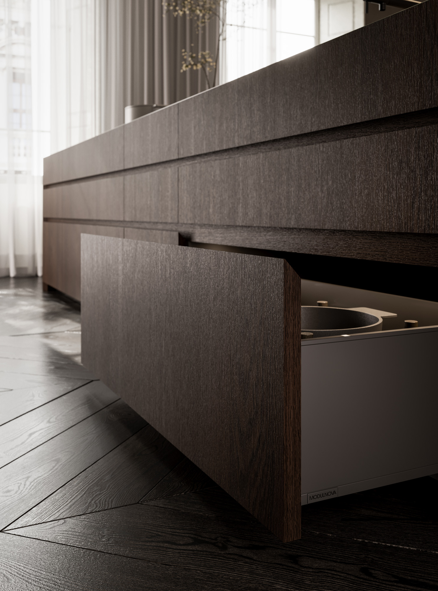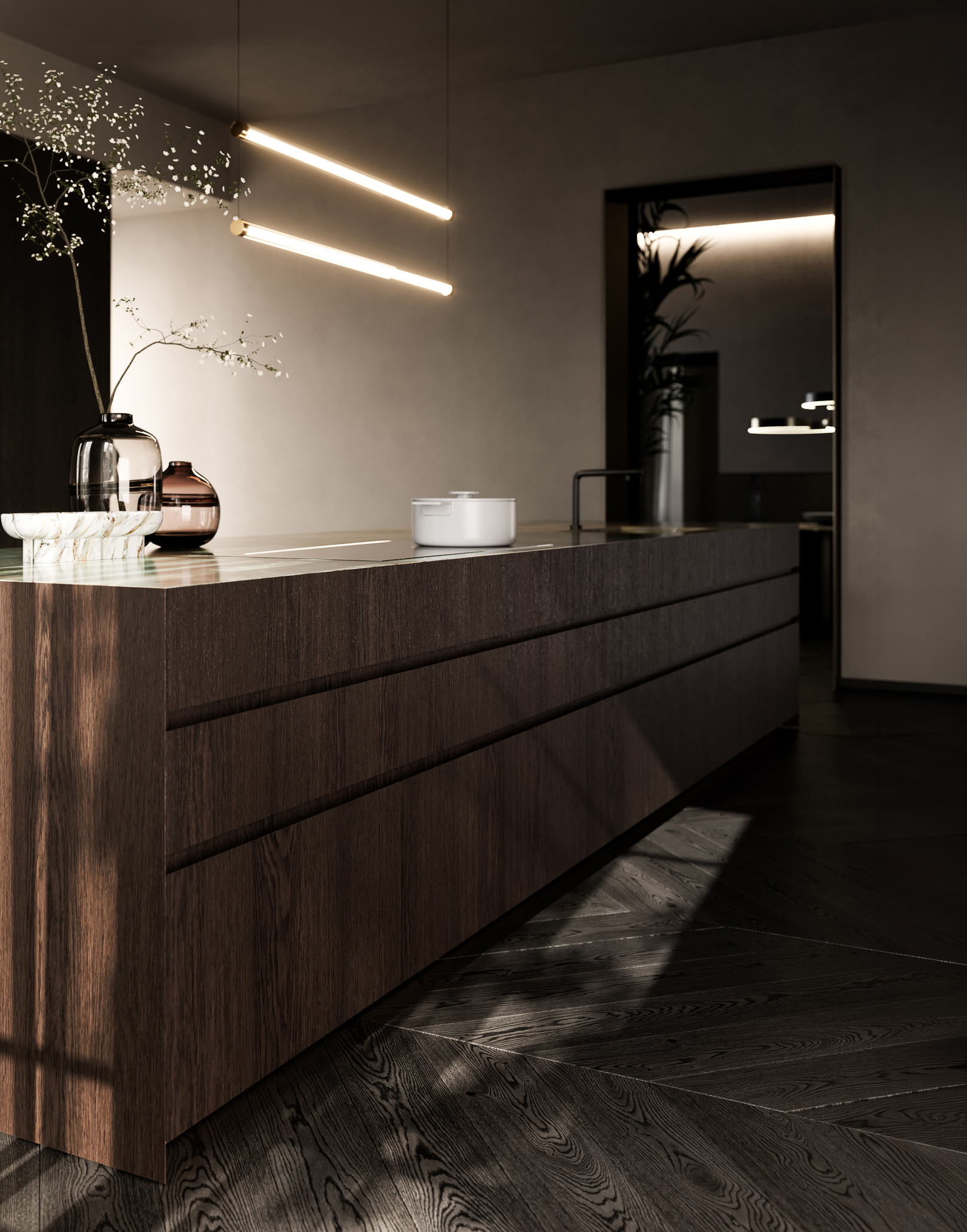 La configurazione monolitica di Fly nasce dall’incontro tra innovazione e ricerca di un minimalismo che esalta la purezza della forma. I bordi a 45° consentono l’apertura di ante e cassetti senza creare spessori visibili, lasciando emergere con forza il volume dell’isola, qui rivestita in legno Rovere Caffè.