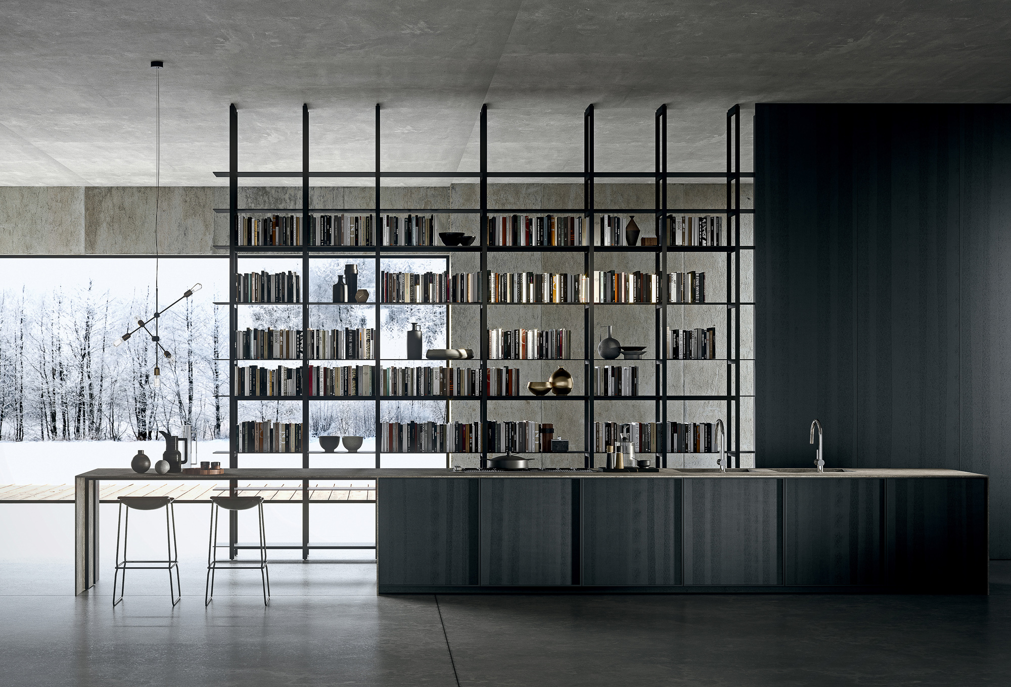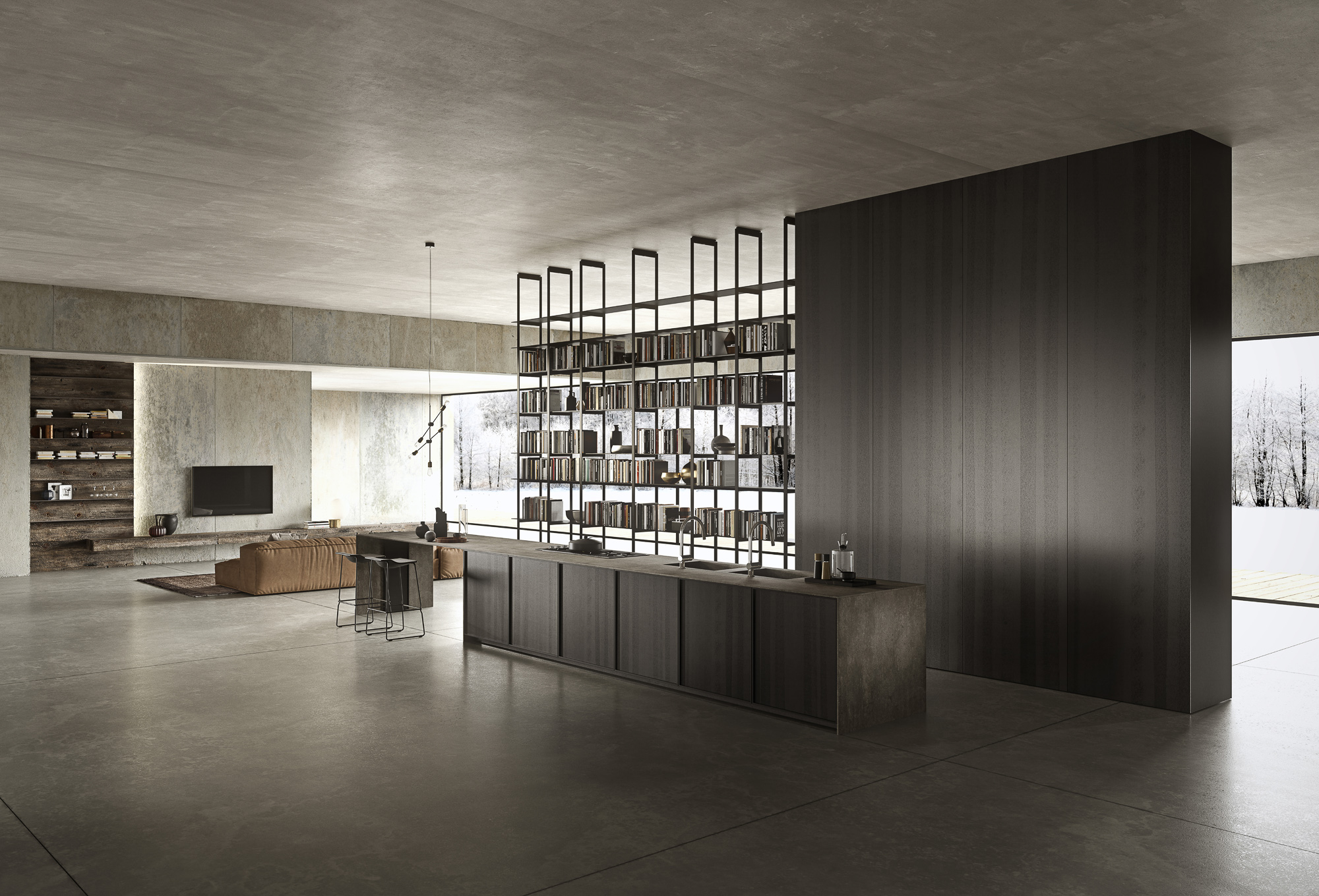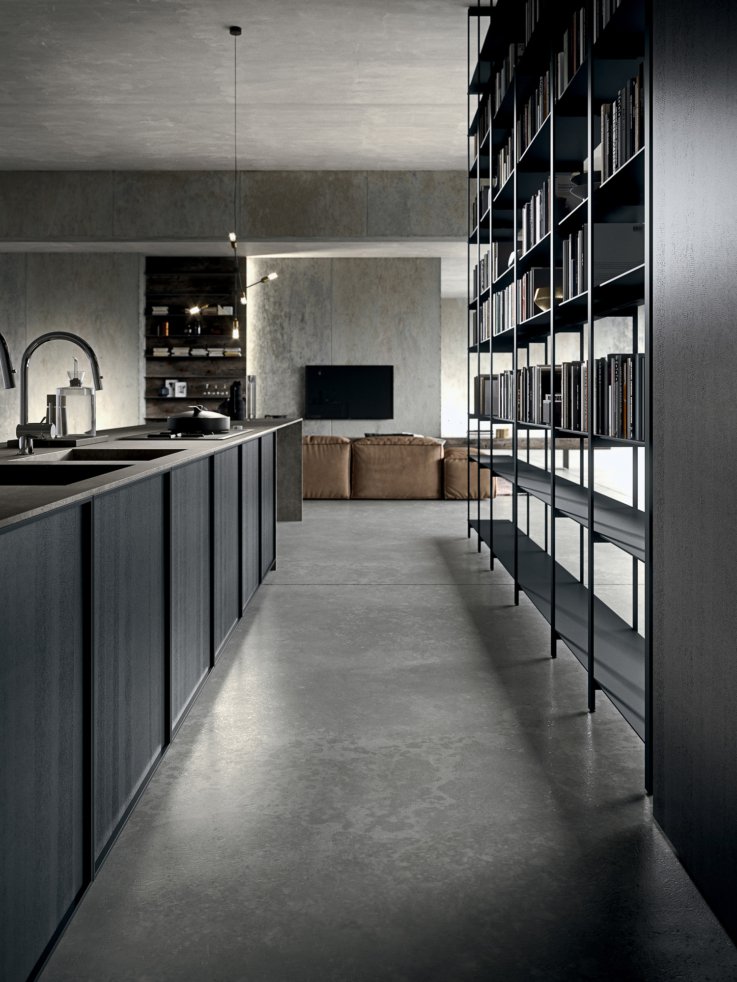 Atmosfere industriali riproposte in un unico grande ambiente cucina living. La grande libreria contrasta con il volume pieno delle colonne lasciando filtrare raggi di luce che caratterizzano l’intero progetto.